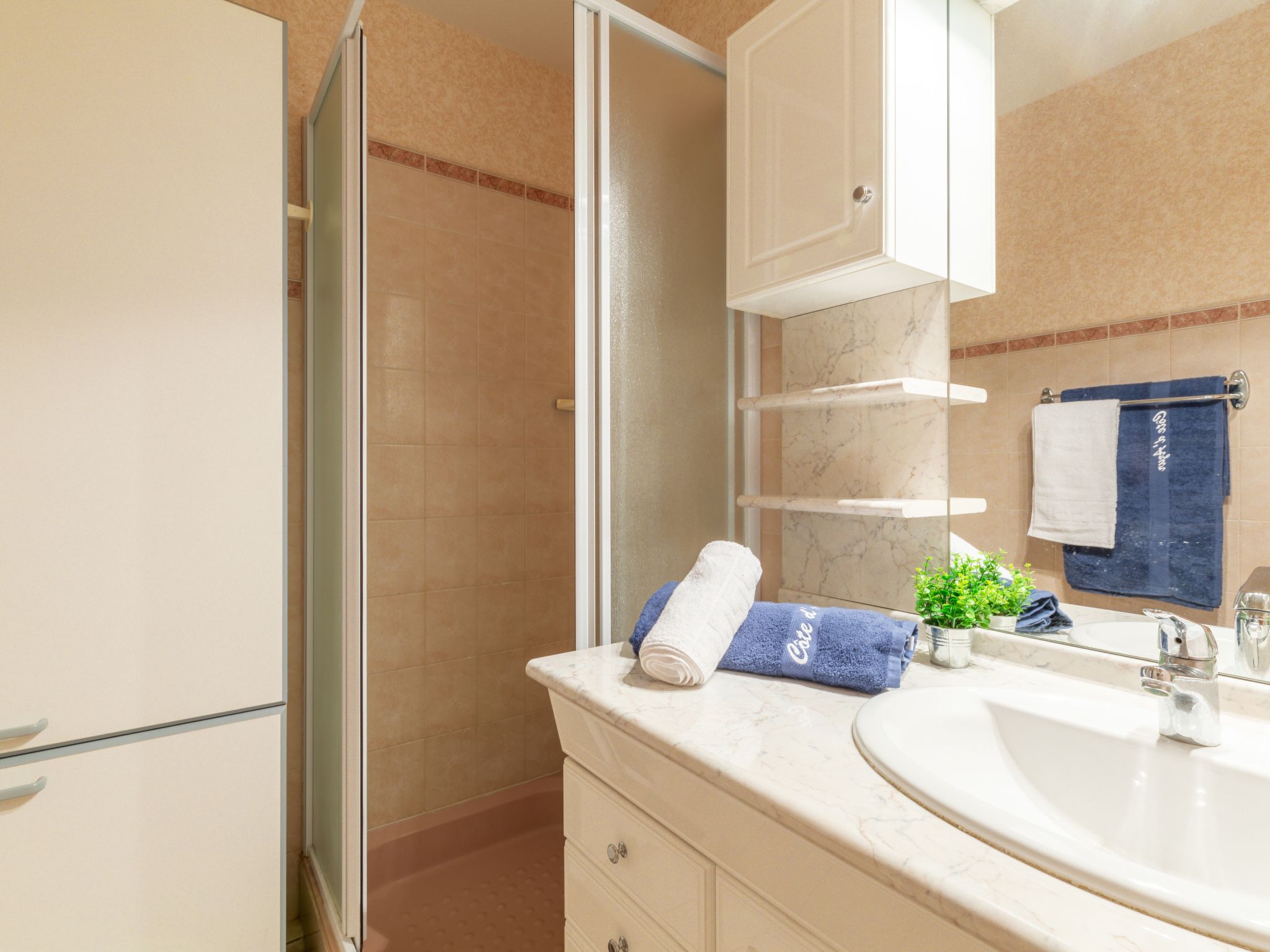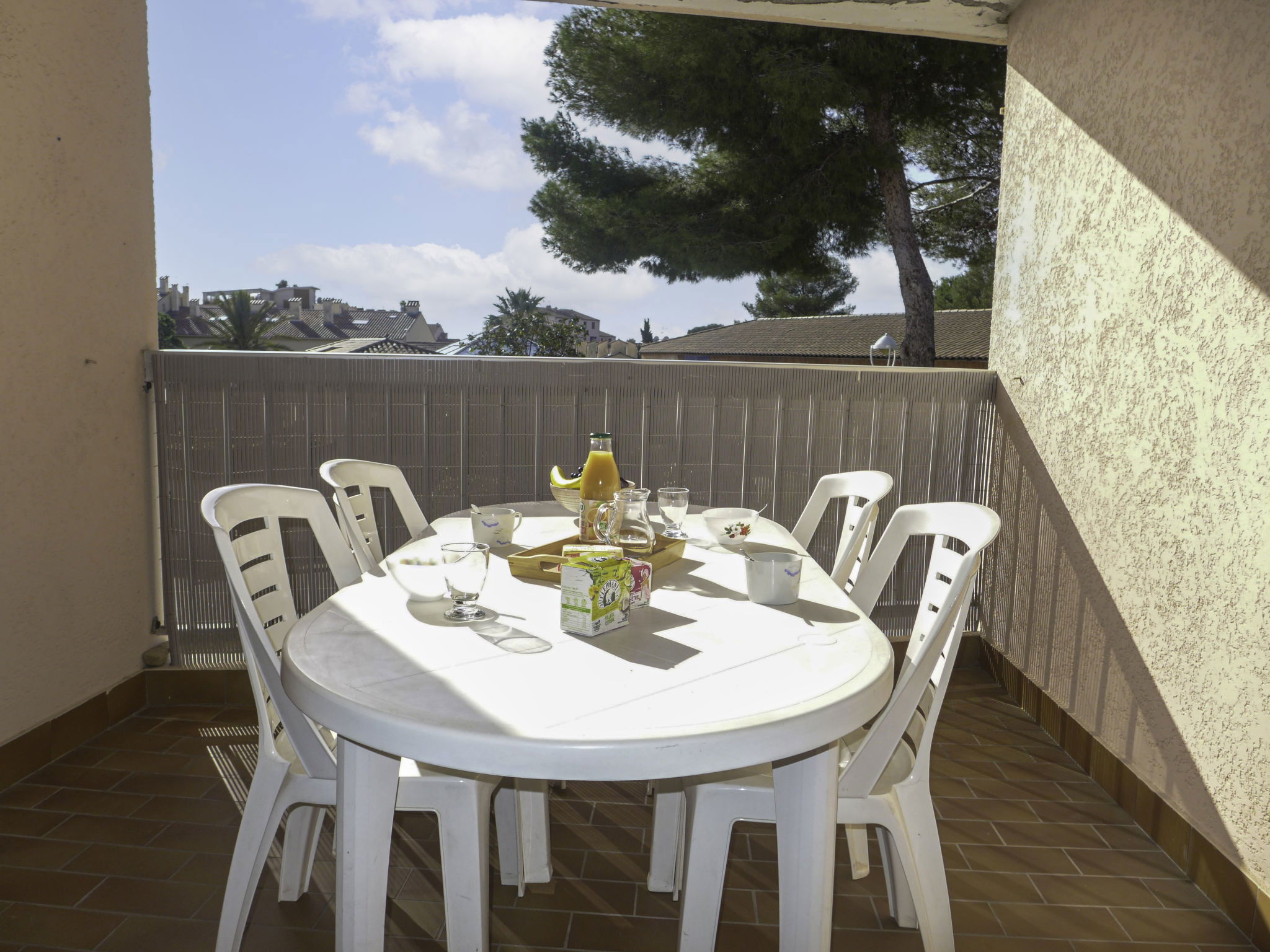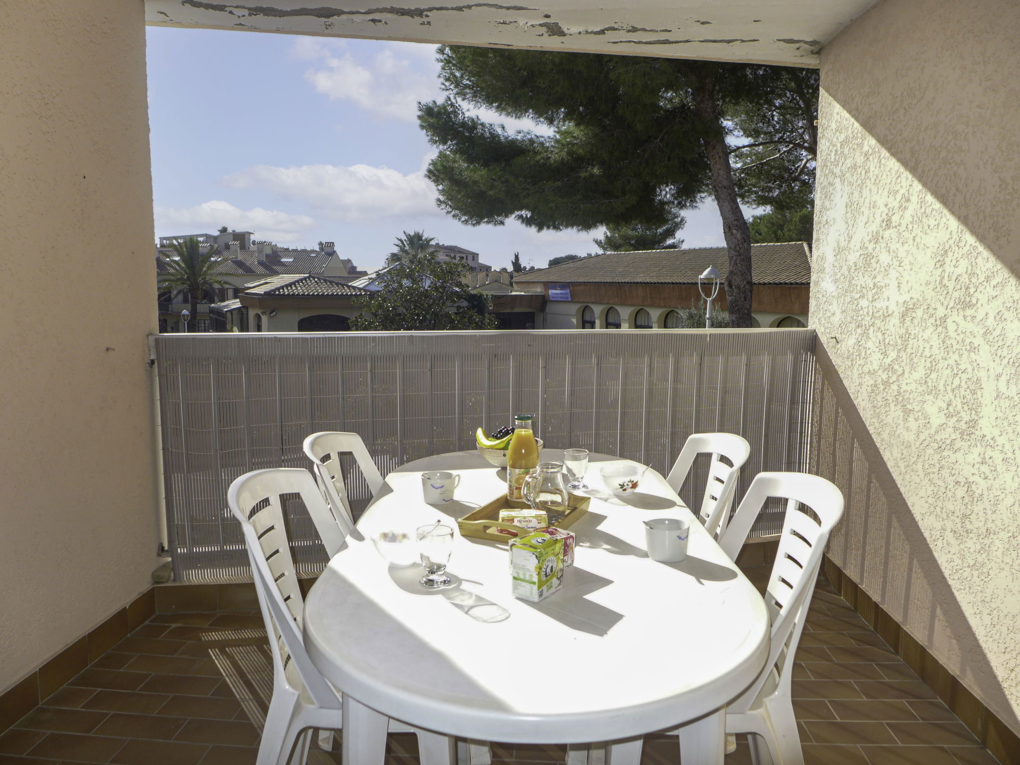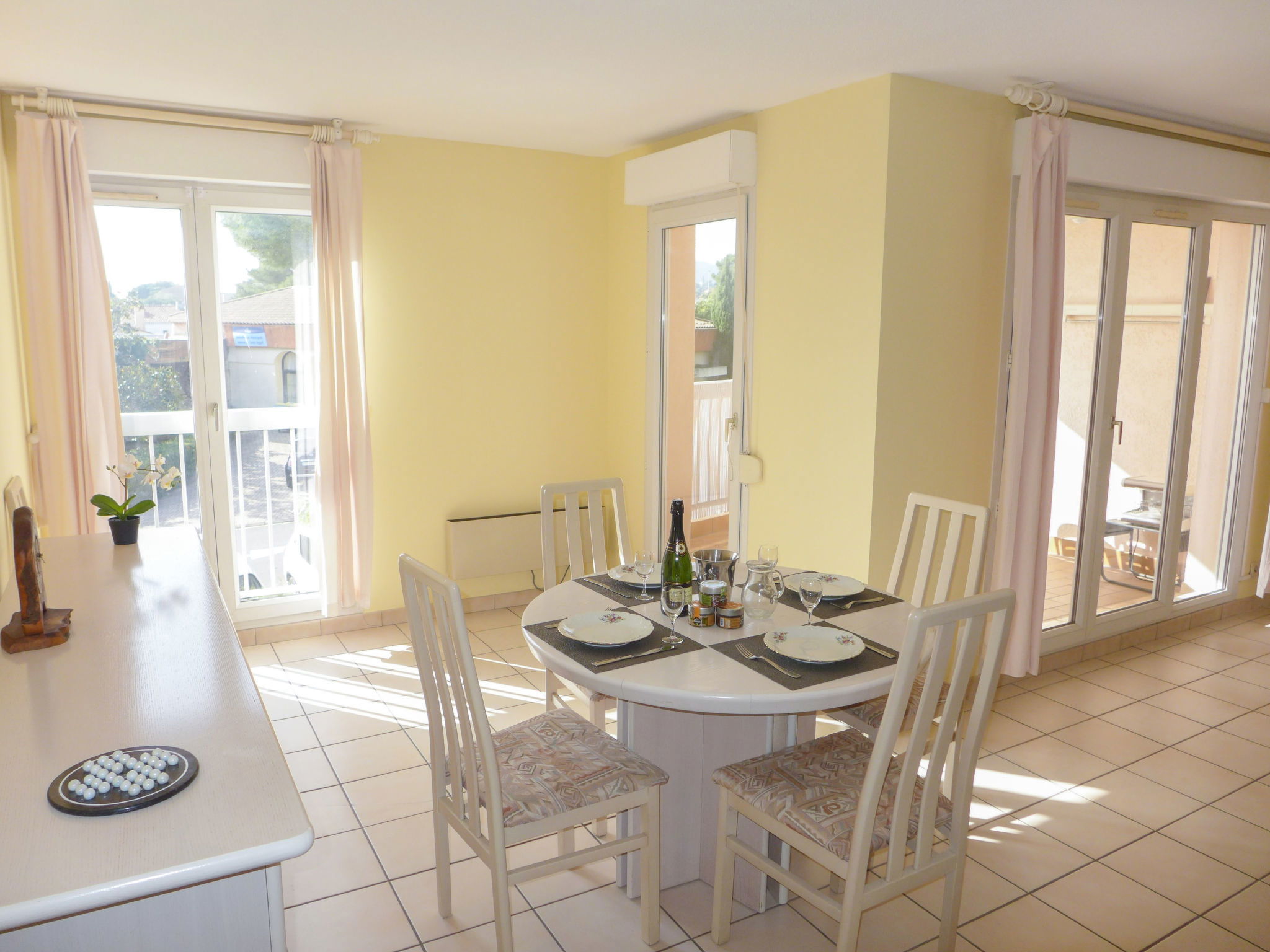 "La Résidence Timothée", 2-room apartment 54 m2 on 2nd floor, south-west facing position. Comfortable furnishings: living/dining room with panoramic window Dressing room with 1 double sofabed (140 cm, length 190 cm), dining table and TV (flat screen), heating stove, fan and electric shutters. 1 room with Dressing room with 1 french bed (160 cm, length 200 cm), TV and fan. Kitchen 10 m2 (4 hot plates, toaster, kettle, microwave, freezer, electric coffee machine) with small dining table. Shower, sep. WC. Heating. Terrace 12 m2 partly roofed, west facing position. Balcony furniture, electric barbecue. Partial view of the sea. Facilities: washing machine, iron, hair dryer. Internet (WiFi, extra). Garage space n 10 (1 car), height 185 cm. Please note: non-smokers only. 1 pet/ dog allowed. Smoke alarm.