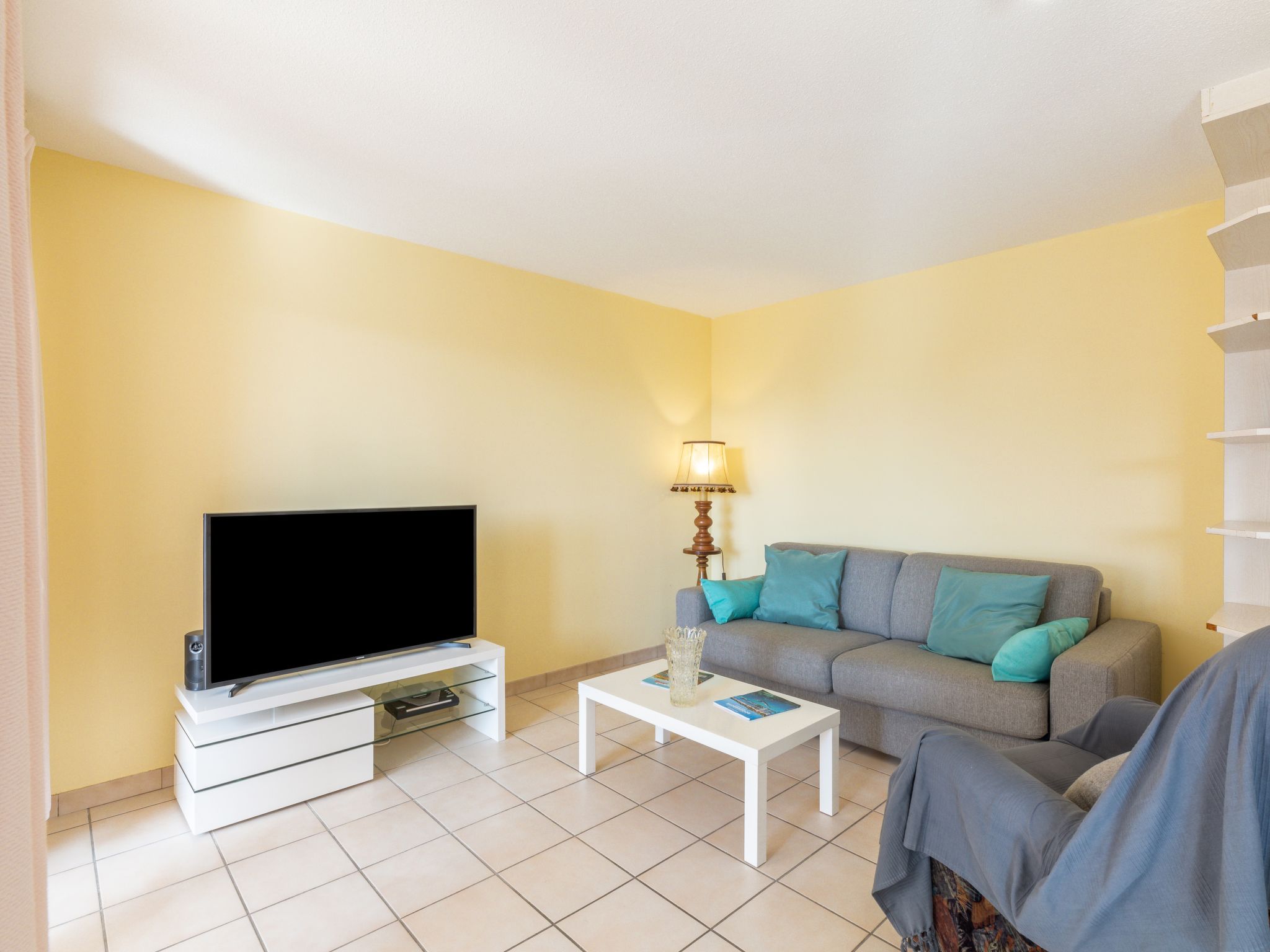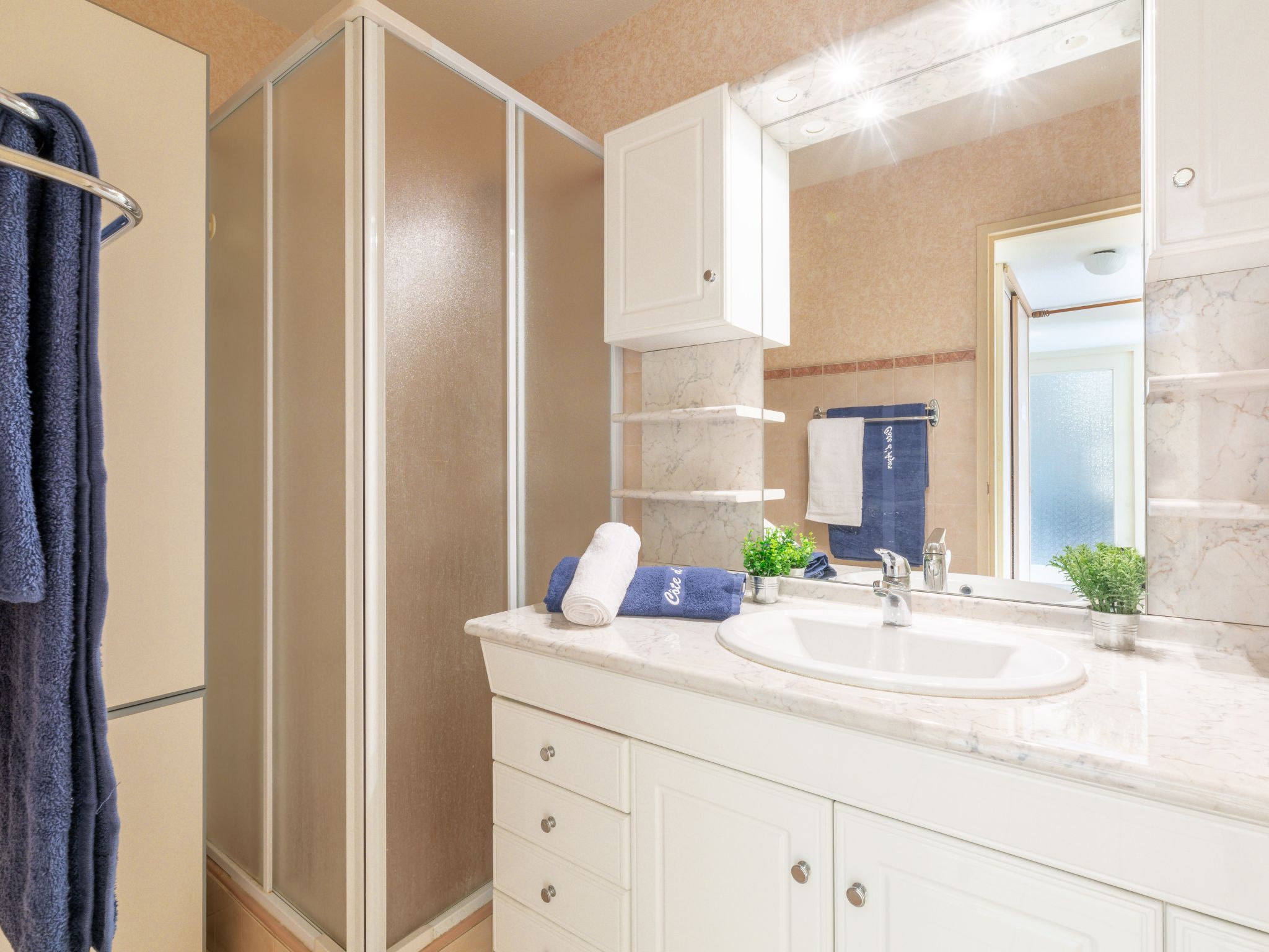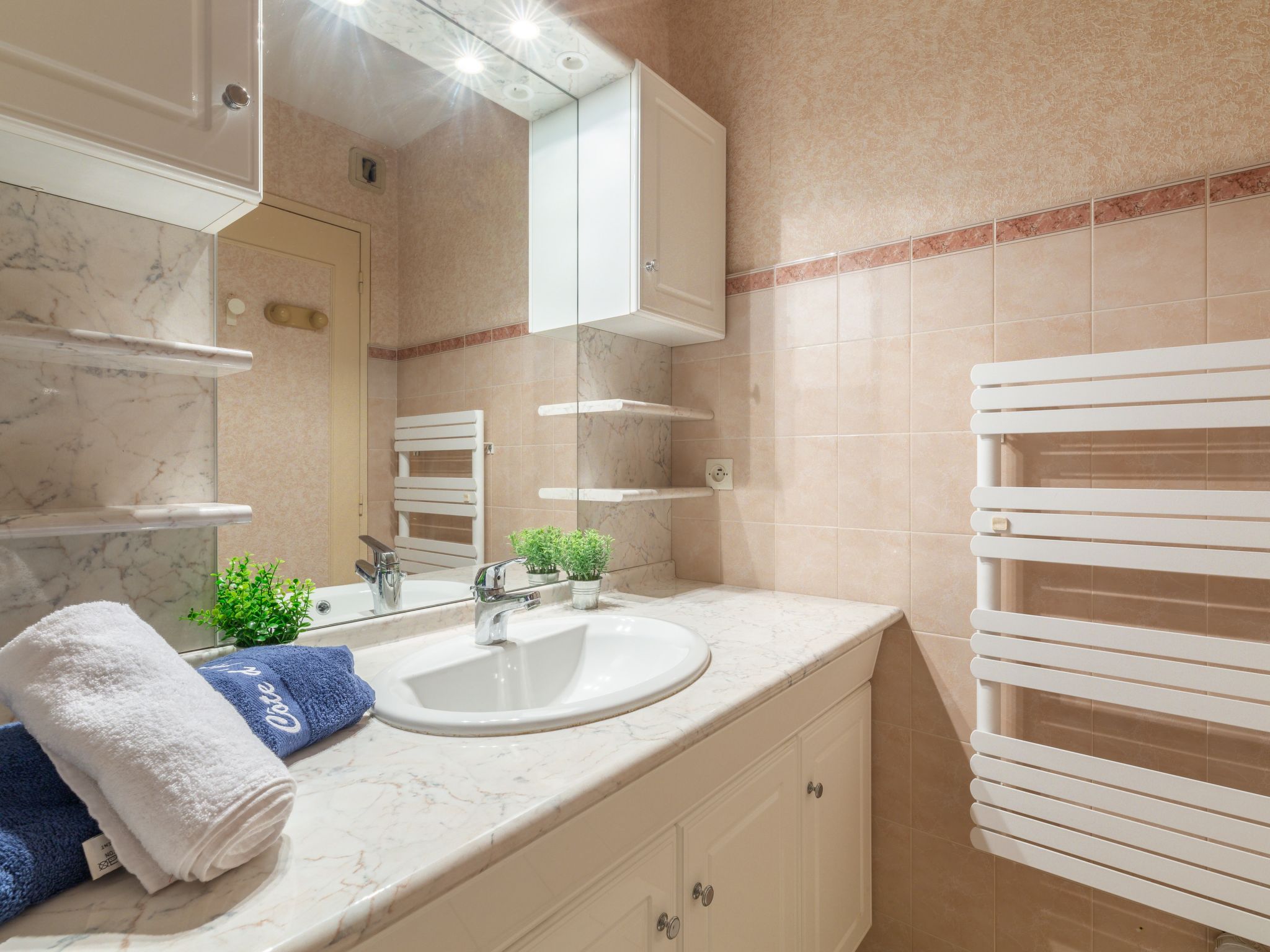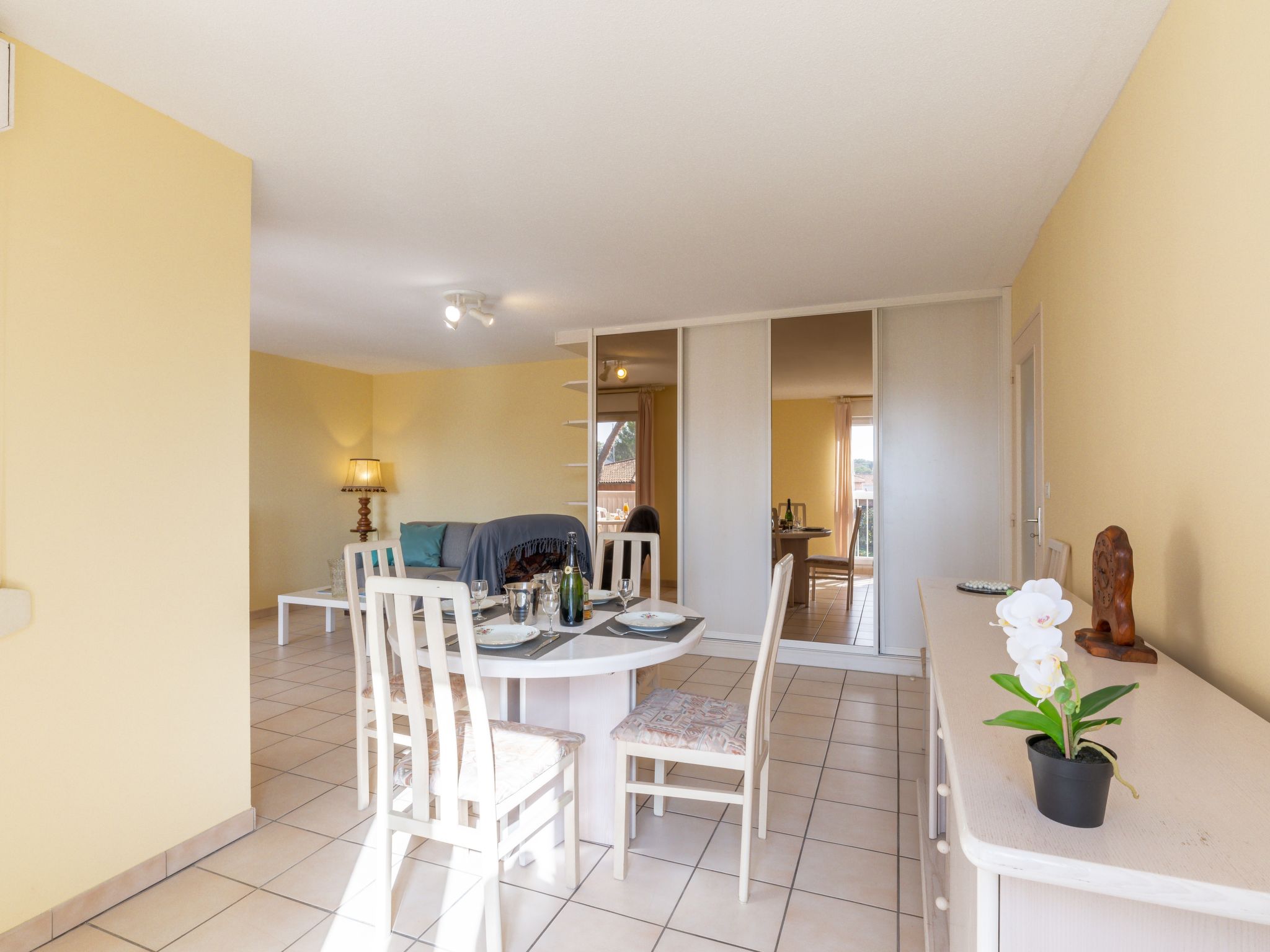 "La Résidence Timothée", 2-room apartment 54 m2 on 2nd floor, south-west facing position. Comfortable furnishings: living/dining room with panoramic window Dressing room with 1 double sofabed (140 cm, length 190 cm), dining table and TV (flat screen), heating stove, fan and electric shutters. 1 room with Dressing room with 1 french bed (160 cm, length 200 cm), TV and fan. Kitchen 10 m2 (4 hot plates, toaster, kettle, microwave, freezer, electric coffee machine) with small dining table. Shower, sep. WC. Heating. Terrace 12 m2 partly roofed, west facing position. Balcony furniture, electric barbecue. Partial view of the sea. Facilities: washing machine, iron, hair dryer. Internet (WiFi, extra). Garage space n 10 (1 car), height 185 cm. Please note: non-smokers only. 1 pet/ dog allowed. Smoke alarm.