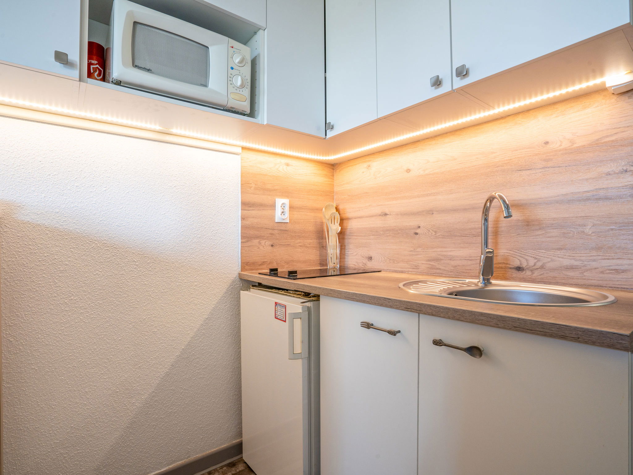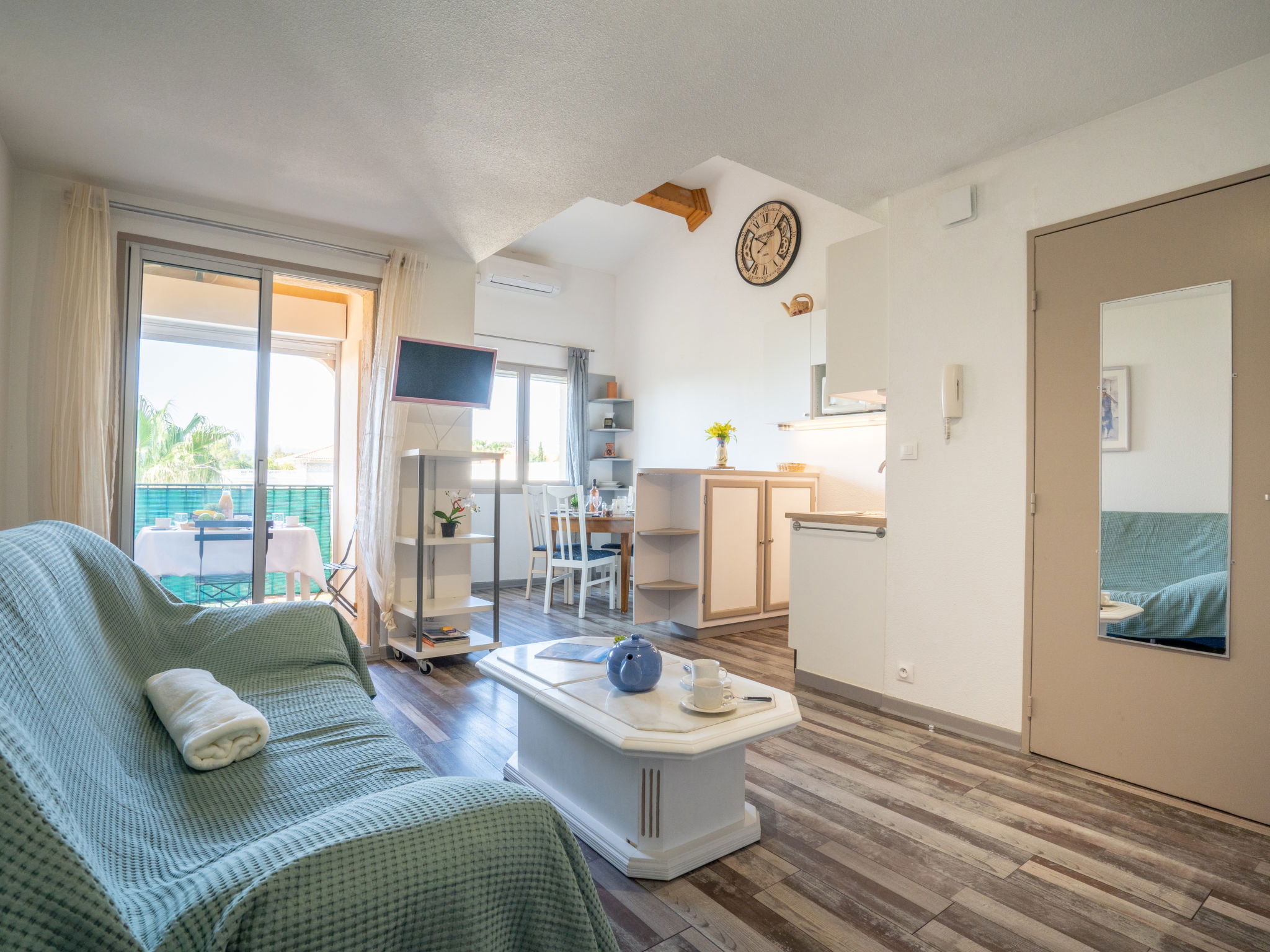 2-room apartment 40 m2 on 3rd floor. Simple and comfortable furnishings: living/dining room with 1 double sofabed (1 x 140 cm, length 190 cm), TV (flat screen), air conditioning. Exit to the balcony. Gallery with 1 french bed (1 x 140 cm, length 190 cm), fan. Open kitchen (mini-oven, 2 ceramic glass hob hotplates, toaster, kettle, microwave, electric coffee machine). Shower/WC. Electric heating. Balcony 6 m2. Balcony furniture. Side view of the sea. Facilities: iron. Internet (WiFi, extra). Reserved parking. Please note: suitable for families apartment street side. TV only FR. Smoke alarm. Offer by a private individual according to Art. 155, IV of CGI.