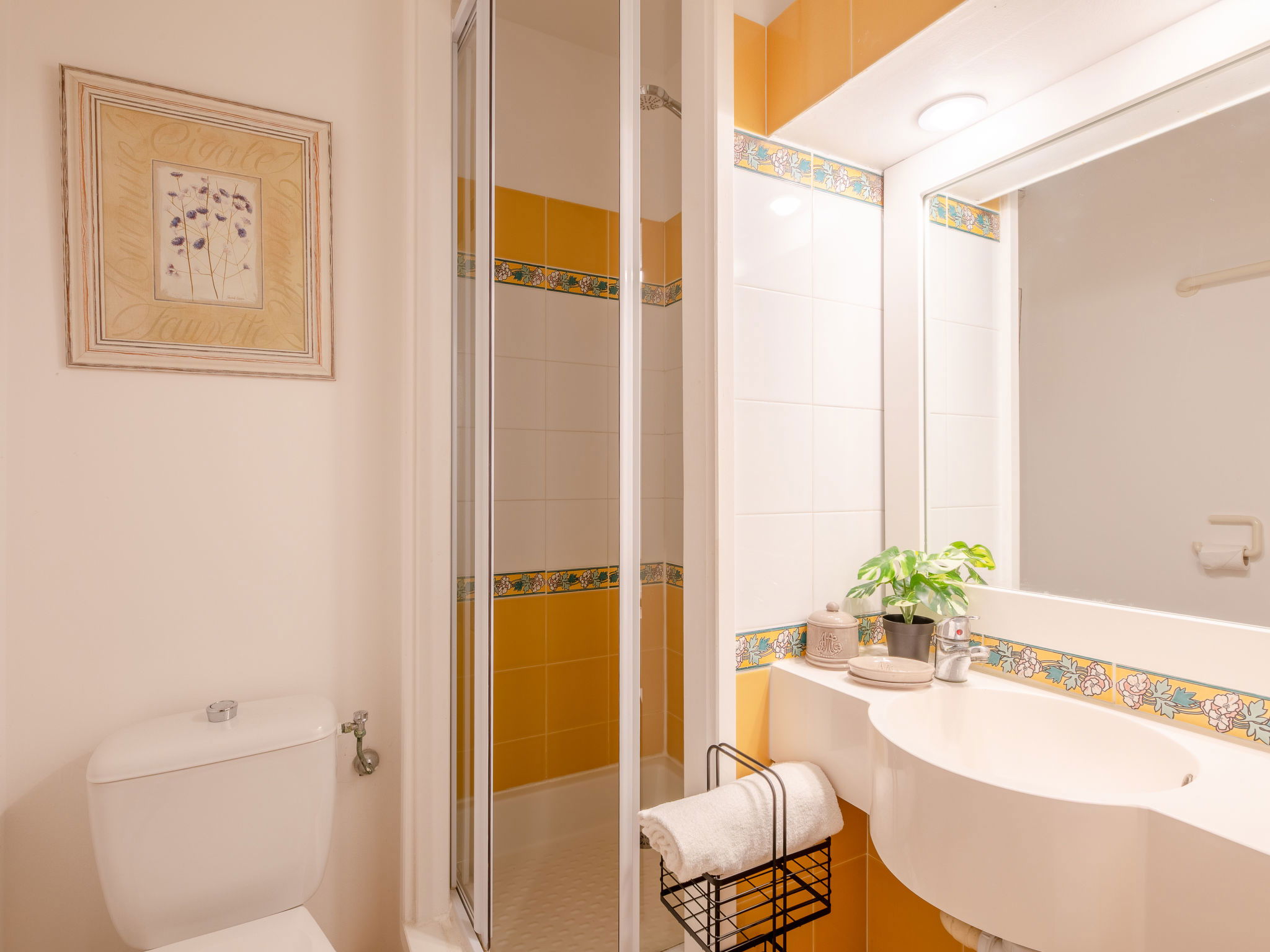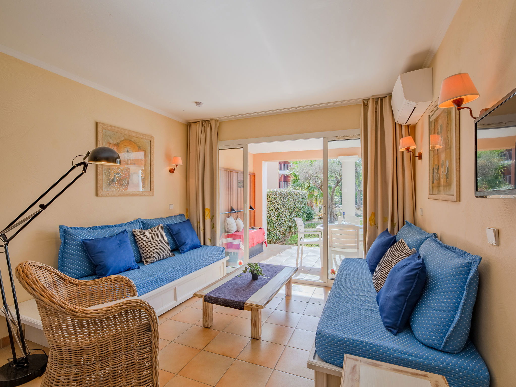 3-room apartment 45 m2, on the ground floor. Simple and practical furnishings: living/dining room with 2 beds (80 cm, length 190 cm), TV and air conditioning. Exit to the garden, to the terrace. 1 room with 1 x 2 bunk beds (80 cm, length 190 cm). 1 room with 1 french bed (140 cm, length 190 cm), air conditioning. Exit to the garden, to the terrace. (oven, dishwasher, 4 ceramic glass hob hotplates, toaster, kettle, microwave, freezer, electric coffee machine). Bathroom, shower/WC, sep. WC. Heating. Terrace 20 m2, south facing position. Terrace furniture. Facilities: washing machine. Internet (WiFi, extra). Parking space n 334. Please note: non-smokers only. Smoke alarm, no lift. 8310700018431