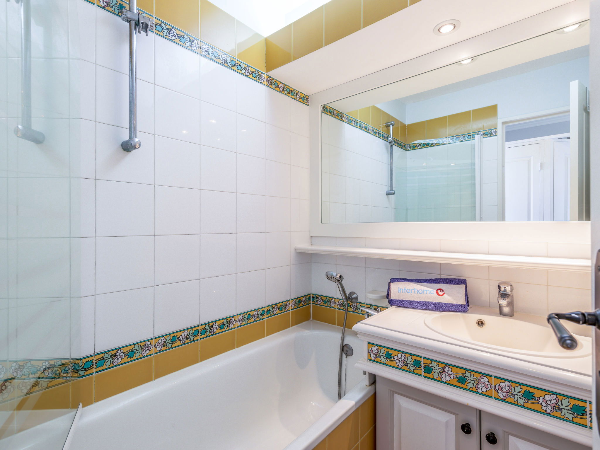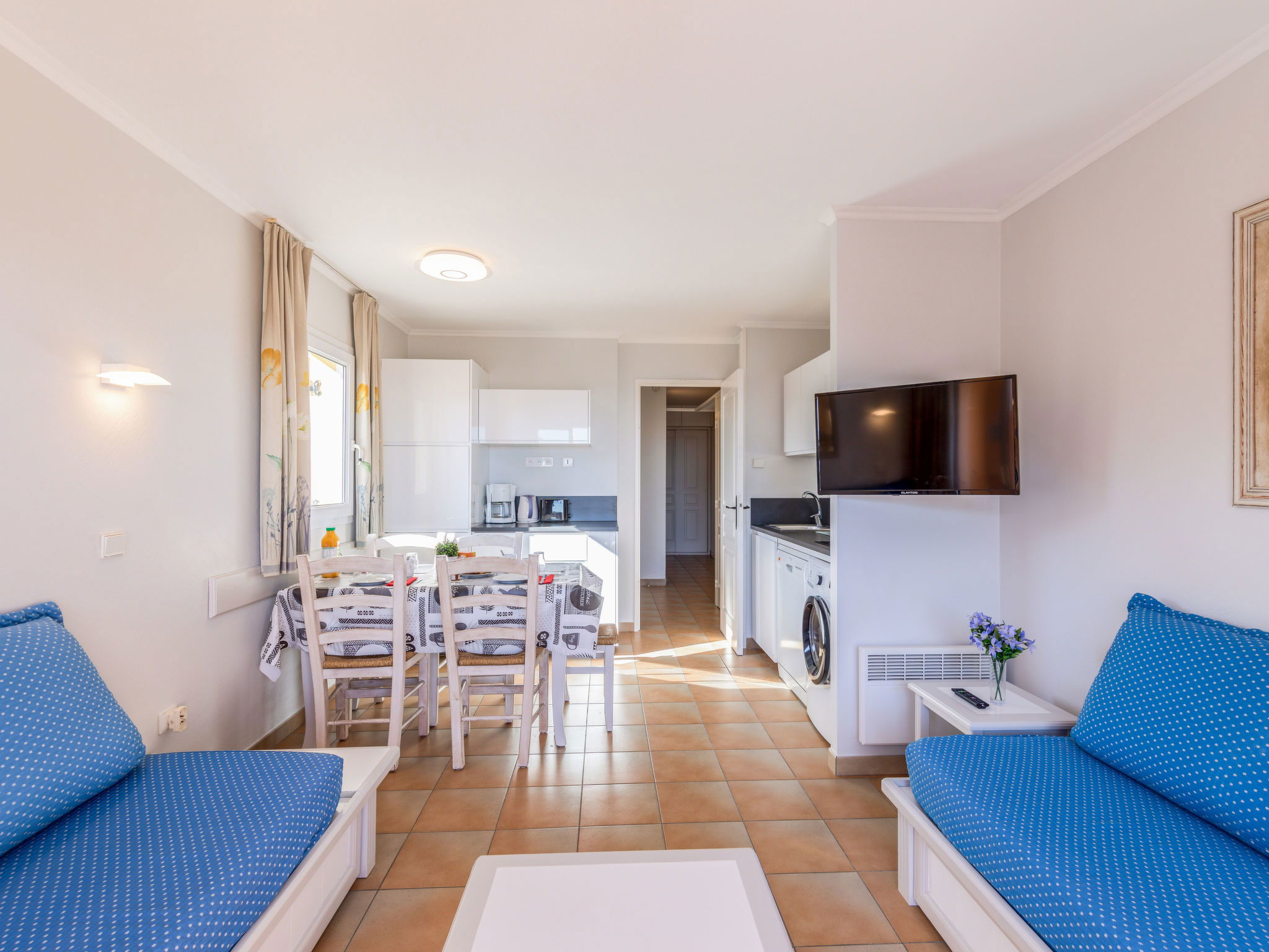 2-room apartment 33 m2 on 3rd floor, south-west facing position. Bright, practical and beautiful furnishings: living/dining room with 1 sofabed (80 cm, length 190 cm), 1 pull-out bed (2 pers. 2 x 80 cm, length 190 cm), TV. Exit to the terrace. 1 double bedroom, west facing position with 1 french bed (1 x 140 cm, length 190 cm). Exit to the balcony. Open kitchen (dishwasher, 4 ceramic glass hob hotplates, toaster, kettle, microwave, electric coffee machine). Bathroom, sep. WC. Air-conditioning, forced-air heating. Balcony 3 m2, west facing position, terrace 8 m2, south facing position. Balcony furniture. Beautiful view of the sea and the swimming pool. Facilities: washing machine, iron, hair dryer. Internet (WiFi, extra). Parking space n 351 (roofed), height 200 cm. Please note: non-smokers only. Smoke alarm, no lift. 83107000257MR