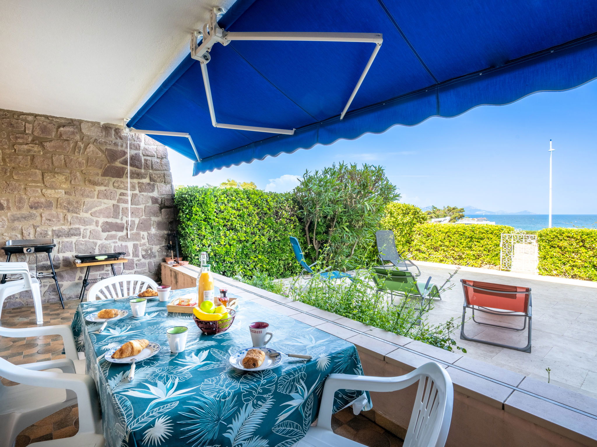 2-room apartment 48 m2, on the upper ground floor, east facing position. Renovated in 2022, beautiful furnishings: living/dining room with 1 double sofabed (1 x 140 cm, length 190 cm), TV and fan. Exit to the terrace. 1 room with 1 french bed (1 x 140 cm, length 190 cm), fan. Exit to the terrace. Kitchenette (dishwasher, 4 gas rings, toaster, kettle, freezer, electric coffee machine, Capsules for coffee machine (Dolce Gusto) extra, combination microwave). Shower/WC. Heating. Terrace 13 m2, patio 50 m2. Terrace furniture, deck chairs (2). View of the sea. Facilities: washing machine, iron, hair dryer. Internet (WiFi, extra). Parking. Please note: suitable for families. TV only FR. Smoke alarm. 8310700021260