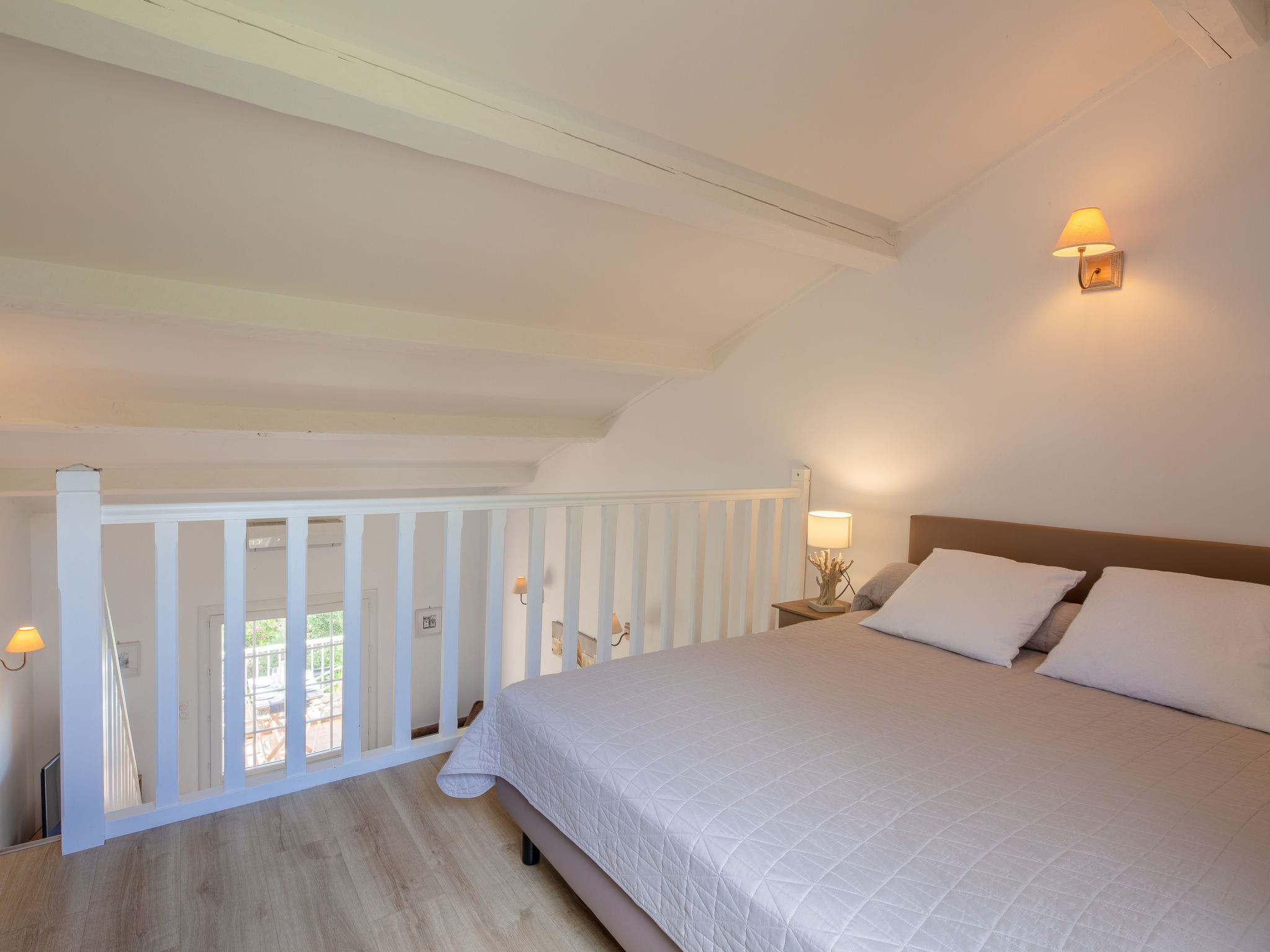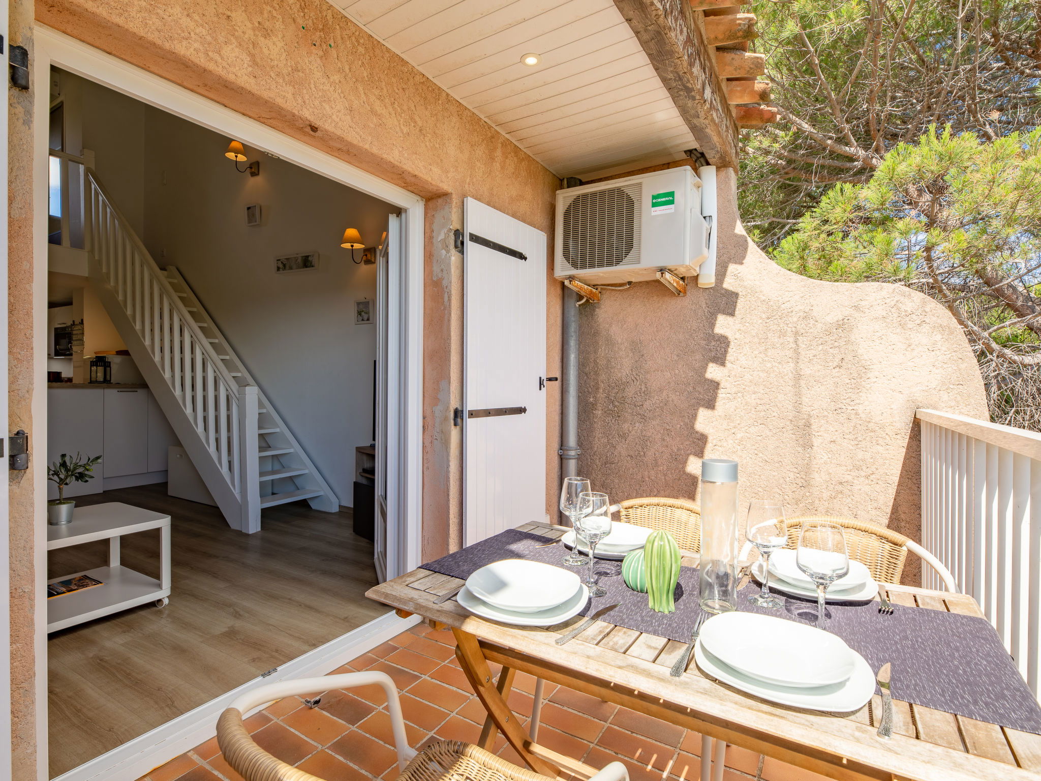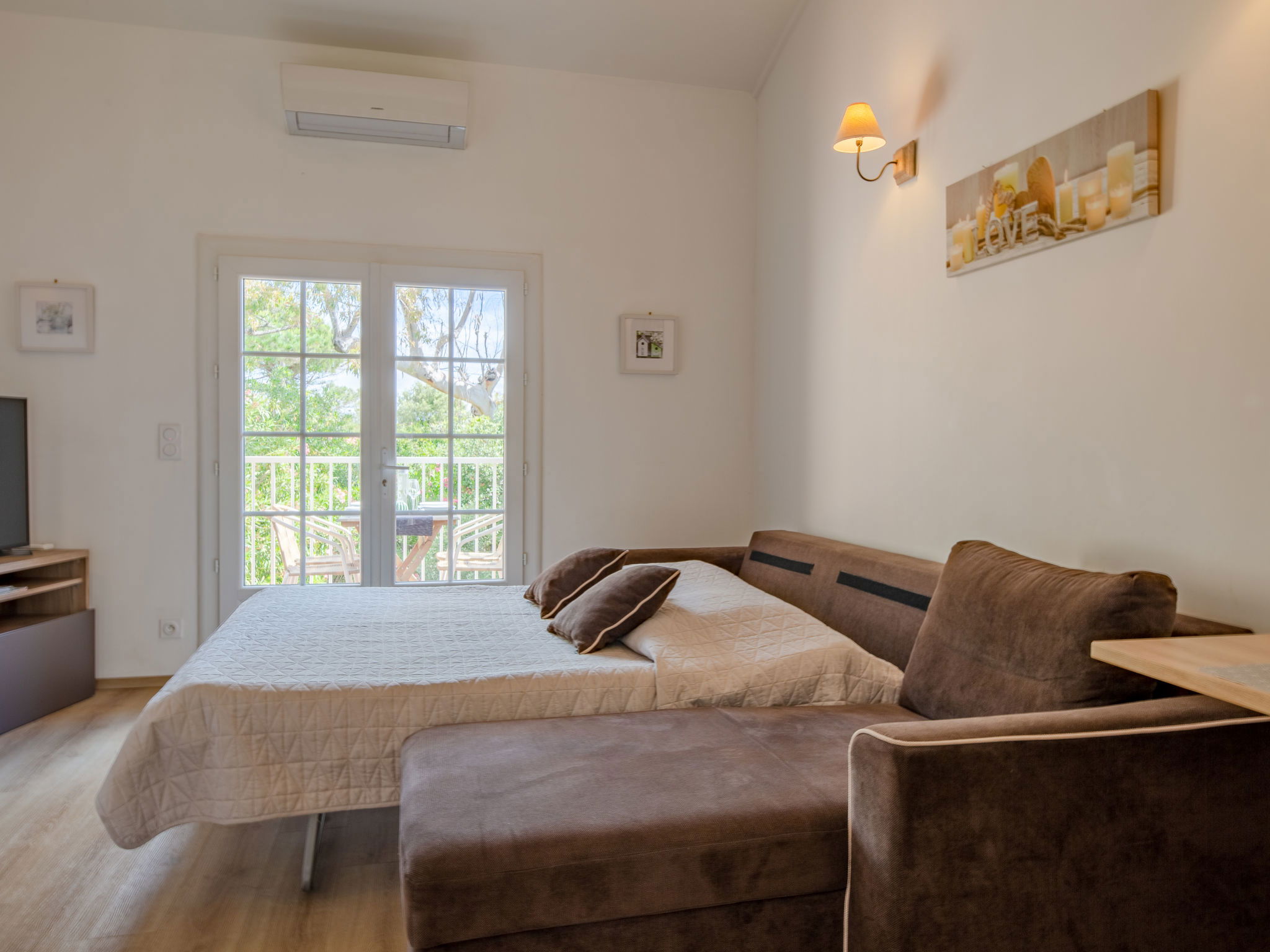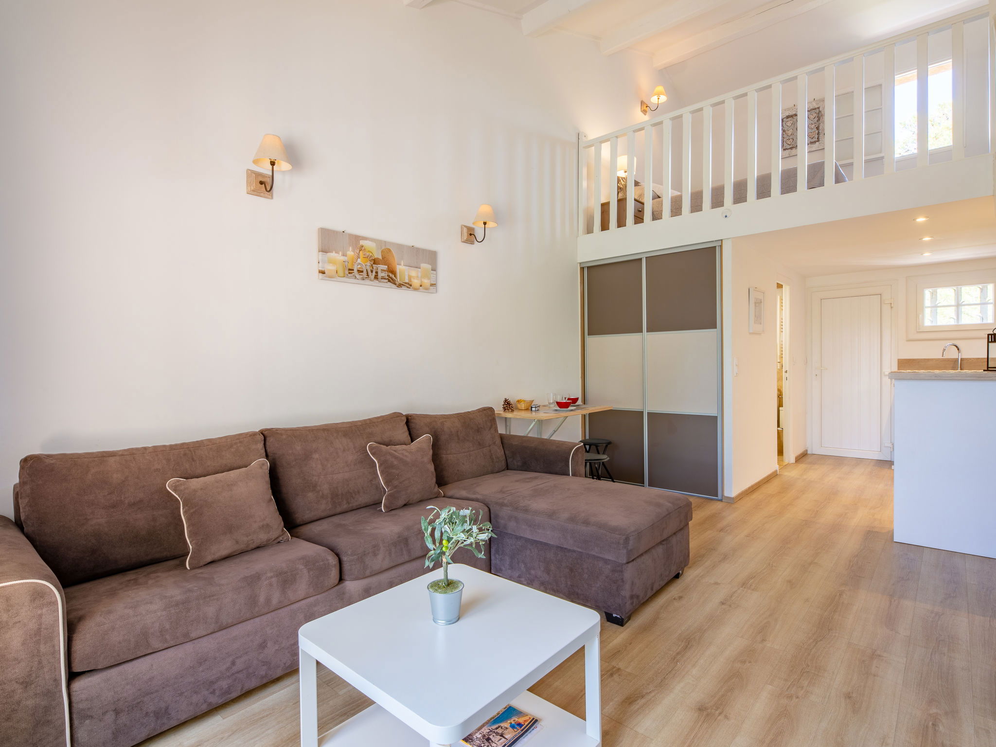 1-room studio 45 m2 on 2 levels on 1st floor. Comfortable and modern furnishings: living/dining room with 1 sofabed (140 cm, length 200 cm), TV. Exit to the balcony. Open kitchen (dishwasher, 2 induction hot plates, toaster, kettle, freezer, electric coffee machine, combination microwave). Shower/WC. Heating, air-conditioning. Upper floor: open gallery with 1 french bed (160 cm, length 200 cm). Balcony 7 m2, east facing position. Balcony furniture. Side view of the sea. Facilities: washing machine. Internet (WiFi, free). Reserved parking space n 4022. Please note: non-smokers only. Smoke alarm. 8310700014822