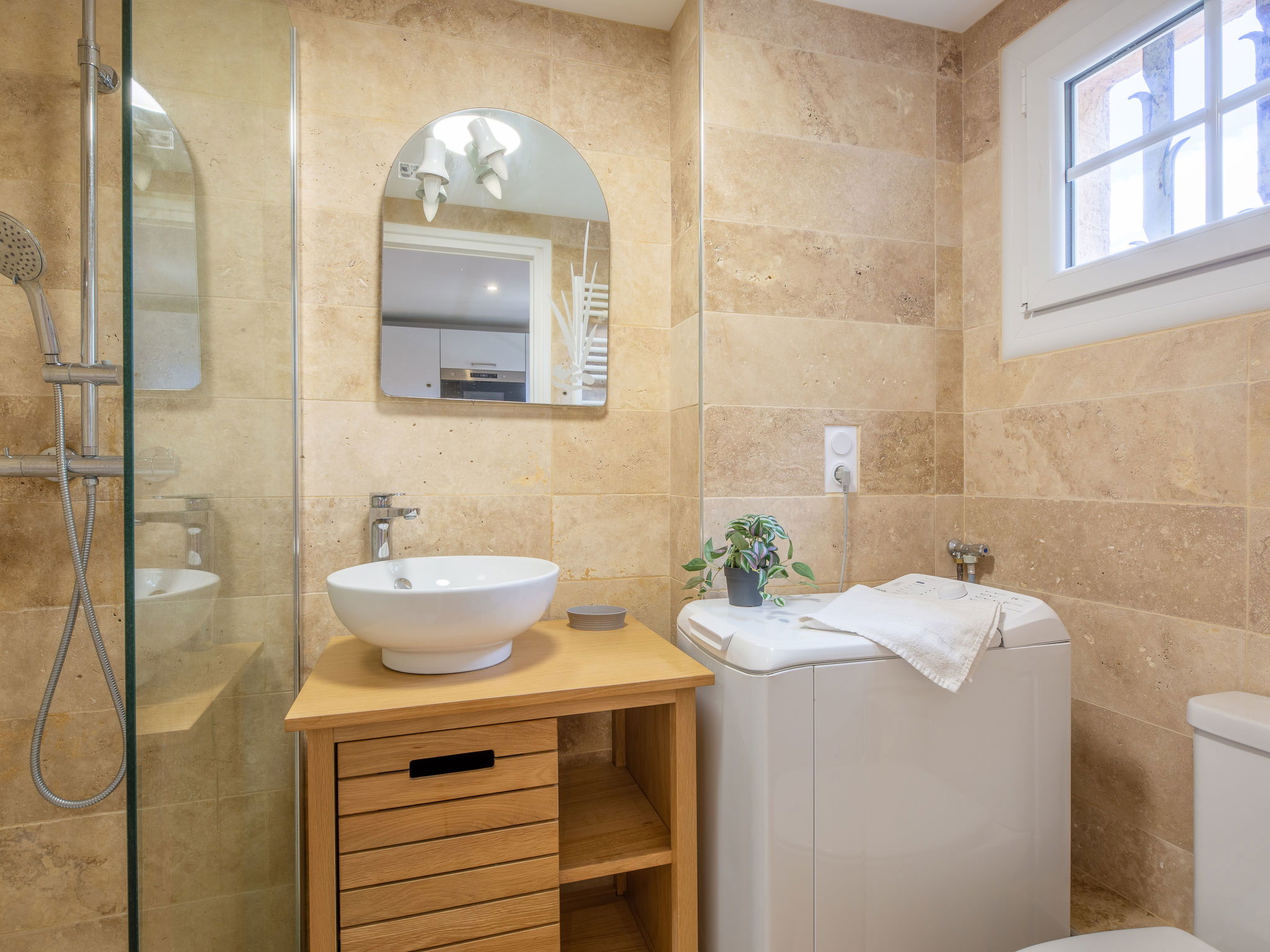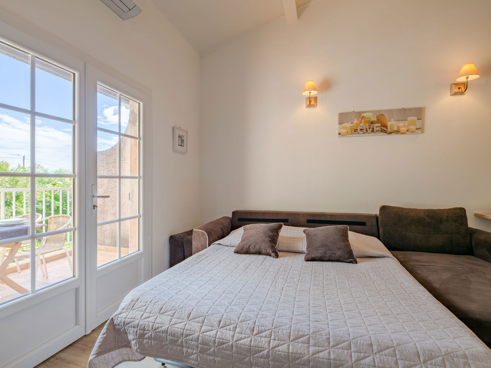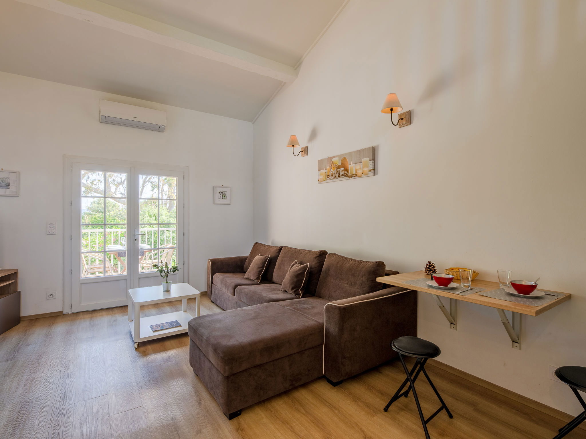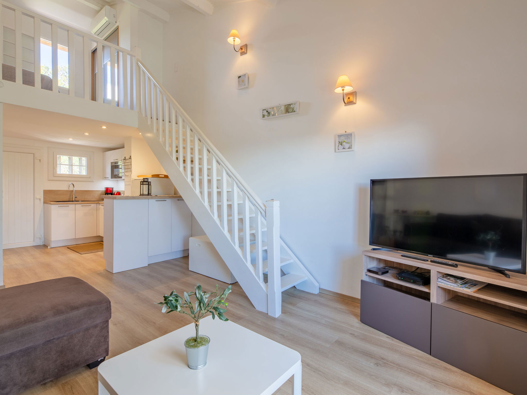 1-room studio 45 m2 on 2 levels on 1st floor. Comfortable and modern furnishings: living/dining room with 1 sofabed (140 cm, length 200 cm), TV. Exit to the balcony. Open kitchen (dishwasher, 2 induction hot plates, toaster, kettle, freezer, electric coffee machine, combination microwave). Shower/WC. Heating, air-conditioning. Upper floor: open gallery with 1 french bed (160 cm, length 200 cm). Balcony 7 m2, east facing position. Balcony furniture. Side view of the sea. Facilities: washing machine. Internet (WiFi, free). Reserved parking space n 4022. Please note: non-smokers only. Smoke alarm. 8310700014822