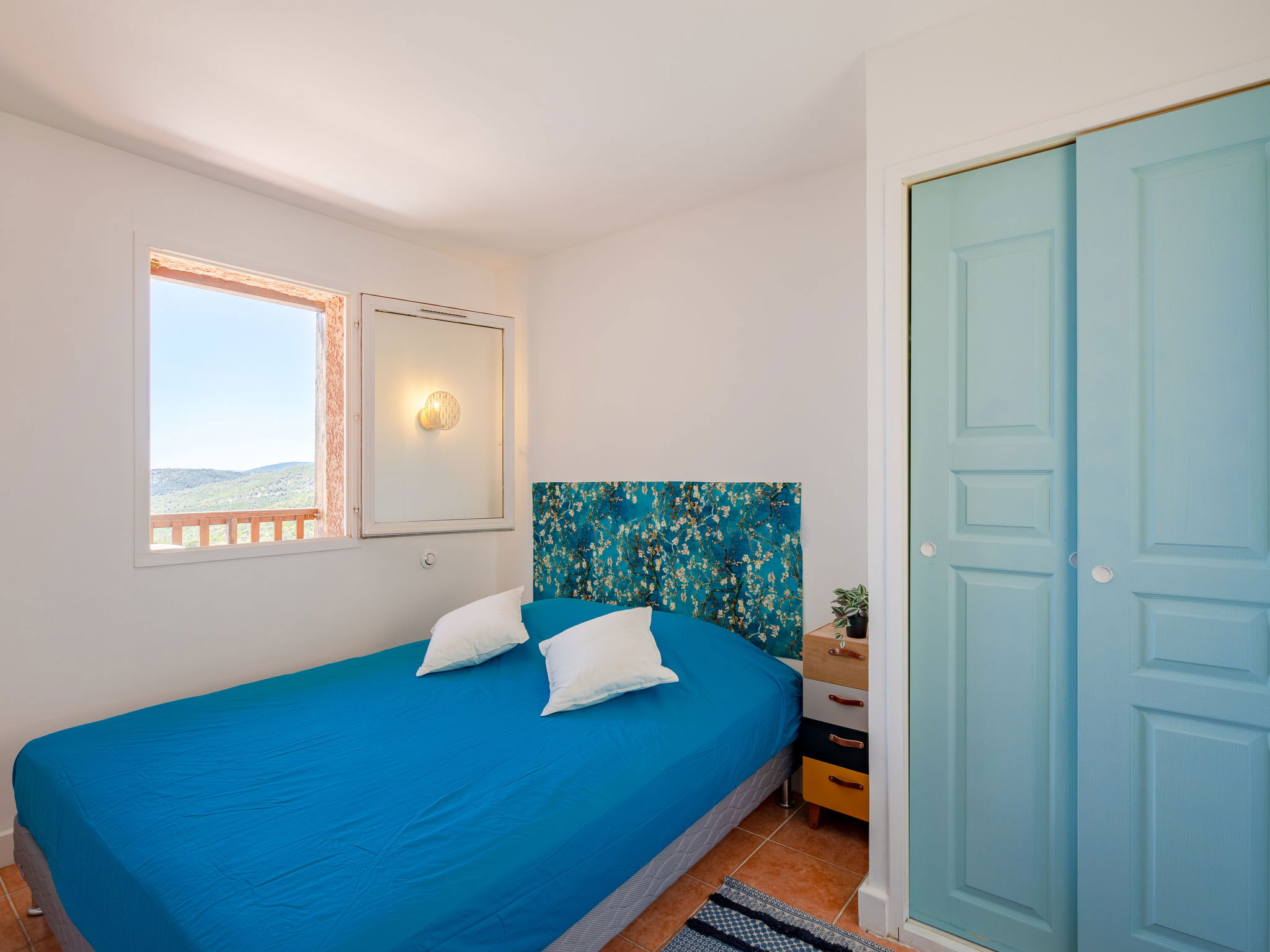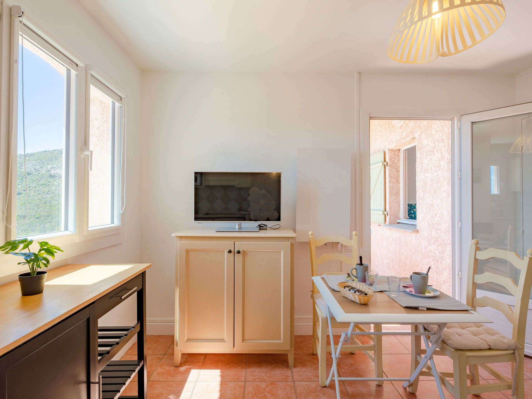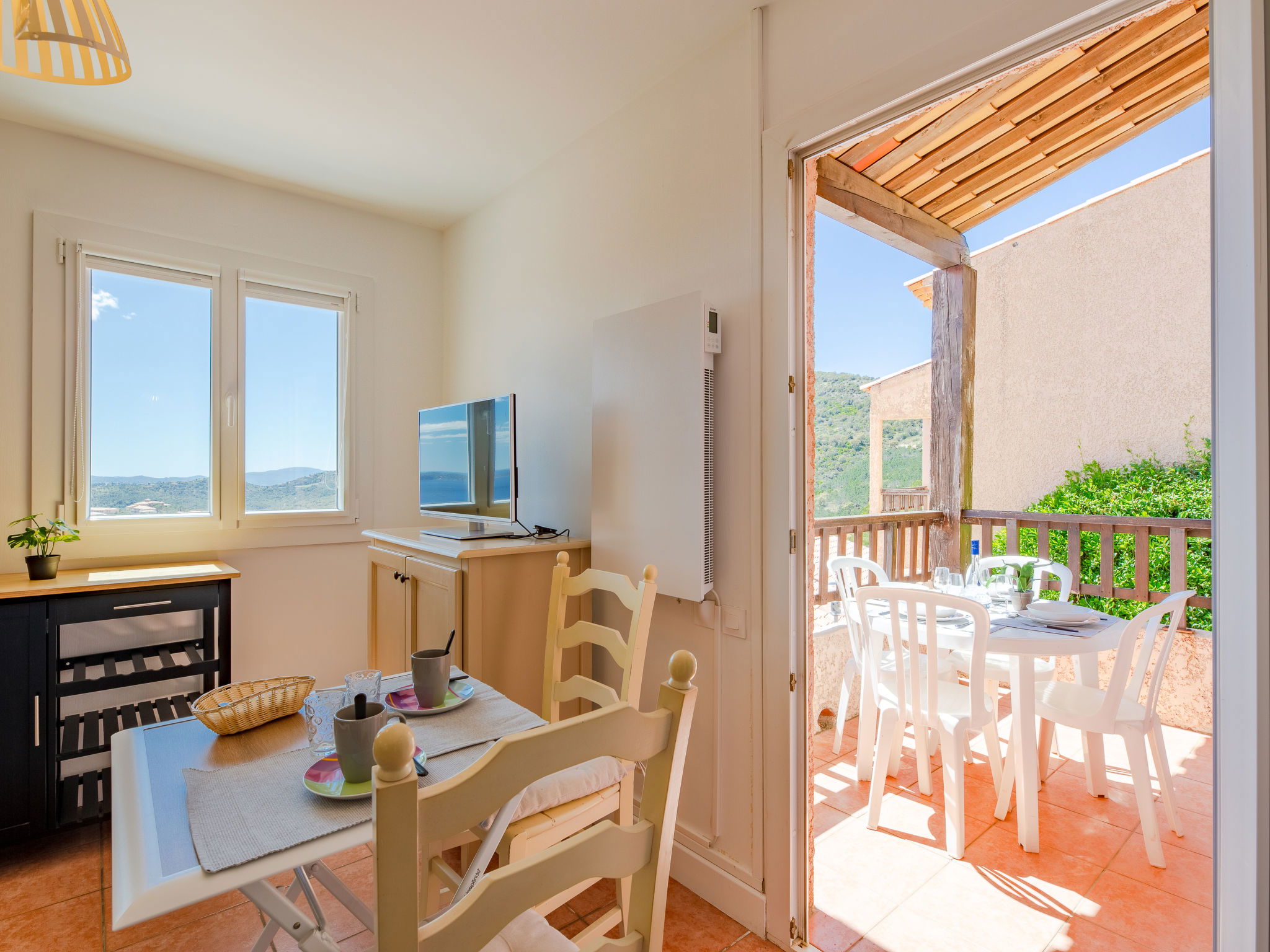 2-room apartment 35 m2, on the upper ground floor. Bright, beautiful furnishings: living/dining room with TV (flat screen). Exit to the balcony. 1 room with 1 french bed (1 x 160 cm, length 200 cm), TV (flat screen). Kitchenette (dishwasher, 4 ceramic glass hob hotplates, toaster, kettle, microwave, electric coffee machine). Shower/WC. Electric heating. Balcony 6 m2, west facing position. Balcony furniture. Beautiful view of the sea and the valley. Facilities: washing machine, dryer, iron. Internet (WiFi, extra). Reserved parking. Please note: non-smokers only. Smoke alarm. Offer by a private individual according to Art. 155, IV of CGI. 83107001908EB