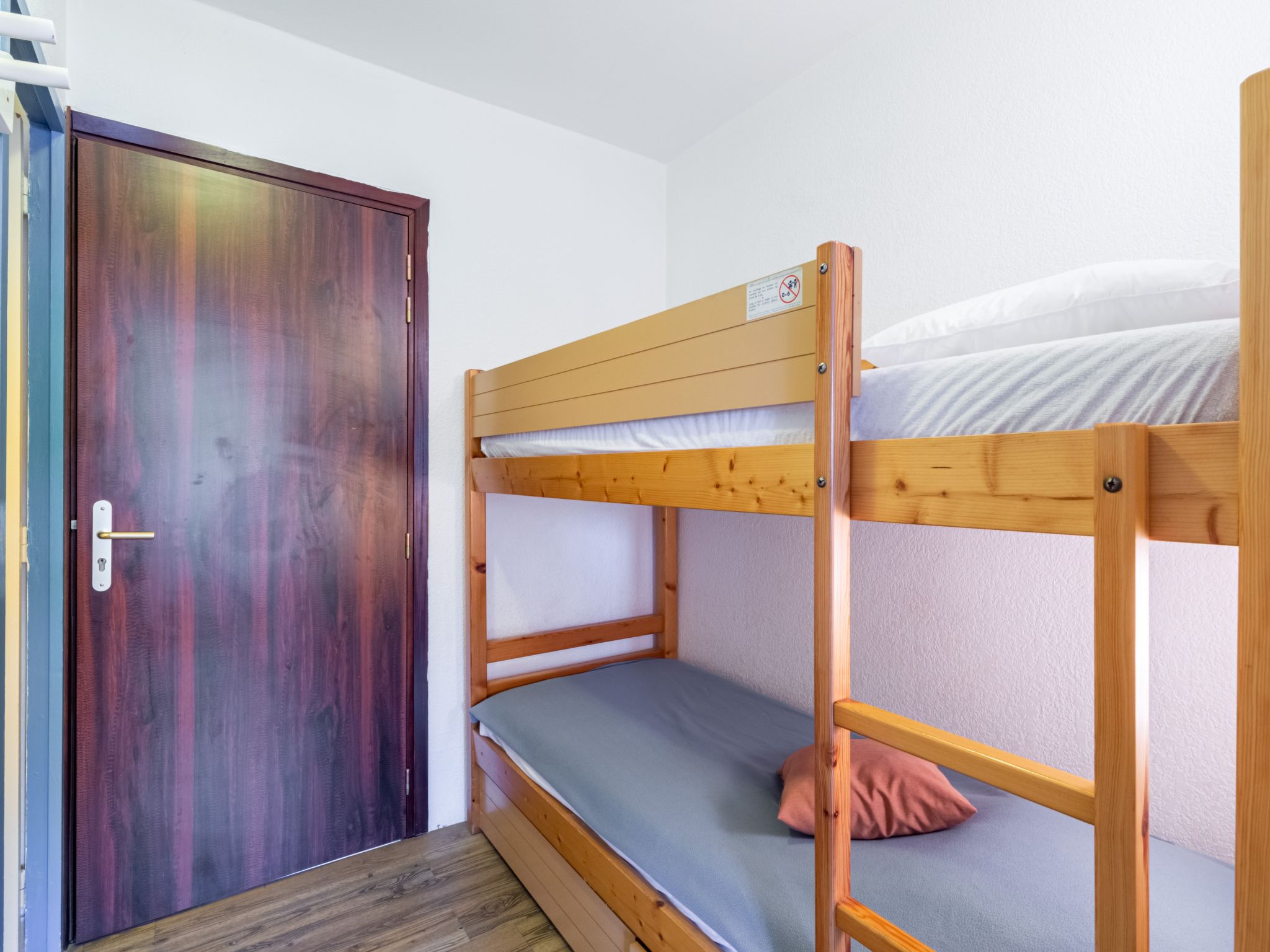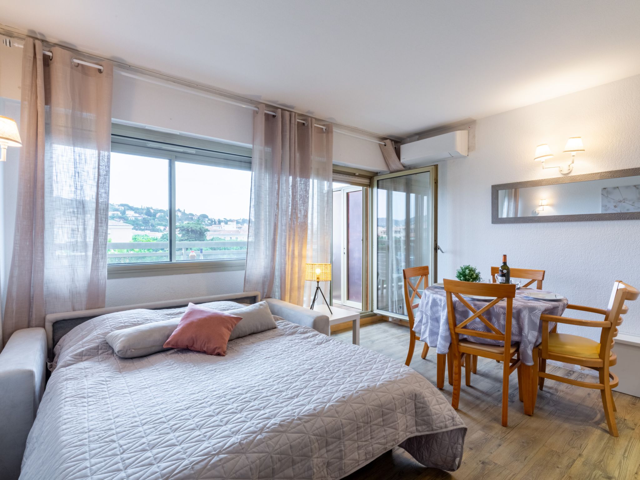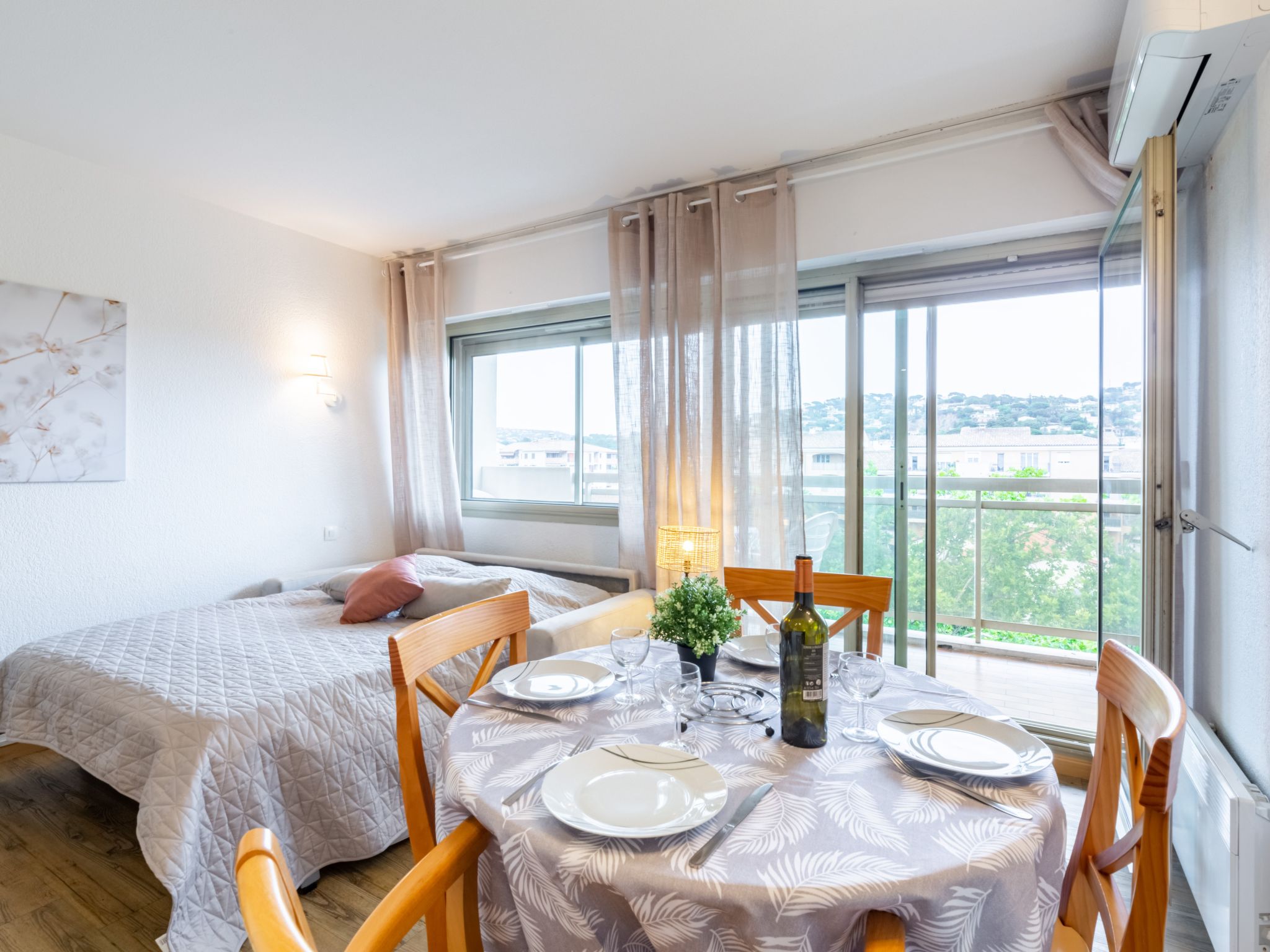 1-room apartment 25 m2 on 4th floor. Simple and practical furnishings: living/dining room with 1 double sofabed (140 cm, length 190 cm), TV. Exit to the balcony. Entrance hall with 1 x 2 bunk beds (80 cm, length 190 cm). Kitchenette (2 hot plates, dishwasher, kettle, microwave, electric coffee machine). Bath/WC. Heating, air-conditioning. Balcony 6 m2, east facing position. Balcony furniture. View of the town. Facilities: safe. Internet (WiFi, extra). Parking space n 168. Please note: apartment street side. Non-smokers only, parking space for small car only. 1 small pet/ dog allowed. Smoke alarm. Instead of an enclosed bedroom, some sleeping areas are located in an open-plan area (gallery, alcove, etc.). 83115003000AK