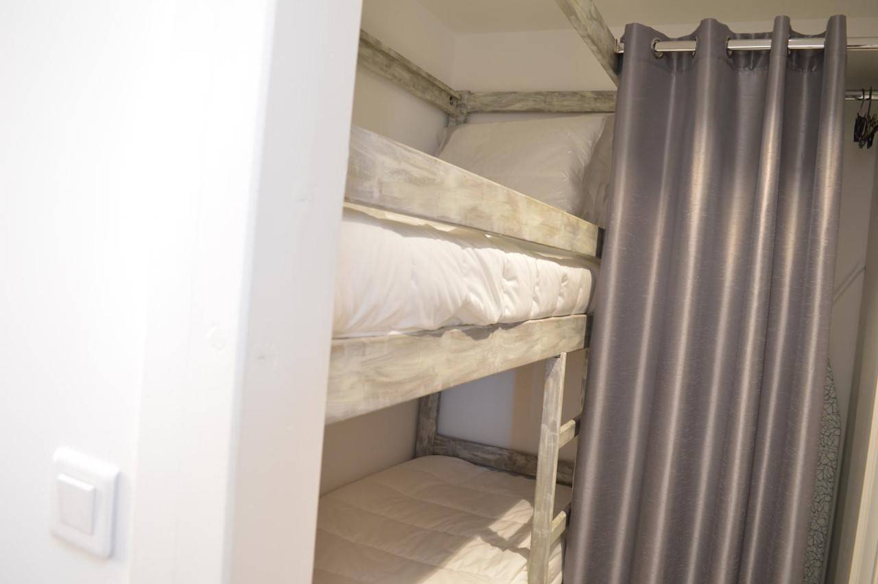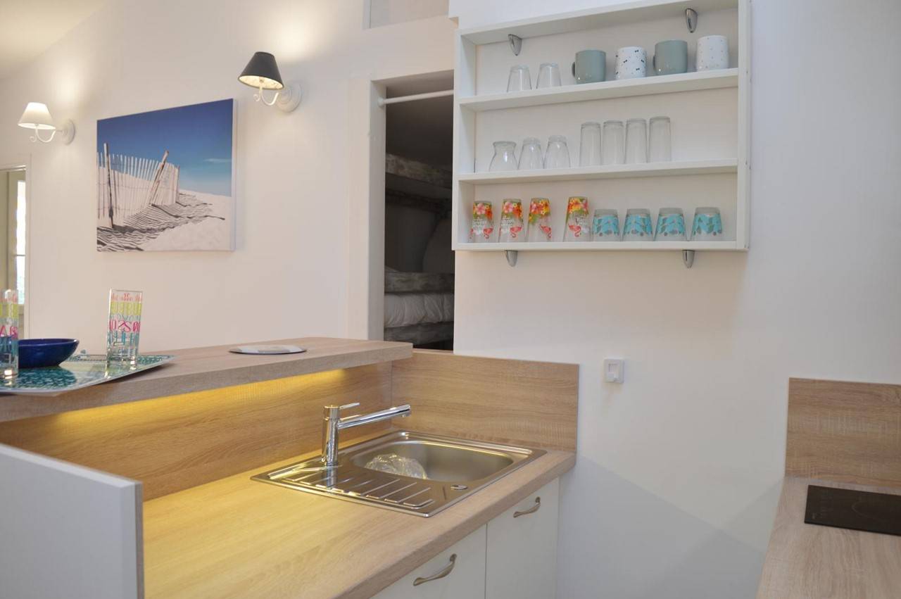 Approximately 27m² - up to 6 people Accommodation: This holiday apartment has just been refurbished for a comfortable holiday. It consists of a living room with an equipped kitchenette, a large terrace, a bedroom with a double bed, a cabin with two single bunk beds, a bathroom with toilet.
