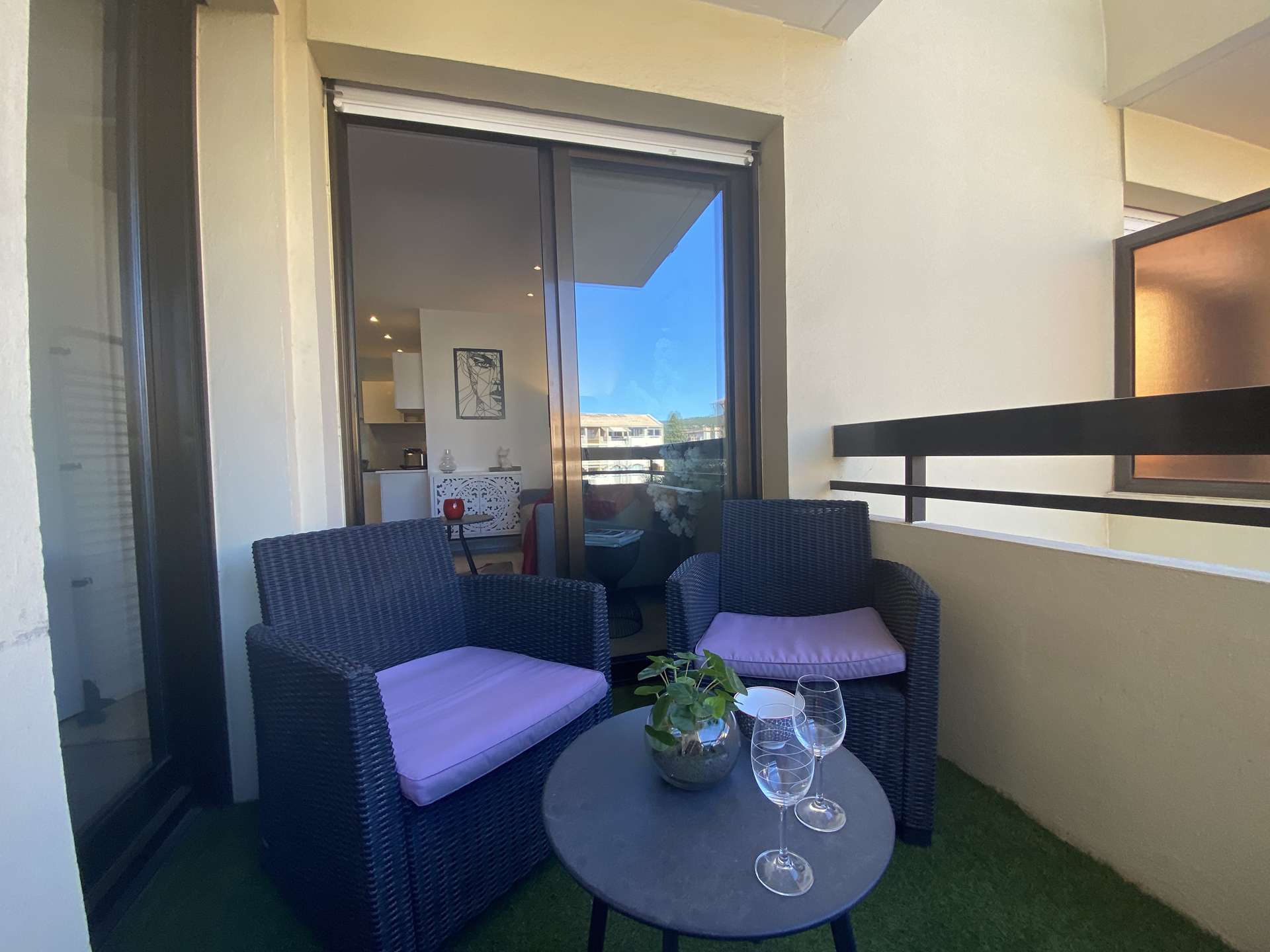 2 rooms - approximately 30 m² - up to 2 people Accommodation: This vacation rental consists of a bright living room with a sofa bed, a well-appointed kitchen area, a bedroom with a double bed 140, a bathroom , separate toilet, a pretty little terrace with lounge overlooking the back of the quiet residence. The advantages of this rental in Sainte Maxime: This accommodation is completely renovated and carefully decorated with new air conditioning. A pleasant furnished terrace overlooking bedroom and living room. Cleaning included. Practical information: This rental located in the city center and a few steps from the beach, a laundromat available at the foot of the residence.