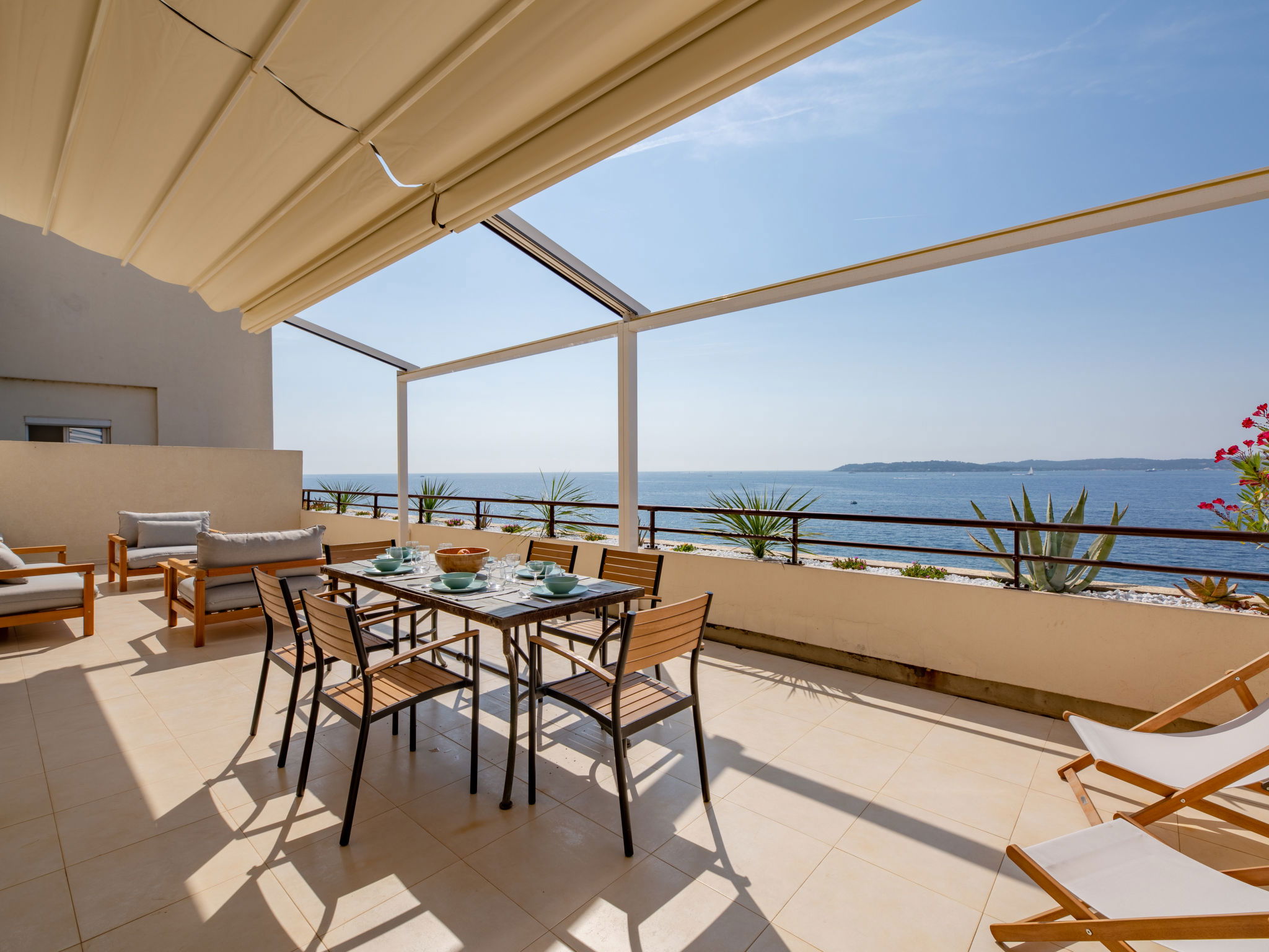 3-room maisonette 114 m2 on 5th floor, south facing position. Stylish furnishings: large living/dining room with TV (flat screen). Exit to the terrace. 1 room, south facing position with 1 french bed (1 x 180 cm, length 200 cm). Exit to the terrace. 1 room, north facing position with 1 french bed (1 x 160 cm, length 200 cm). Open kitchen (oven, dishwasher, 4 ceramic glass hob hotplates, toaster, kettle, microwave, freezer, electric coffee machine). Shower, sep. WC. Air-conditioning, forced-air heating. Upper floor: 1 room, without window with 1 french bed (1 x 160 cm, length 200 cm), shower/bidet/WC. Large terrace 50 m2, south facing position. Terrace furniture. Panoramic view of the sea. Facilities: washing machine, iron, hair dryer. Internet (WiFi, extra). Parking at 750 m. Please note: non-smokers only, parking space for small car only. Maximum 1 pet/ dog allowed. Smoke alarm. Offer by a private individual according to Art. 155, IV of CGI. 83115005138HT