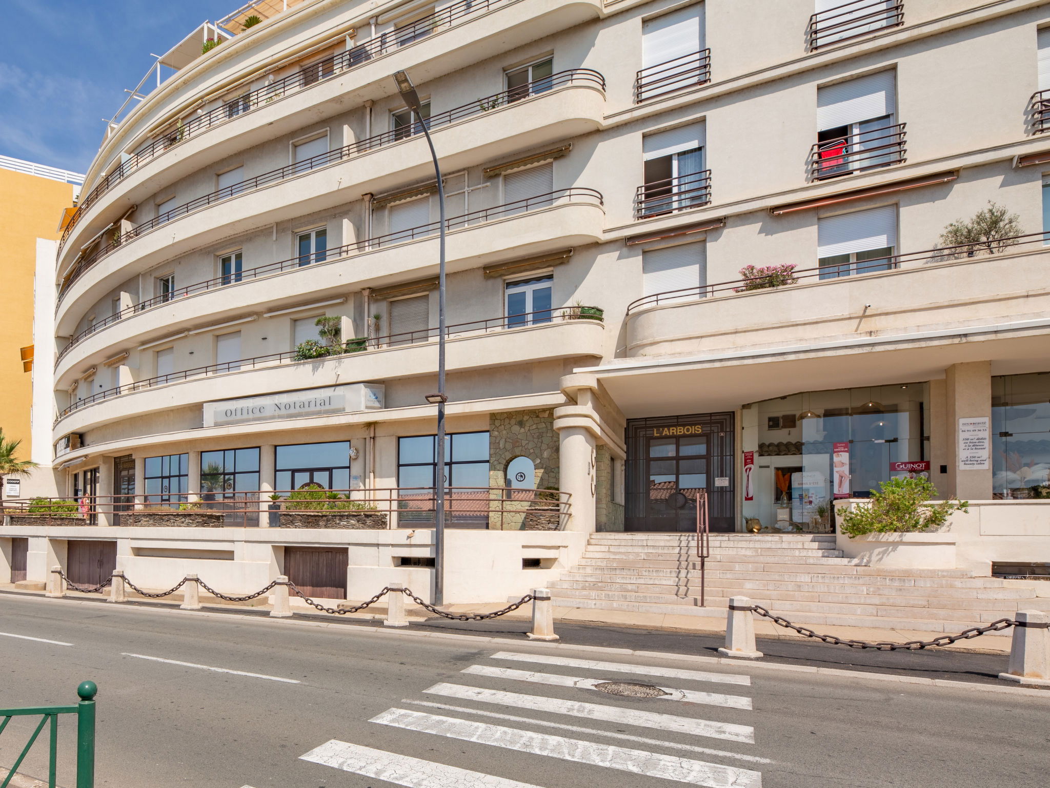 Beautiful, historical apartment house "L'Arbois", 5 storeys, built in 1930. In the centre of Sainte Maxime, in a sunny position, 150 m from the sea, 150 m from the beach. In the complex: lift. Public parking 100 m extra. Grocery 30 m, supermarket 1 km, restaurant 100 m, bakery 250 m, bus stop 200 m, sandy beach "Beach Saudan" 150 m, thermal baths "Thalasso Spa des Issambres" 7 km. Sports harbour 150 m, golf course (18 hole) 5 km, tennis 1 km. Nearby attractions: Aqualand Waterpark 5 km, Navette / shuttle boat St-Tropez 15min 250 m, Saint-Tropez/Ramatuelle 16 km, Port-Grimaud 12 km, Gorges du Verdon 80 km. Hiking paths: Massif des Maures 10 km, Massif de l'Esterel 25 km. The keys‘ handover takes place by the agency in Sainte Maxime.