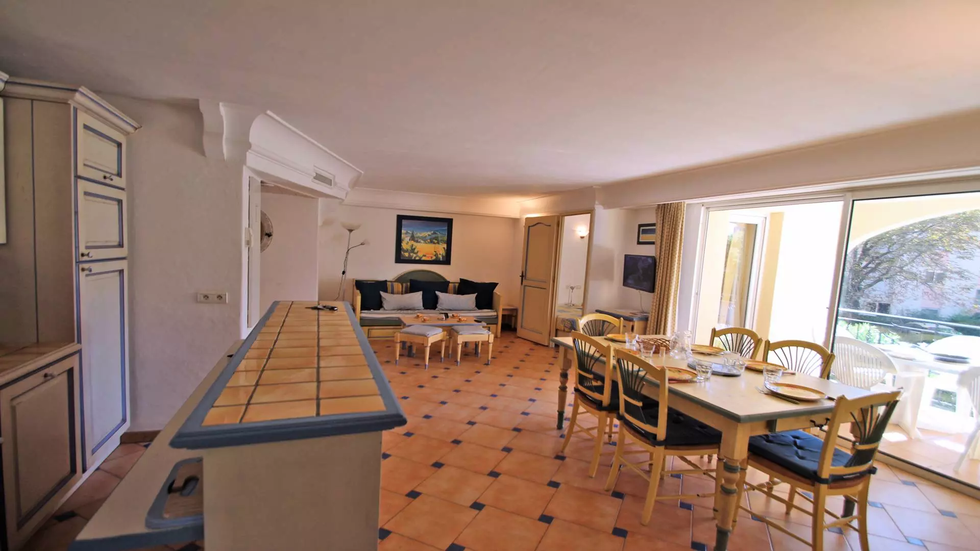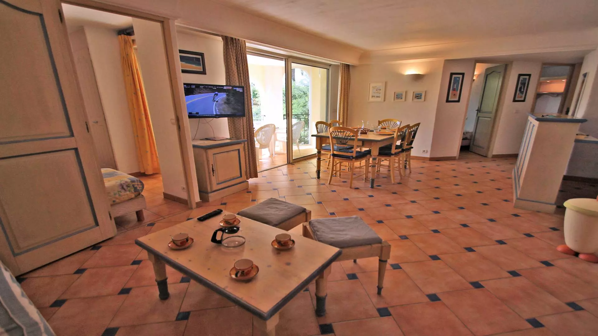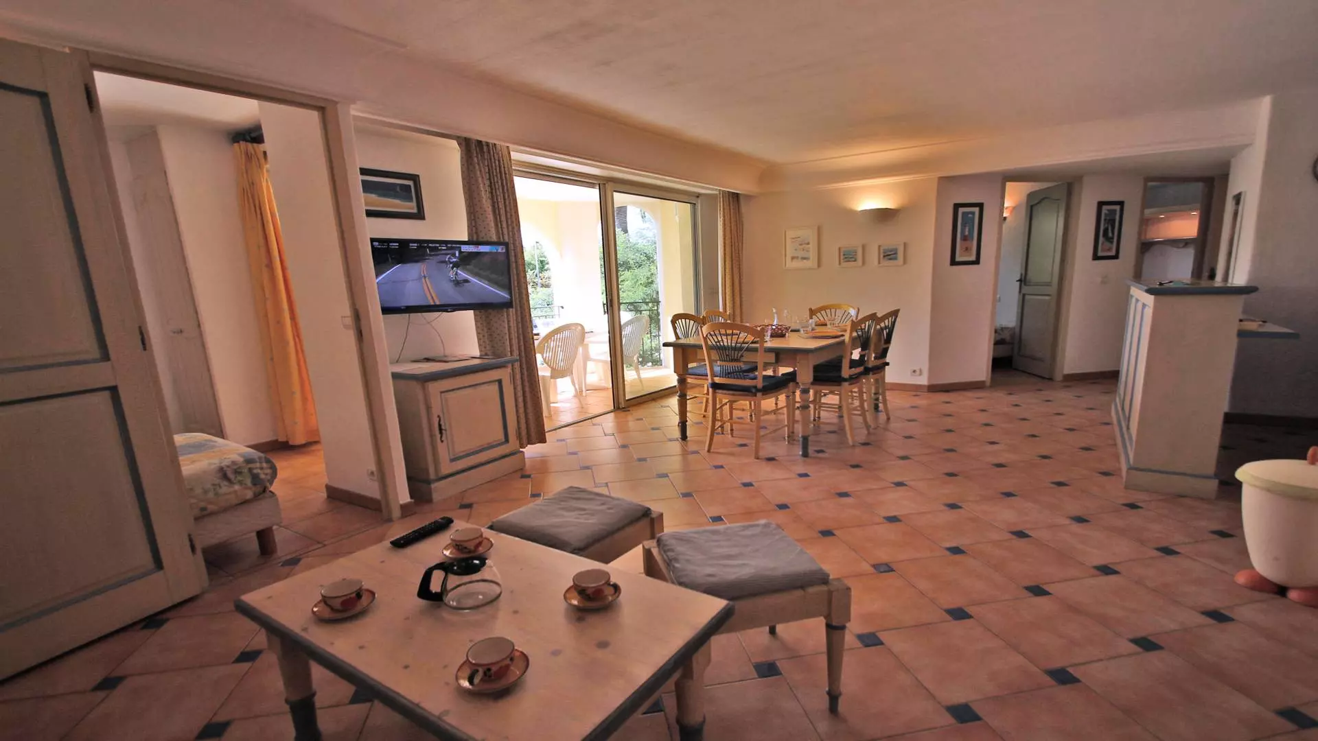 - Air-conditioned living room including lounge with sofa, coffee table, stools x2, television, direct access to the terrace and dining area with table and chairs