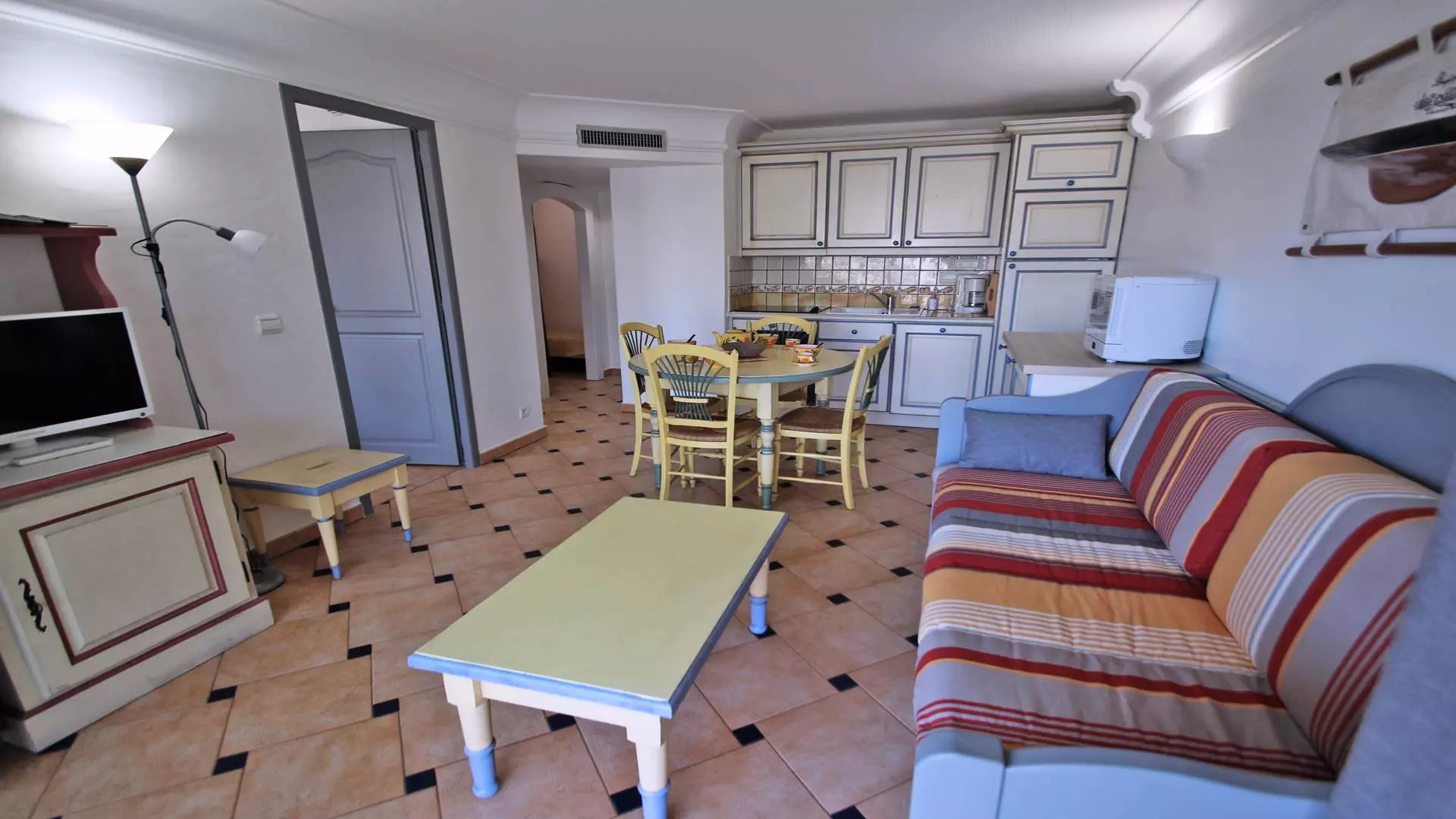 - Living room with sofa (2x80 pull-out beds), flat screen TV, safe and dining area