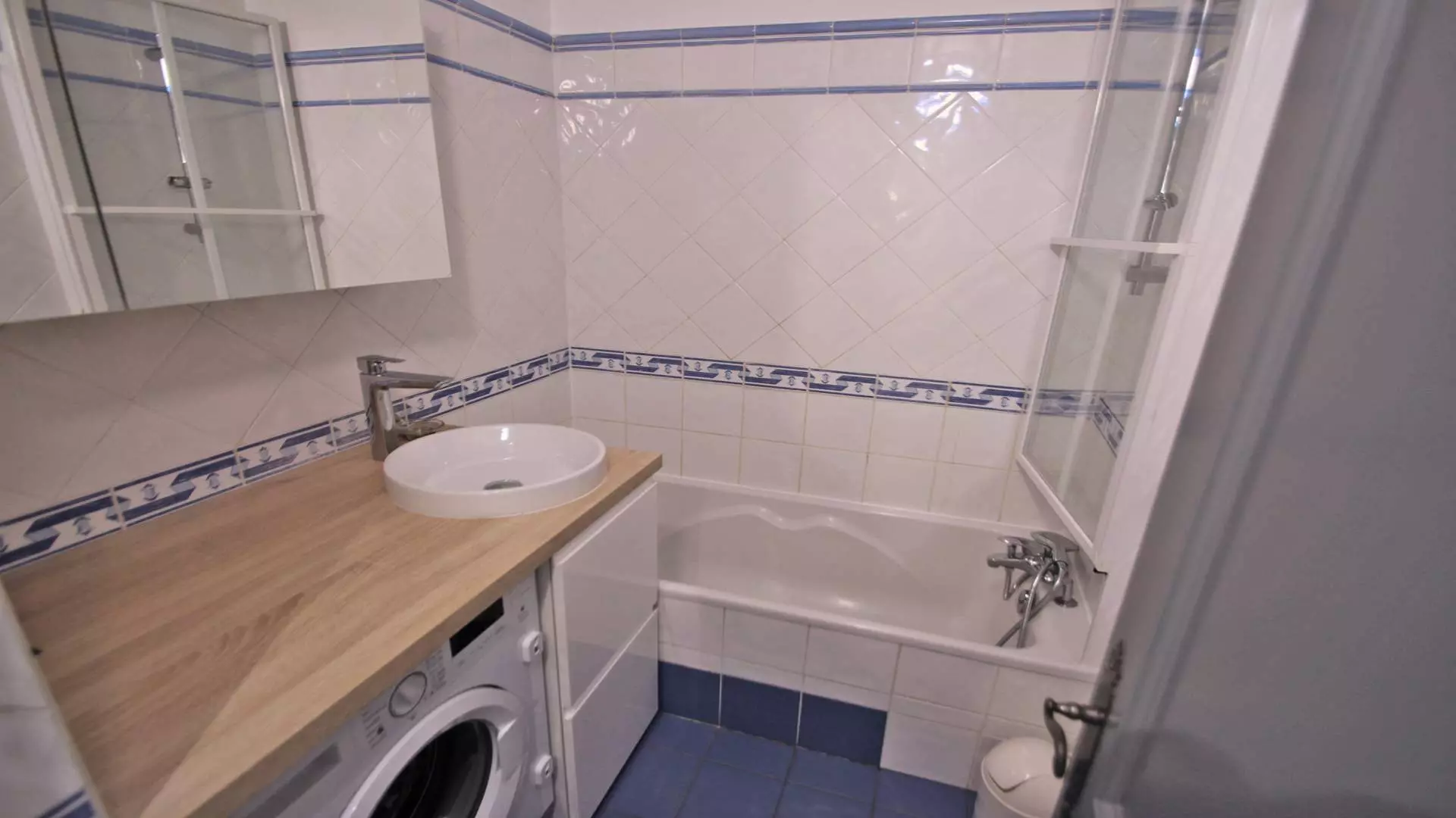 - Bathroom with bathtub, washing machine and washbasin unit