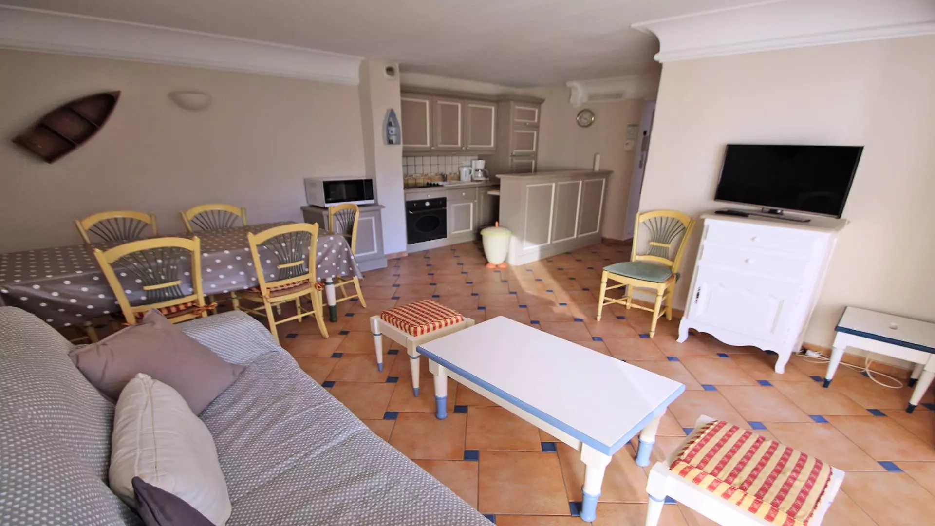 - Beautiful air-conditioned living room including lounge with a 160cm sofa bed and television, dining room and fully equipped open kitchen (oven, refrigerator, freezer, microwave, dishwasher, 4-burner ceramic hob, kettle, toaster, coffee machine, etc.) Terrace with wooden floor and awning.