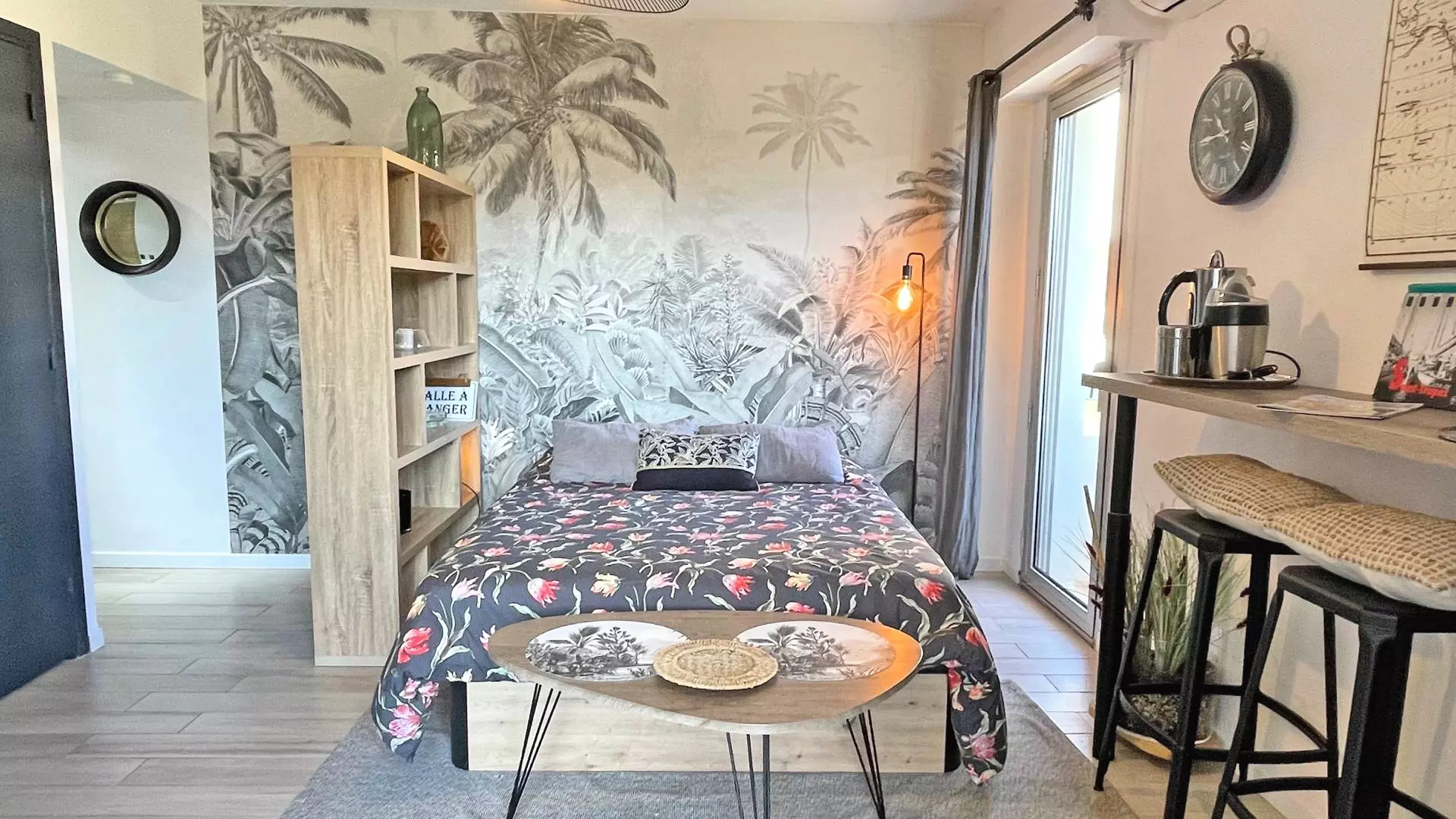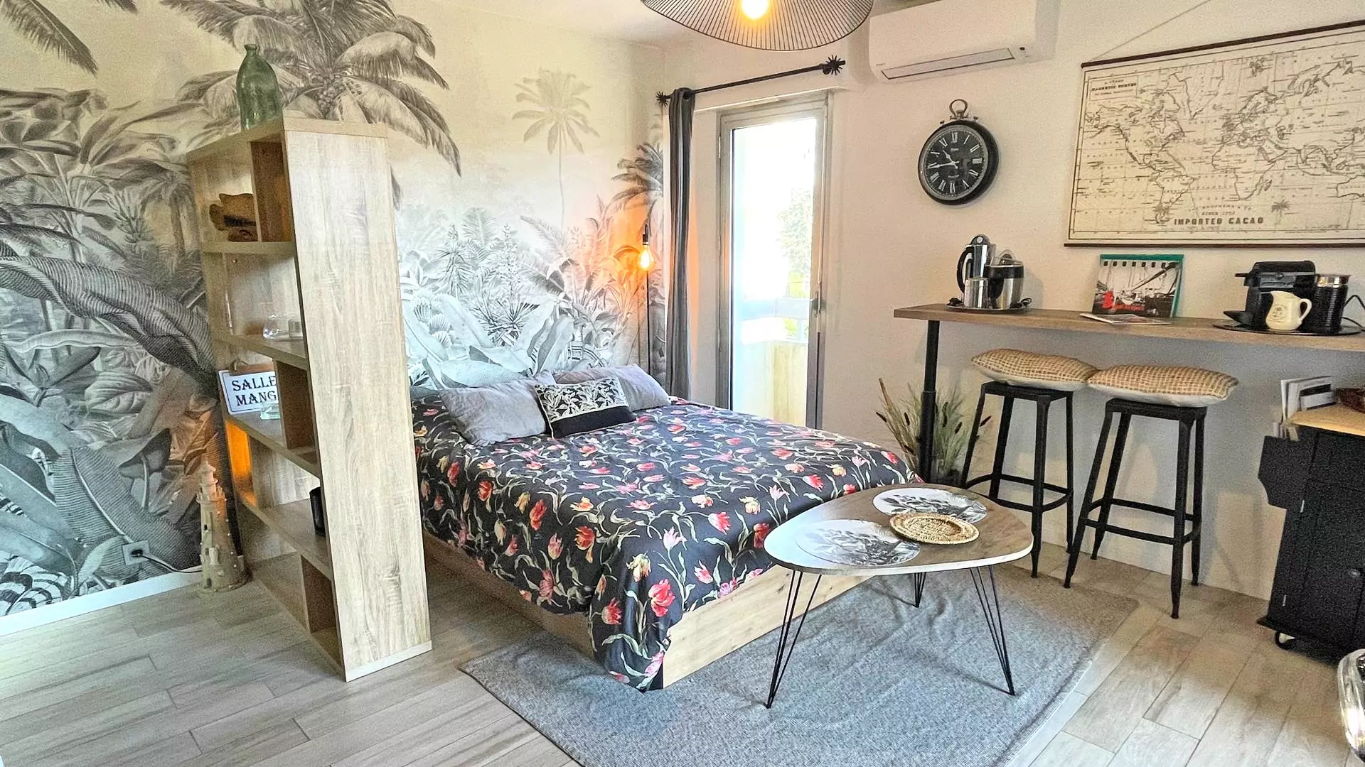 - Air-conditioned main room with 140cm bed, coffee table, flat screen television, bar with stools and storage