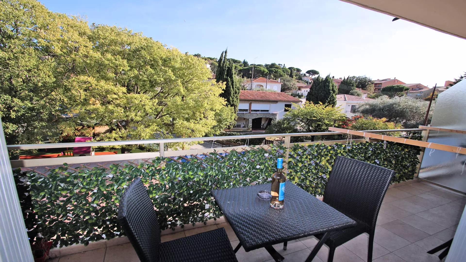 - 10m² terrace with dining furniture, clothes horse