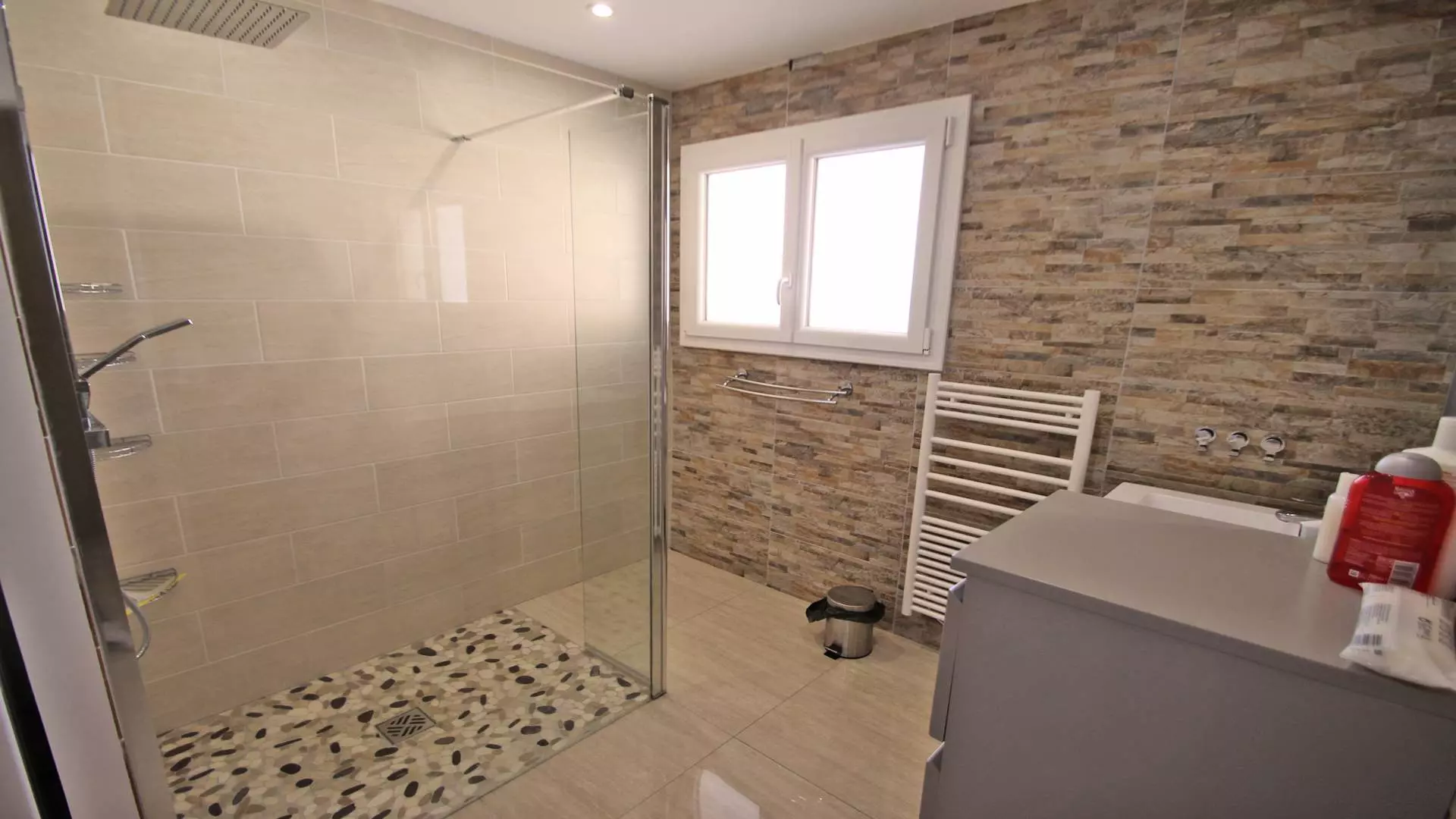 - Shower room with shower, vanity unit, washing machine