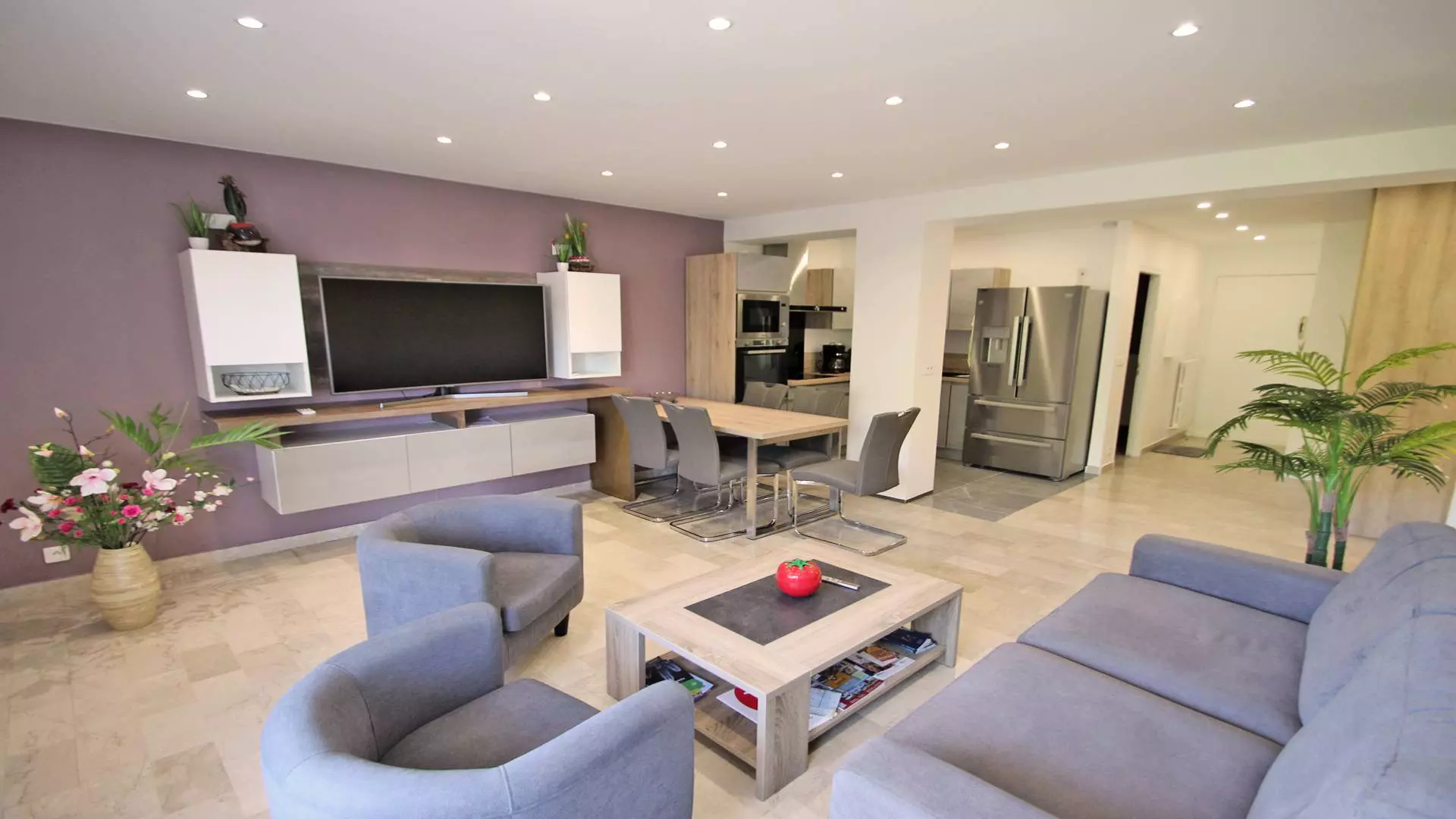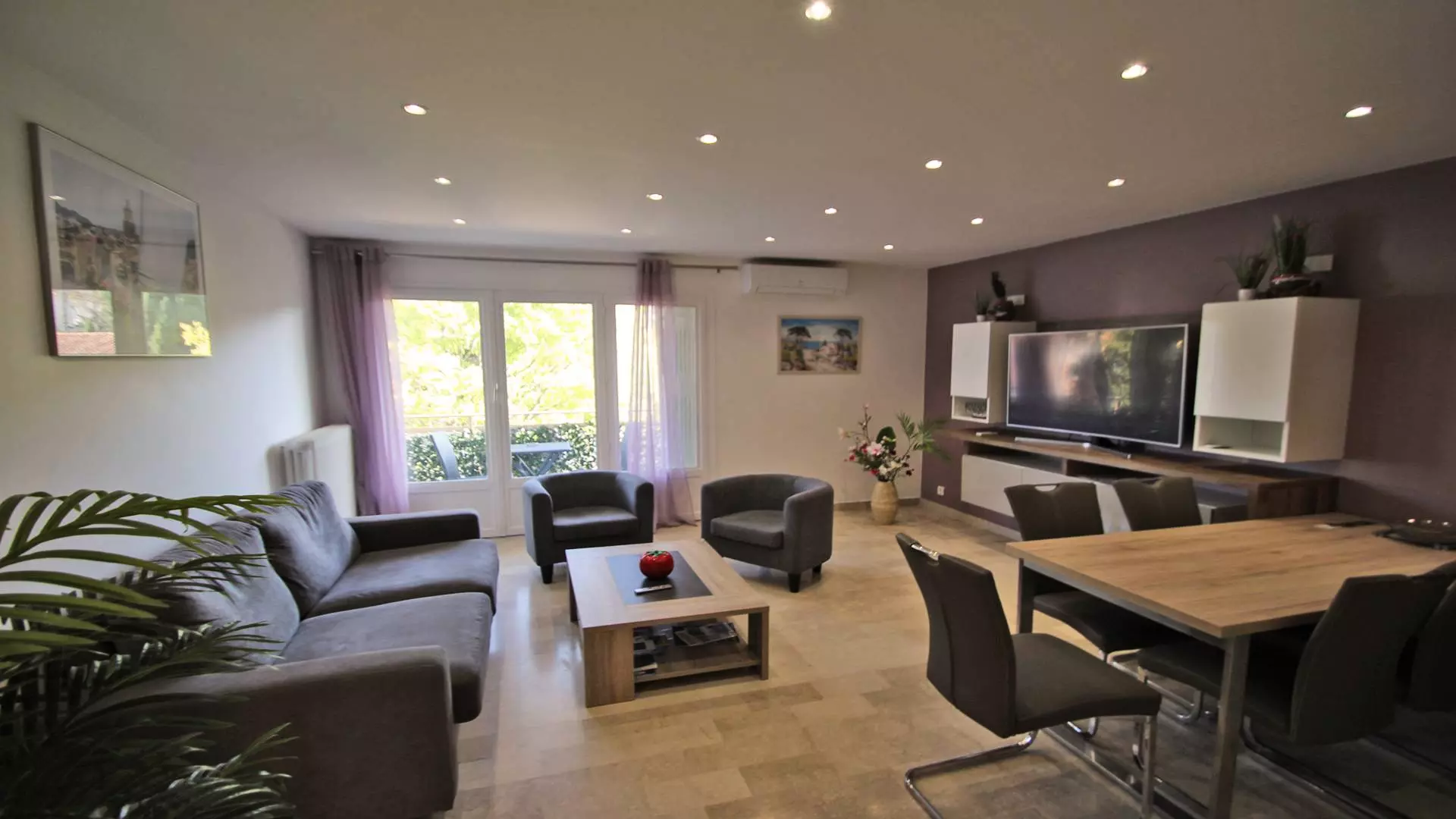 - Air-conditioned living room with lounge including sofa, armchairs, television and dining area with table and chairs, terrace access