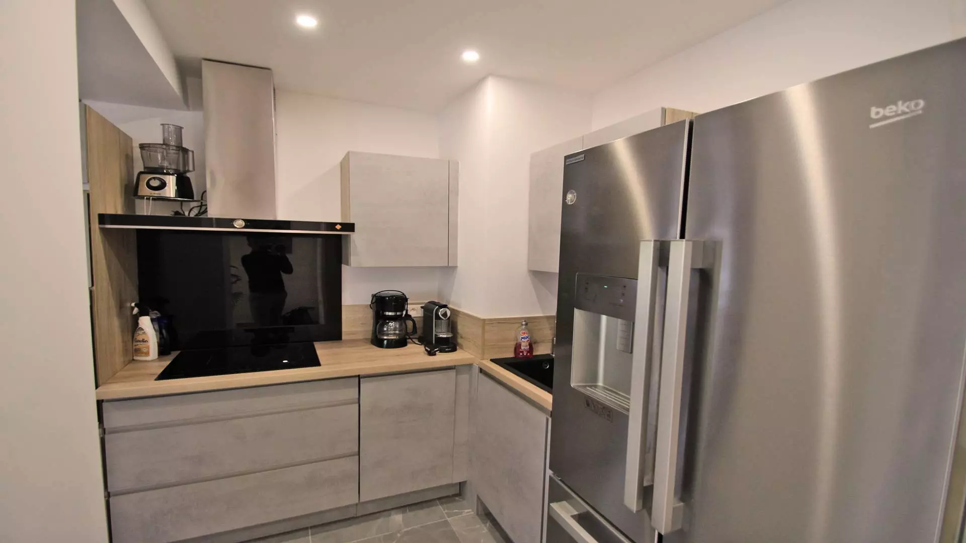 - American kitchen with oven, refrigerator, freezer, dishwasher, hotplates, Nespresso coffee machine, microwave, kettle, various utensils and dishes
