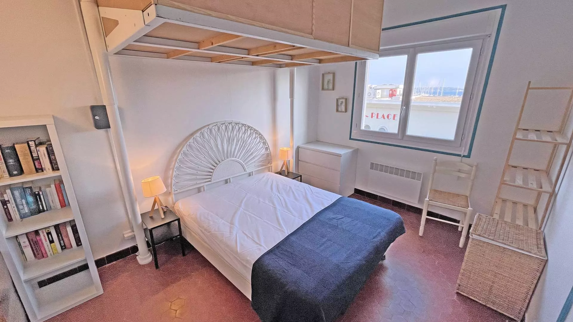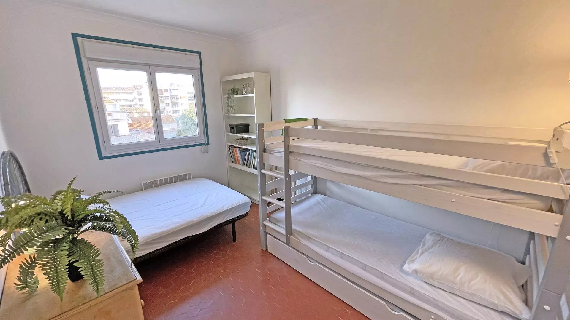 - Bedroom 2: Double bed 140cm and 3 single beds 90cm (bunk beds + trundle bed) with cupboard, view to the rear