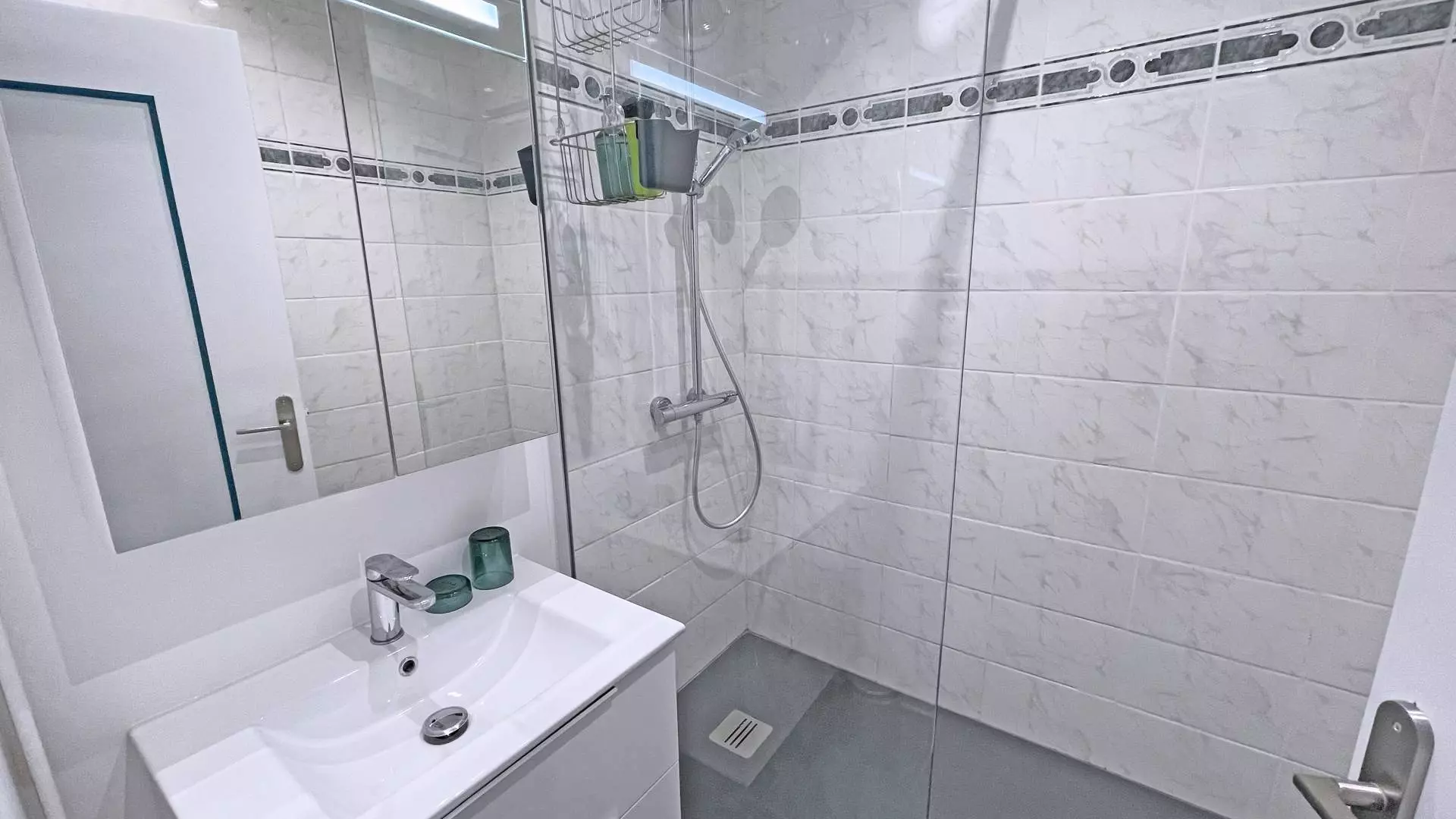- Renovated bathroom with shower, vanity unit, mirror and towel dryer