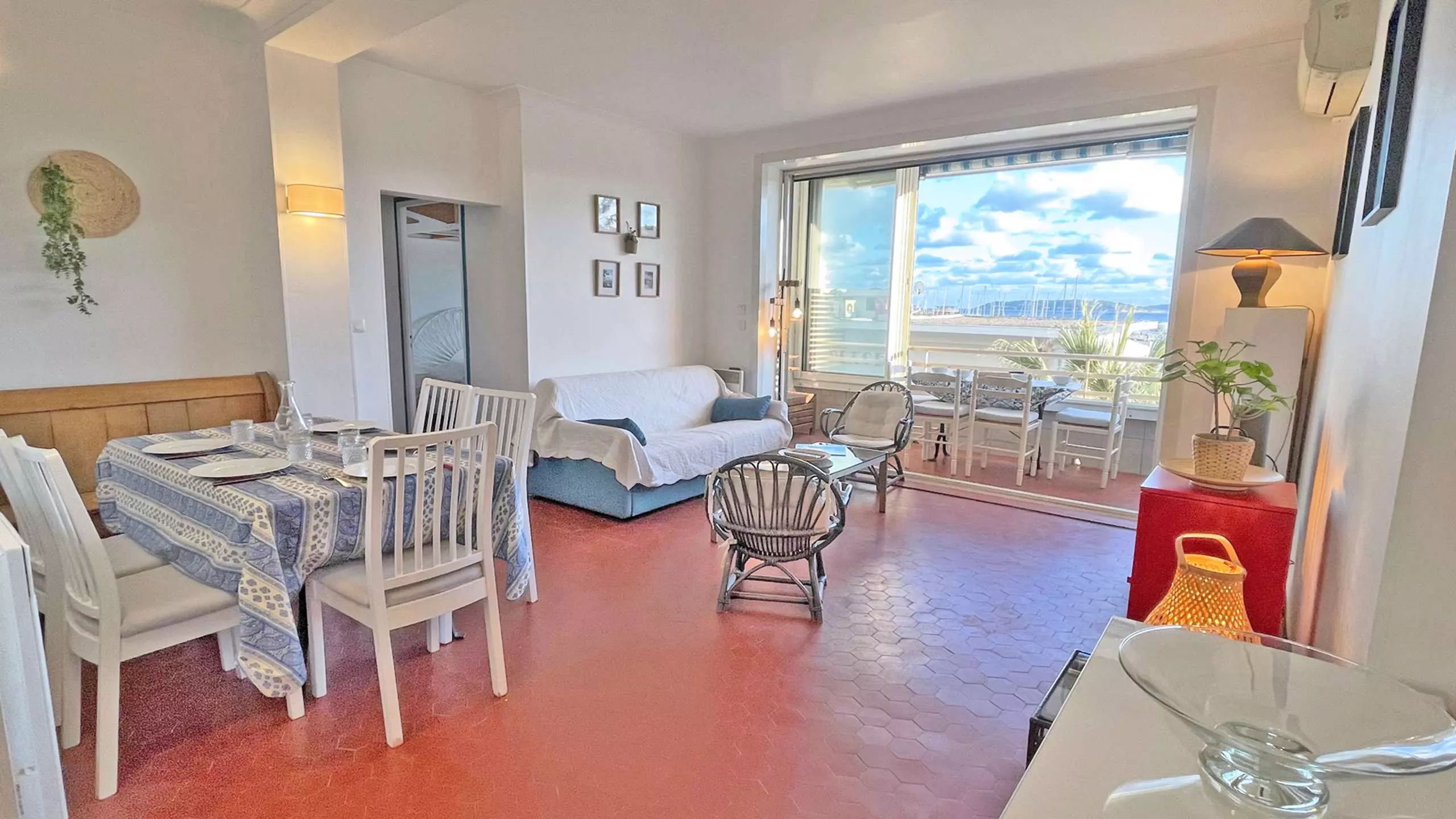- Loggia with dining furniture, awning and sea view