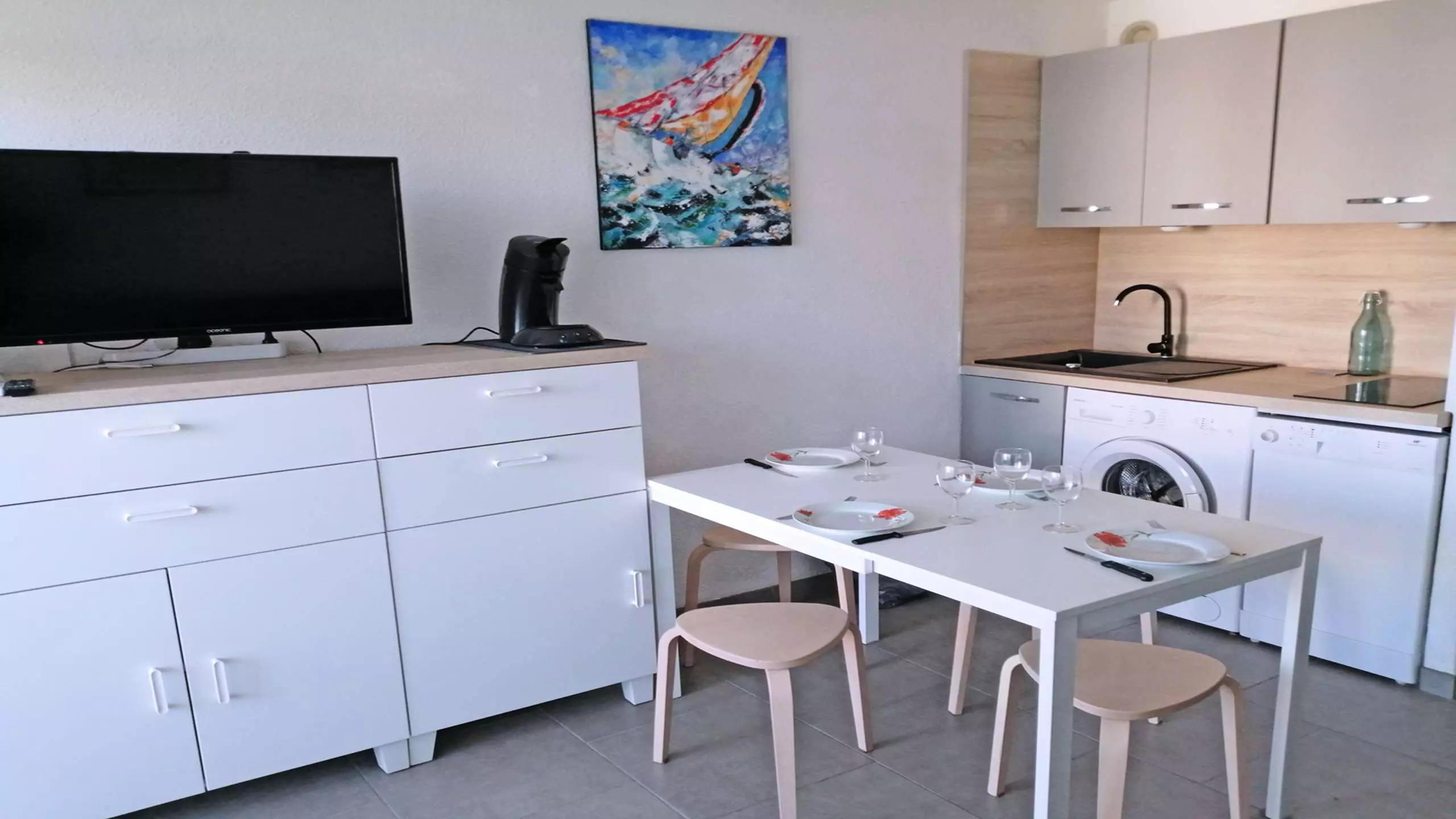 - Fully equipped kitchenette: refrigerator, freezer, washing machine, dishwasher, hotplates, microwave, Senseo coffee machine, kettle, toaster, dishes and various utensils, etc.
