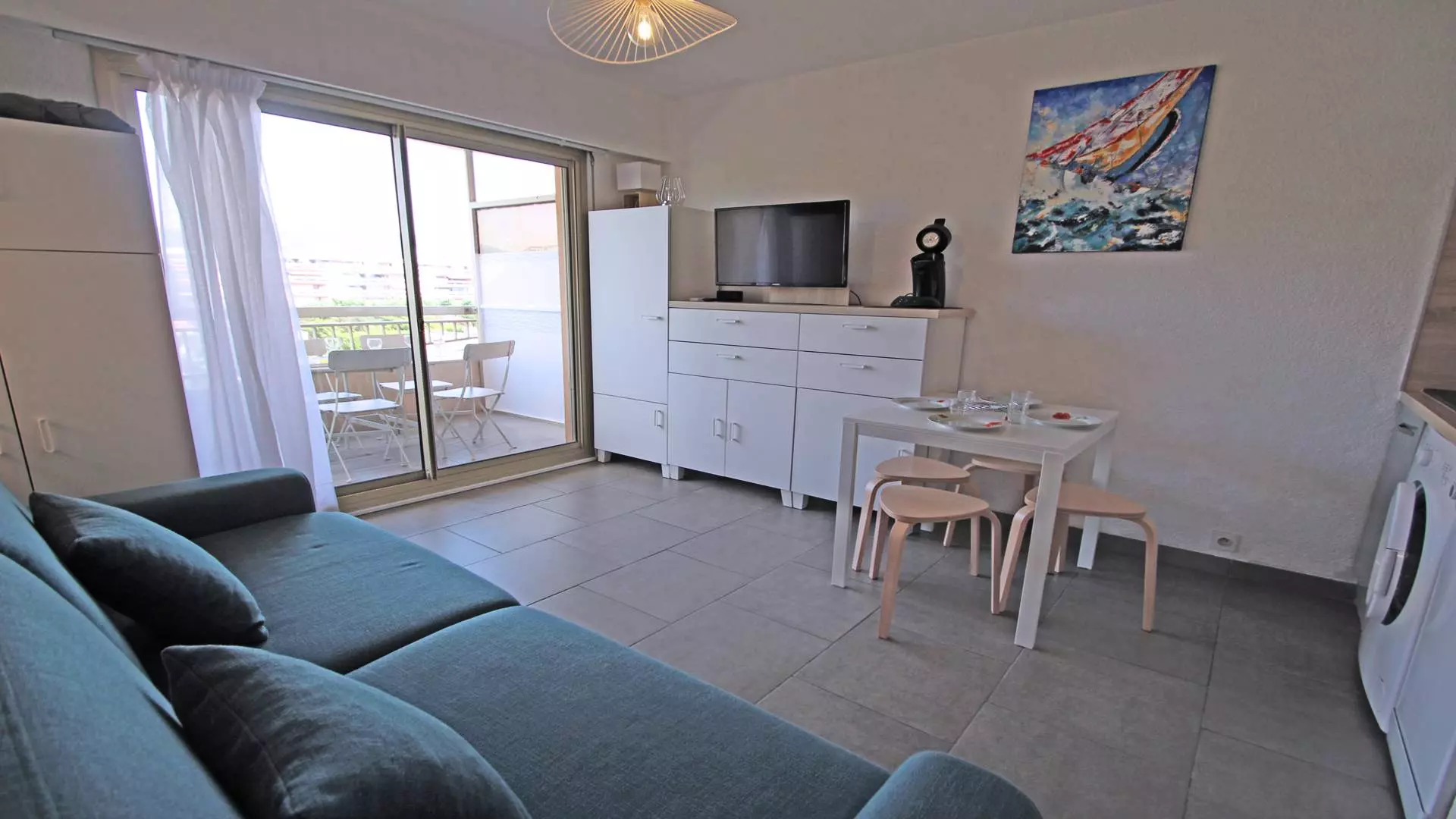 - Air-conditioned living room with 160cm "rapido" sofa bed, dining area, terrace access