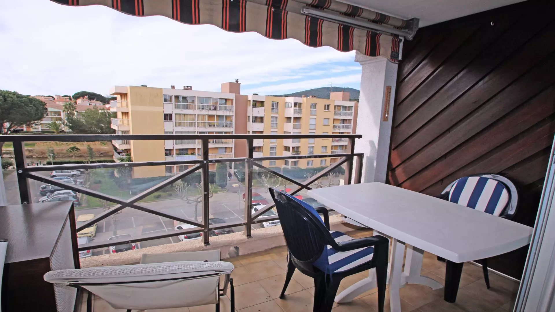 - West-facing terrace with outdoor furniture and awning