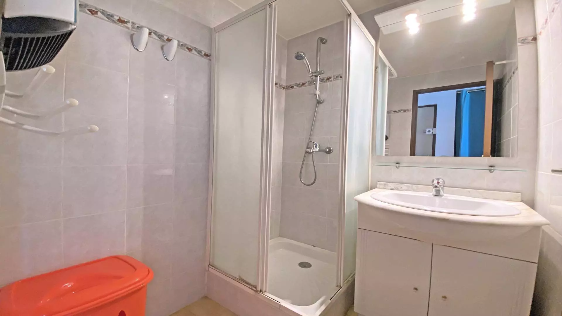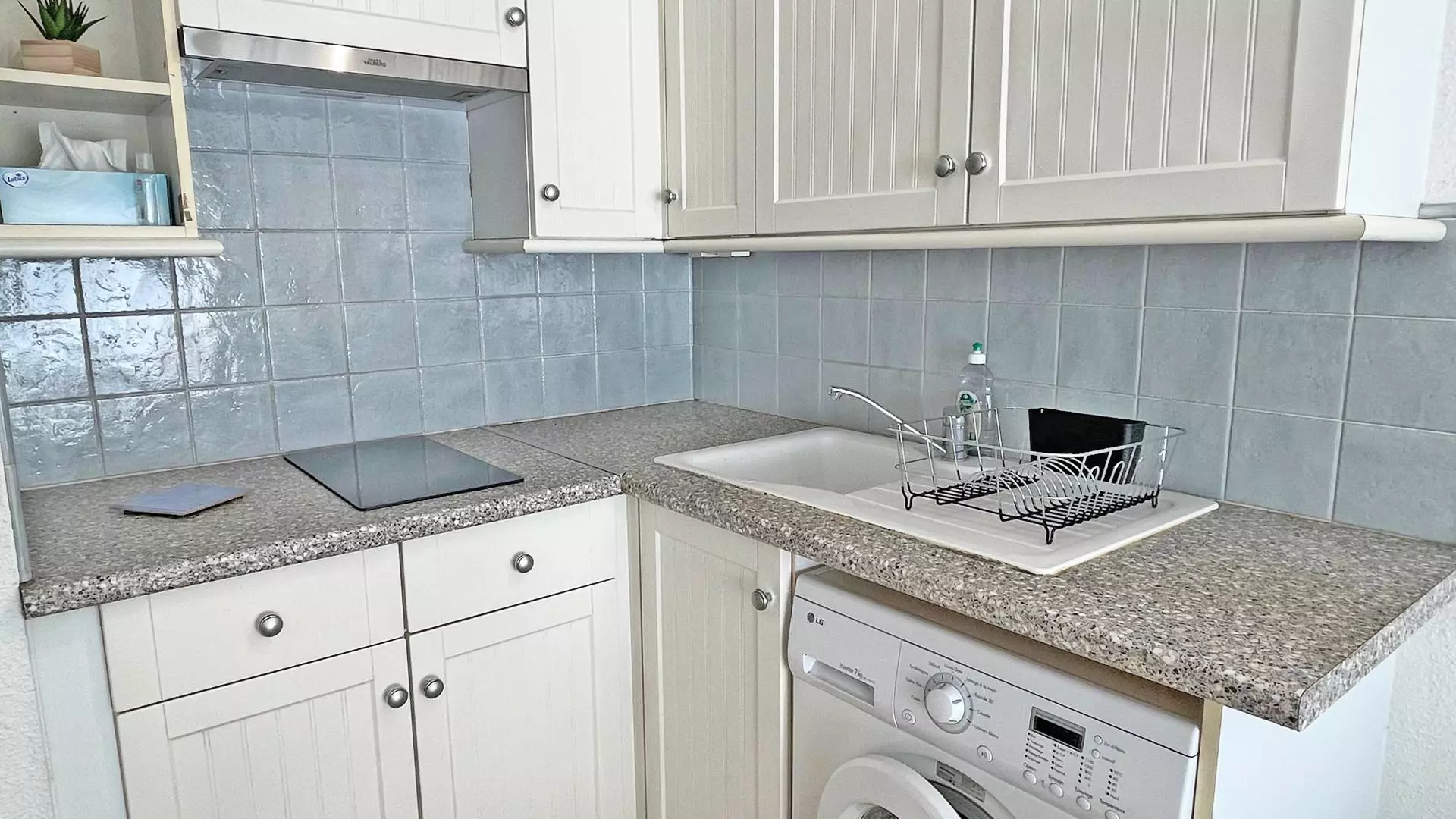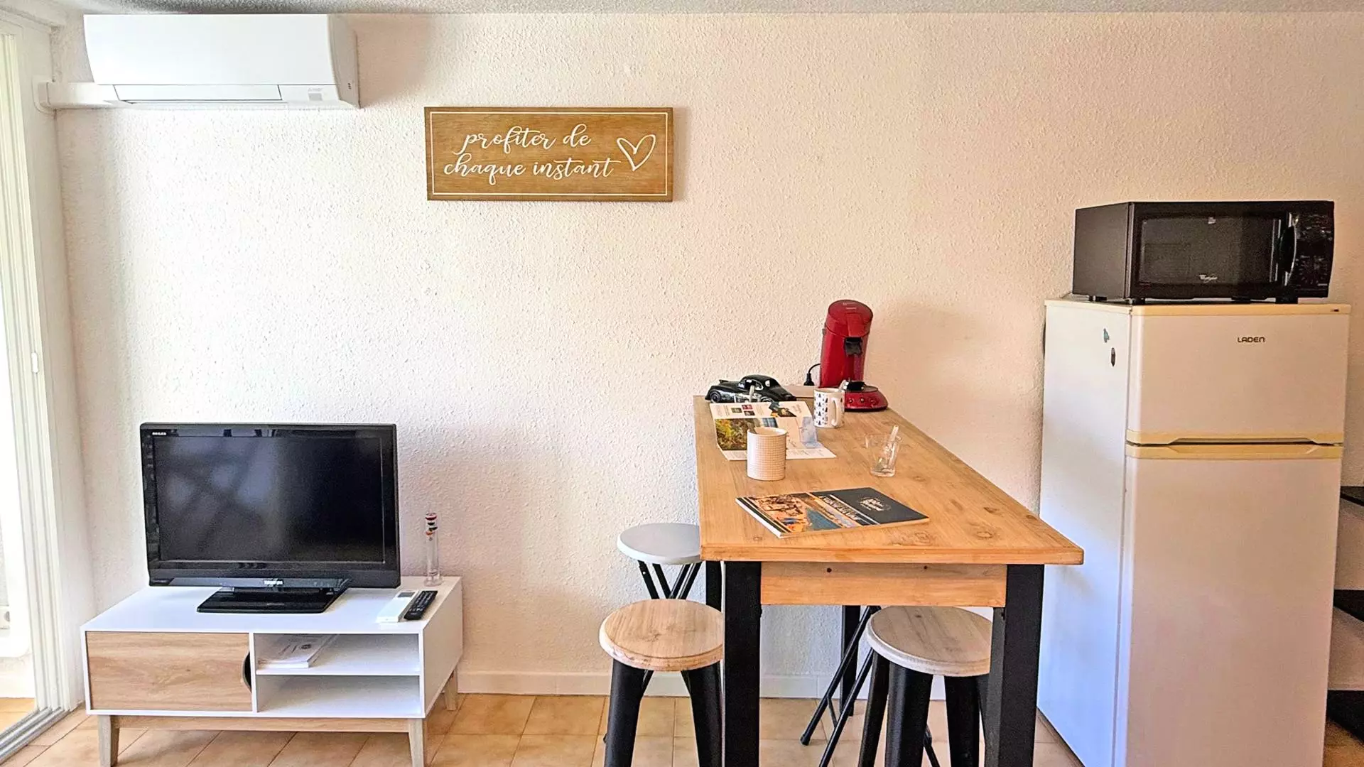 - Open kitchen with high table and 2 stools equipped with: refrigerator with freezer compartment, microwave, 2-burner ceramic hob, extractor fan, Senséo coffee machine, washing machine, dishes and various utensils