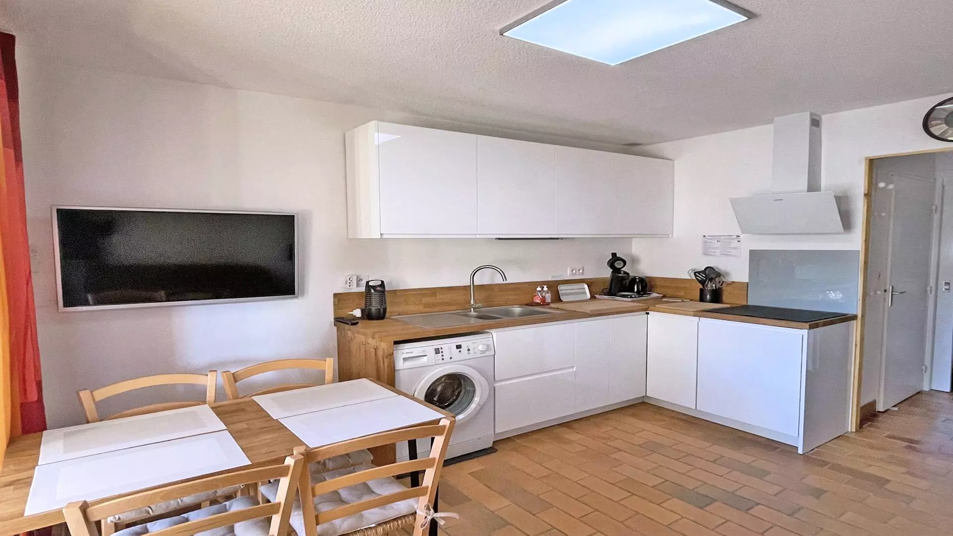 - Living room including a dining area with table and chairs, a BZ sofa bed (140), television, terrace access
