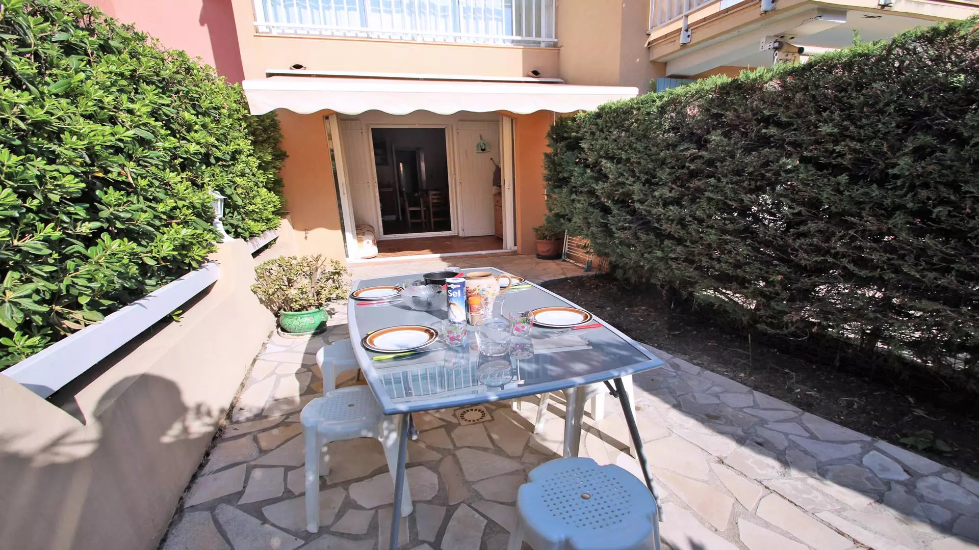 - 20m² terrace with dining furniture, manual awning, clothes horse, gate