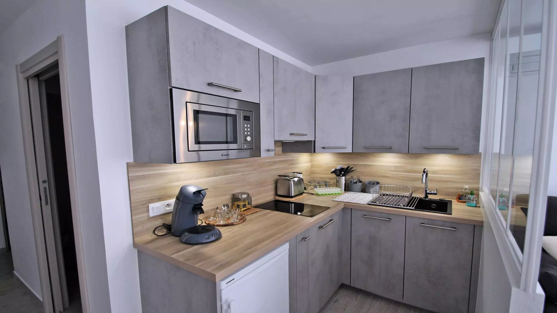 - Open and equipped kitchenette with 2-burner hob, "Senseo" coffee machine, refrigerator with freezer compartment, microwave oven, toaster, crockery and various utensils