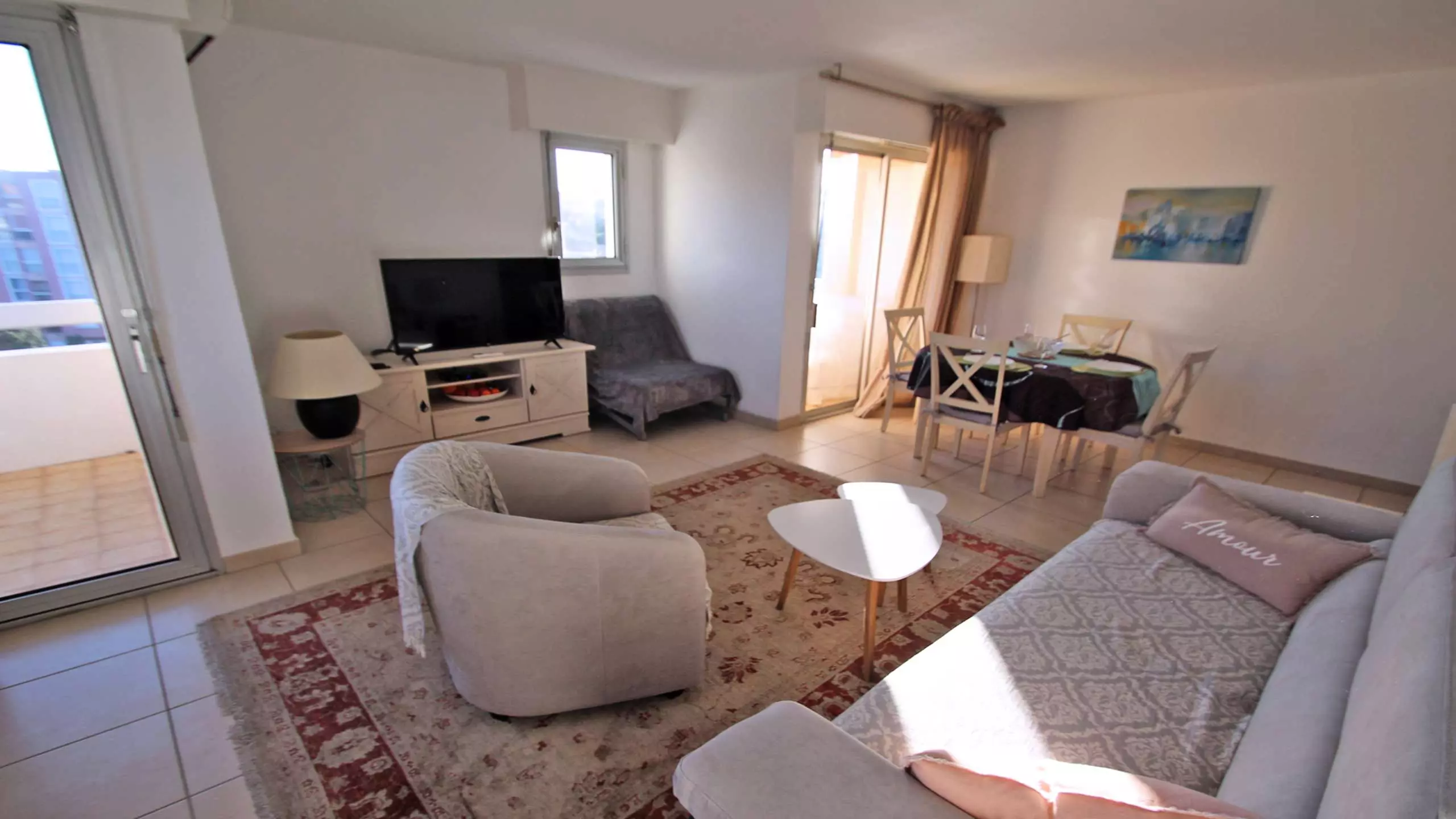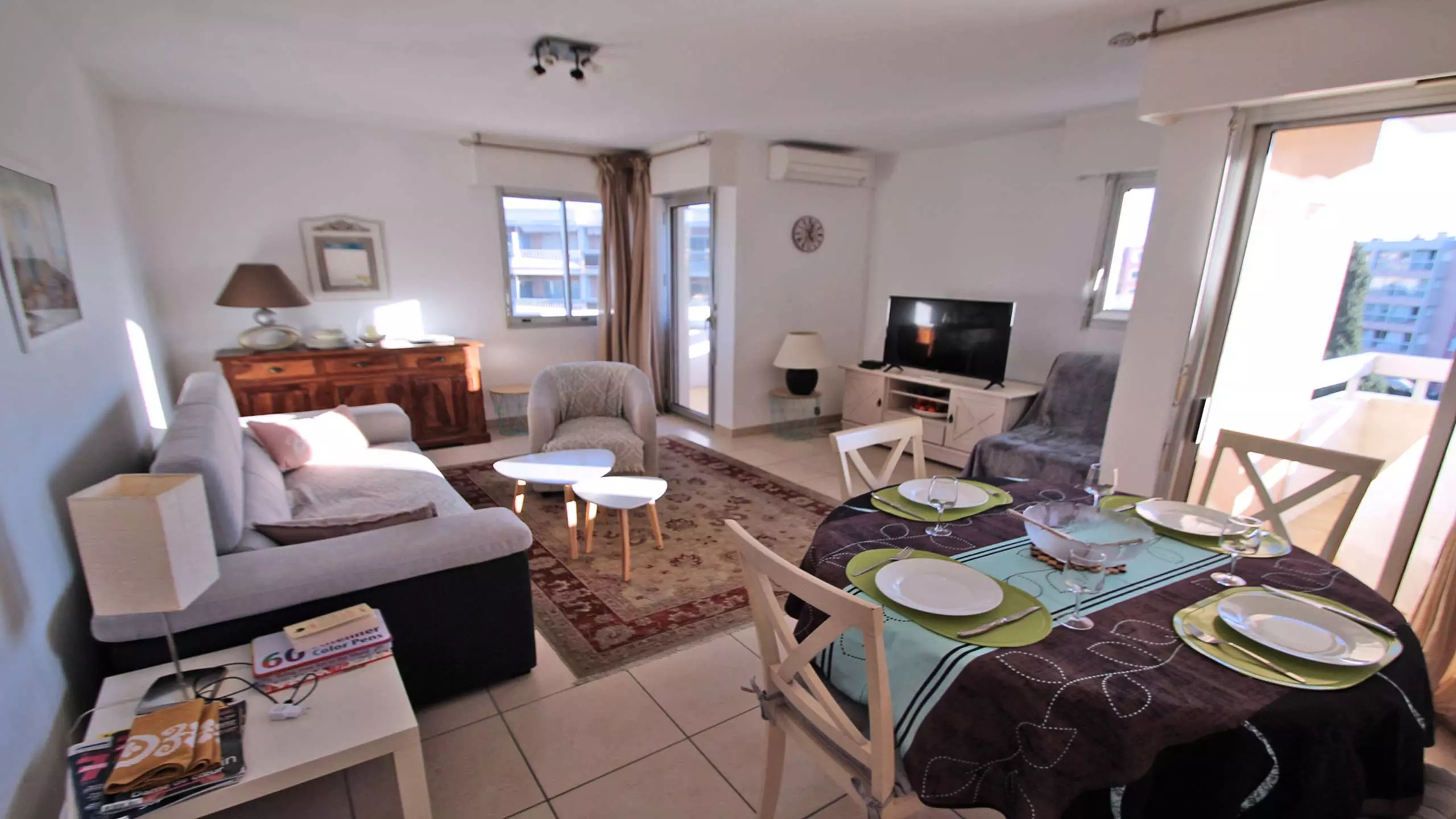 - Beautiful air-conditioned living room containing a living room with a 3-seater sofa, 1 armchair, 1 pouf, 1 BZ type sofa (90), flat screen television with CanalSat subscription as well as a dining area with table and 6 chairs: access to the balconies.