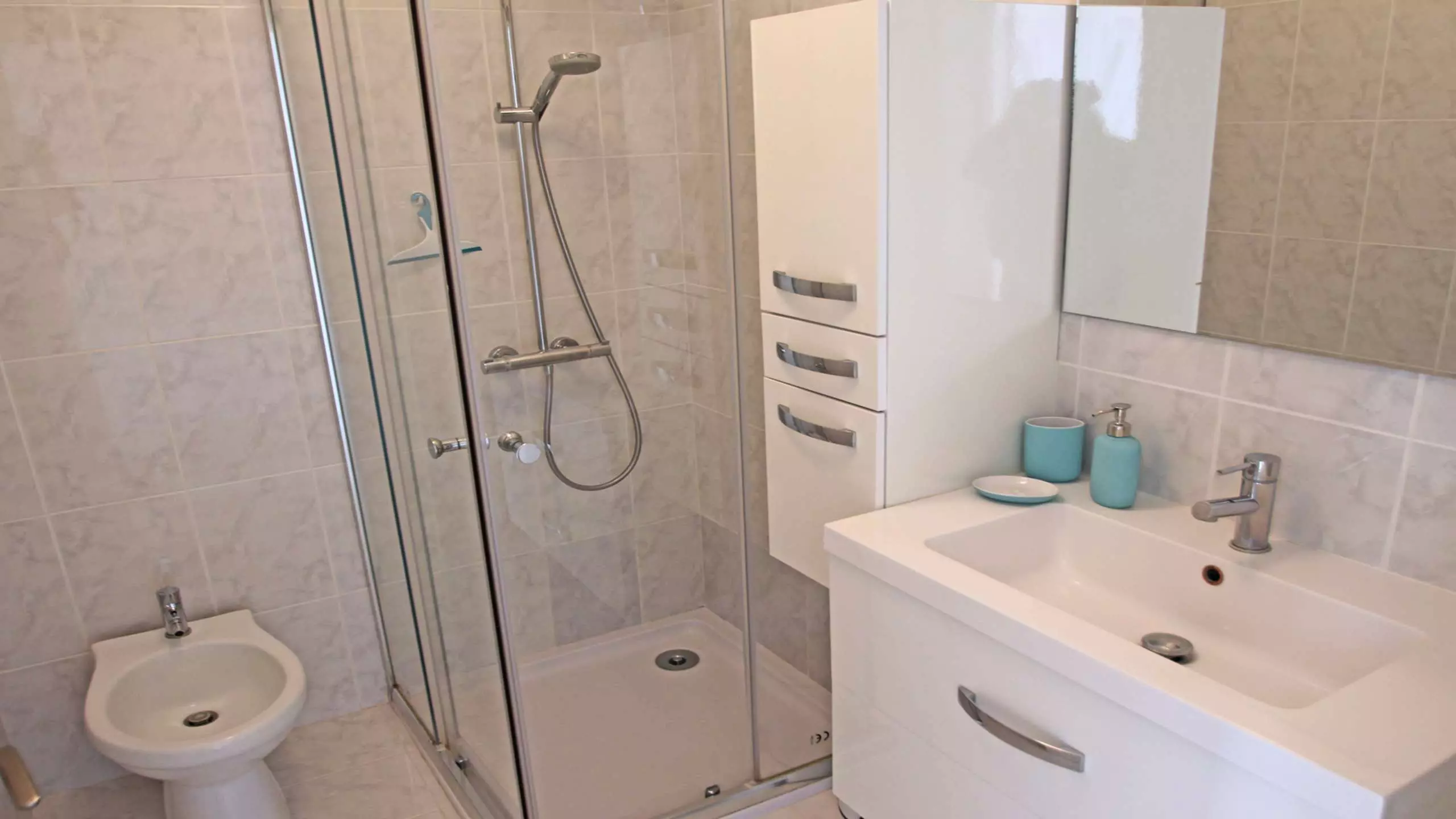 - Bathroom with shower, vanity unit, mirror, clothes dryer