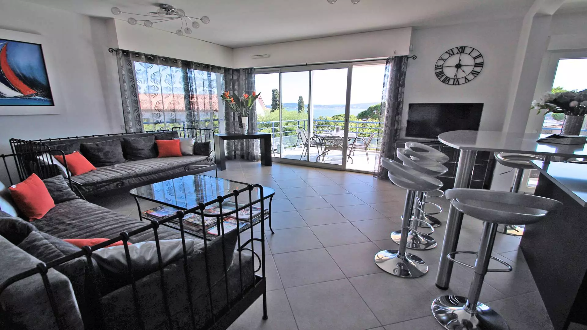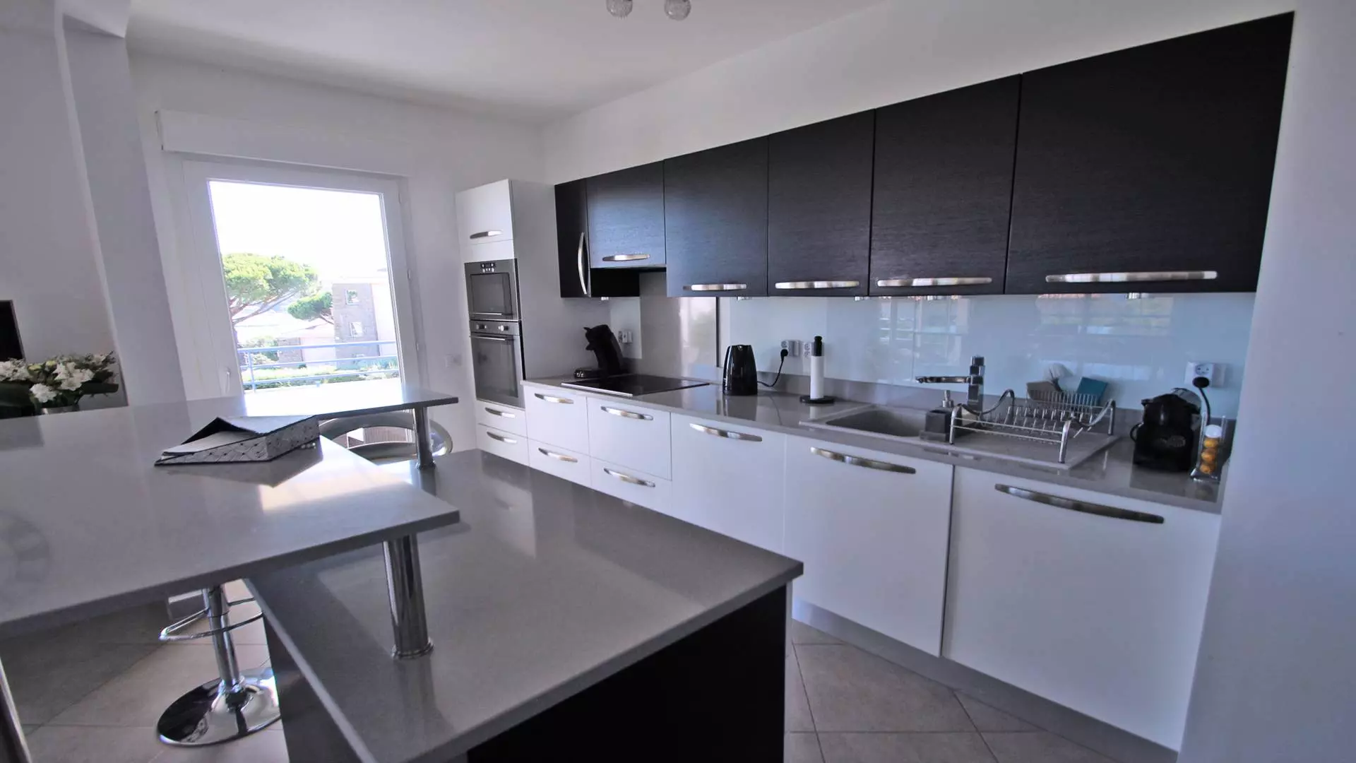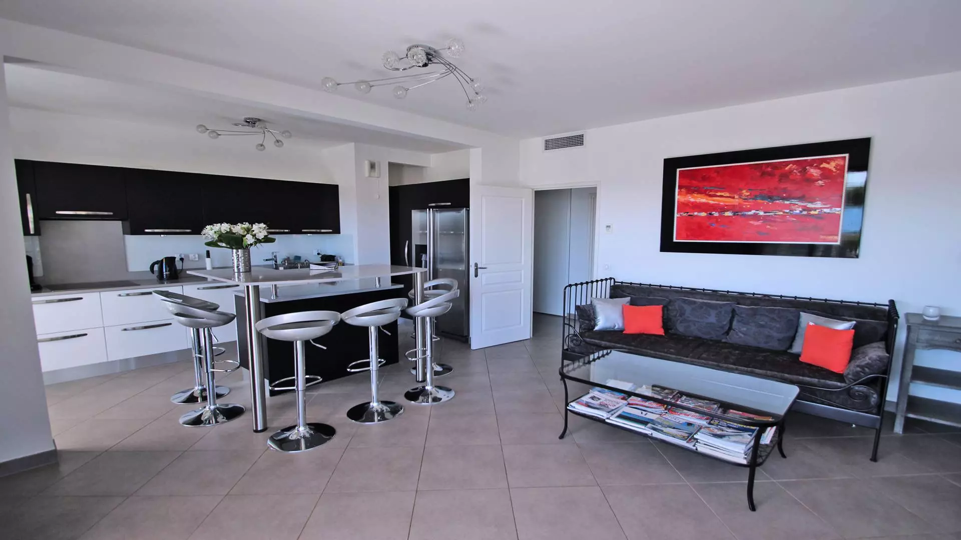 - Living room with lounge area, television, terrace access - fully equipped American kitchen: American fridge (freezer section), 3-burner hob, oven, microwave, dishwasher, washing machine, Nespresso / Senseo coffee machine, kettle, various utensils and crockery