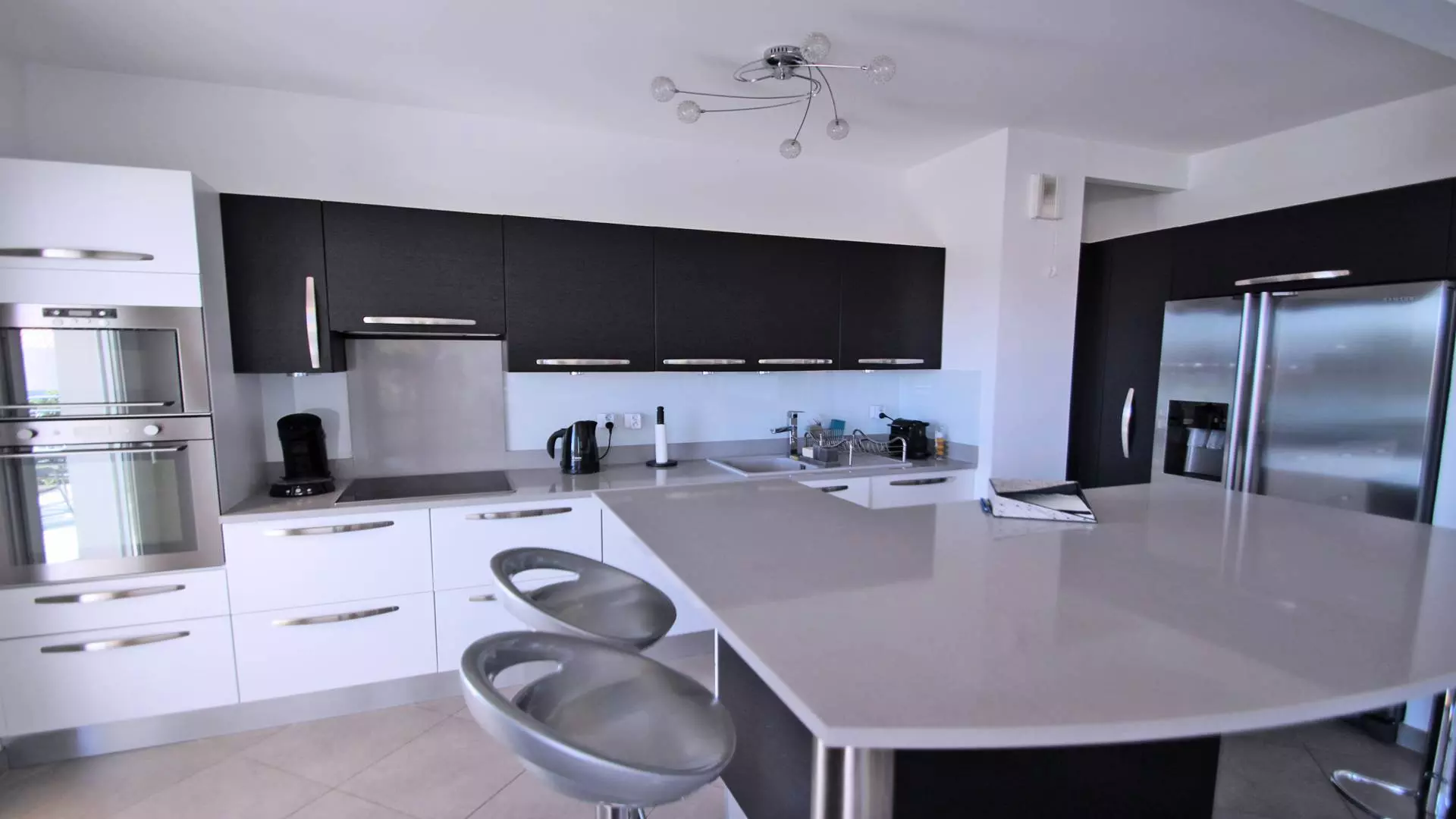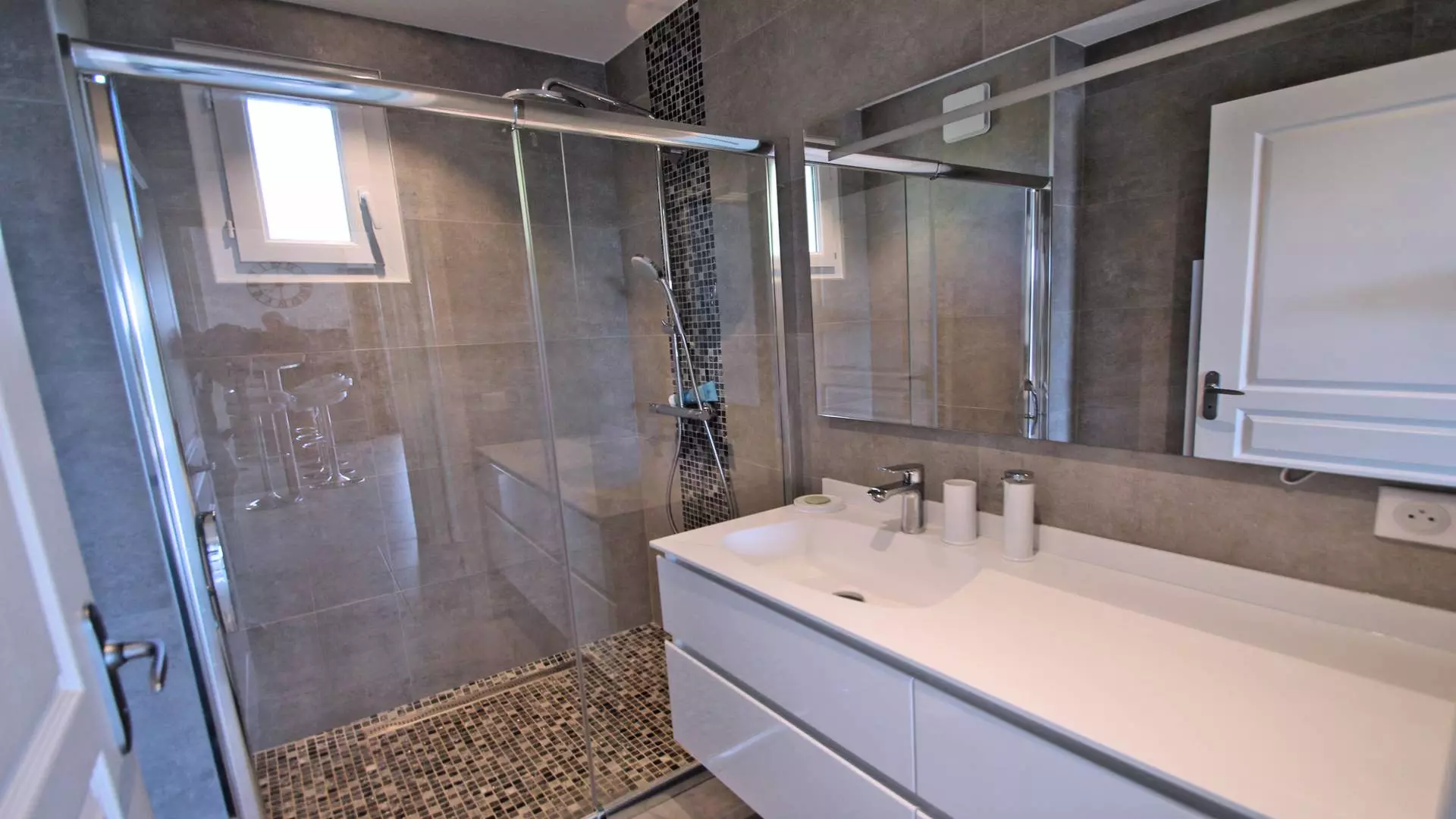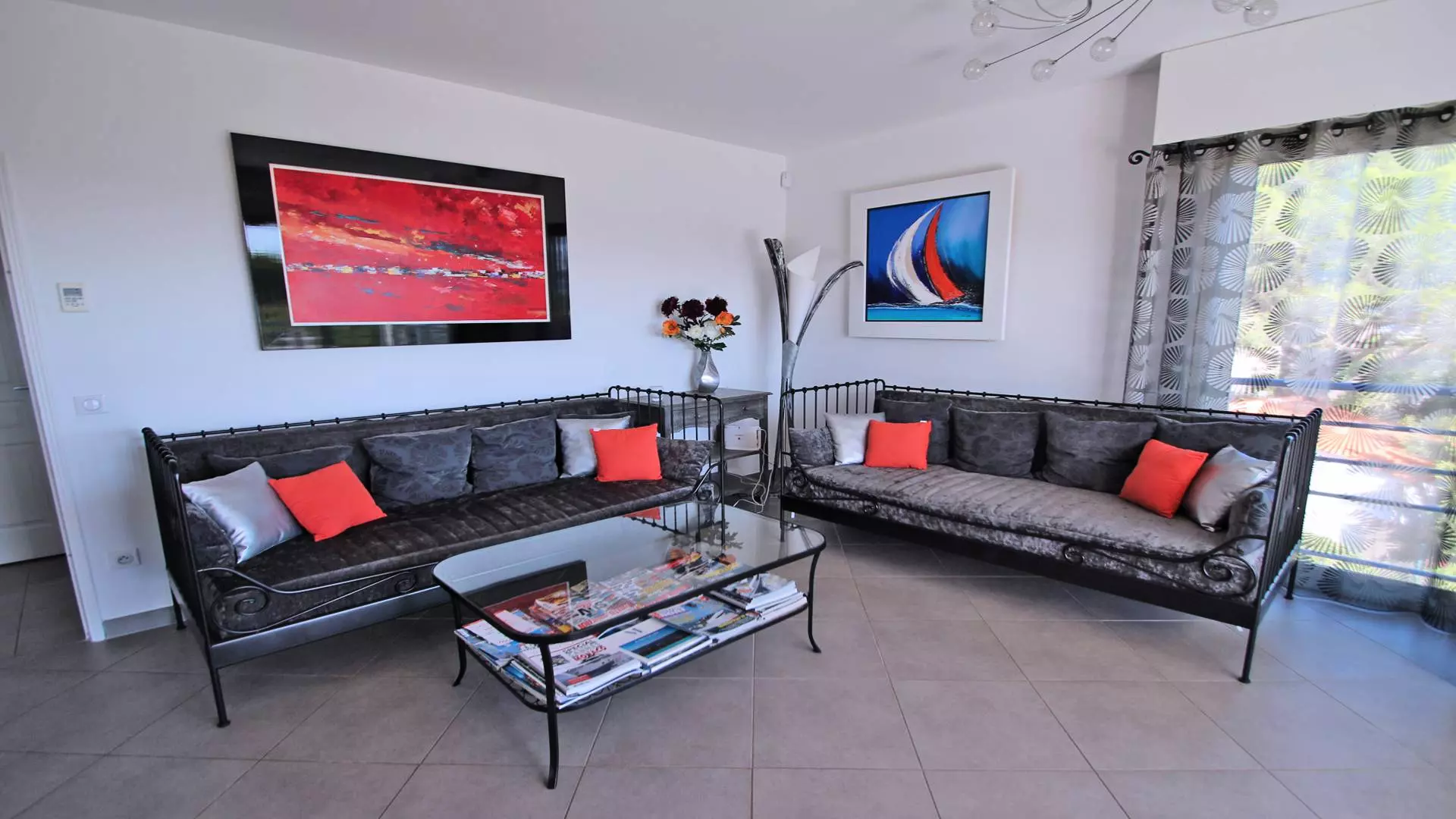 - Living room with lounge area, television, terrace access - fully equipped American kitchen: American fridge (freezer section), 3-burner hob, oven, microwave, dishwasher, washing machine, Nespresso / Senseo coffee machine, kettle, various utensils and crockery