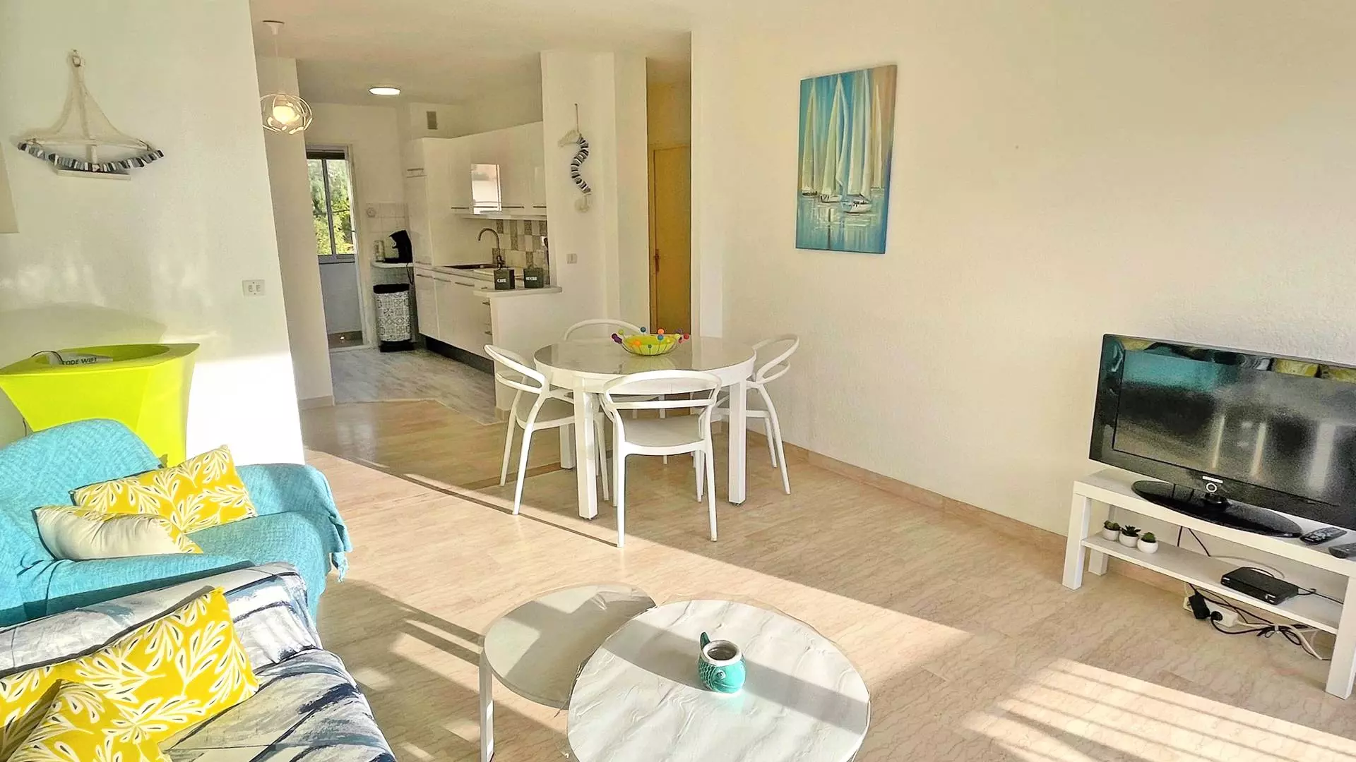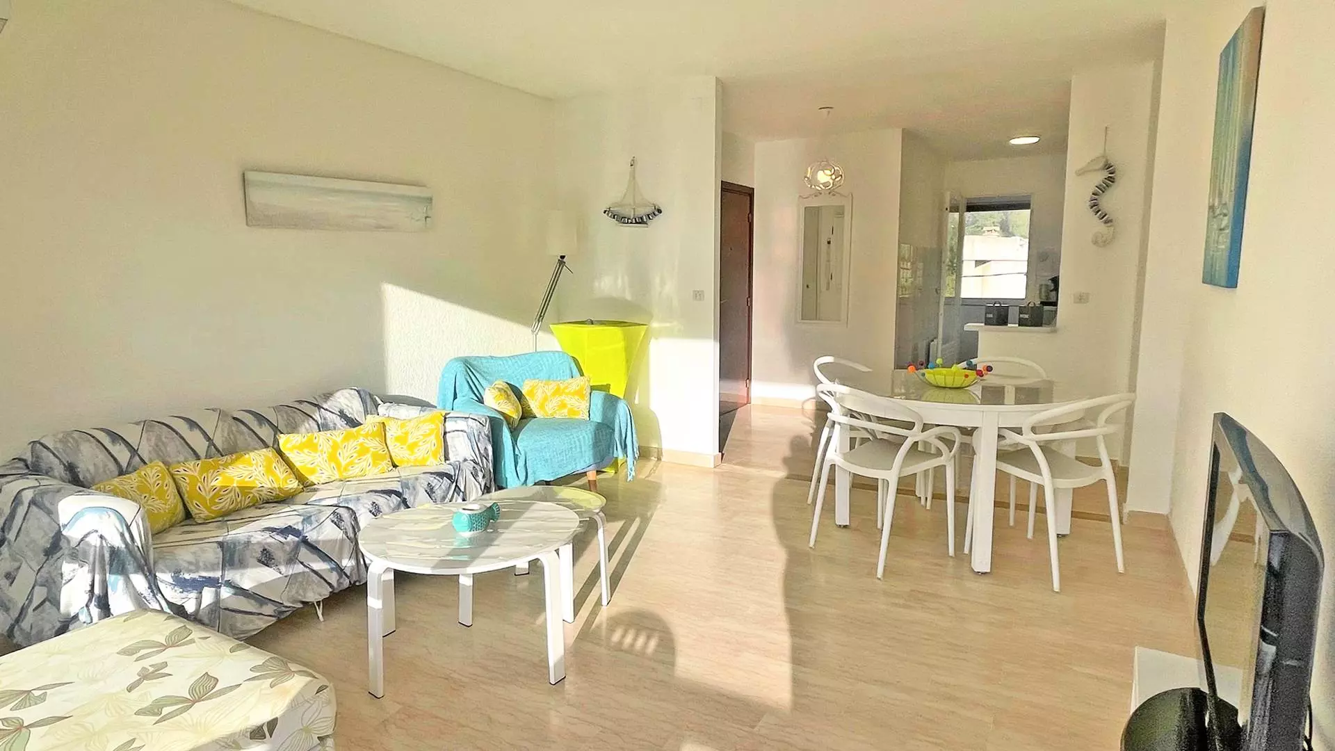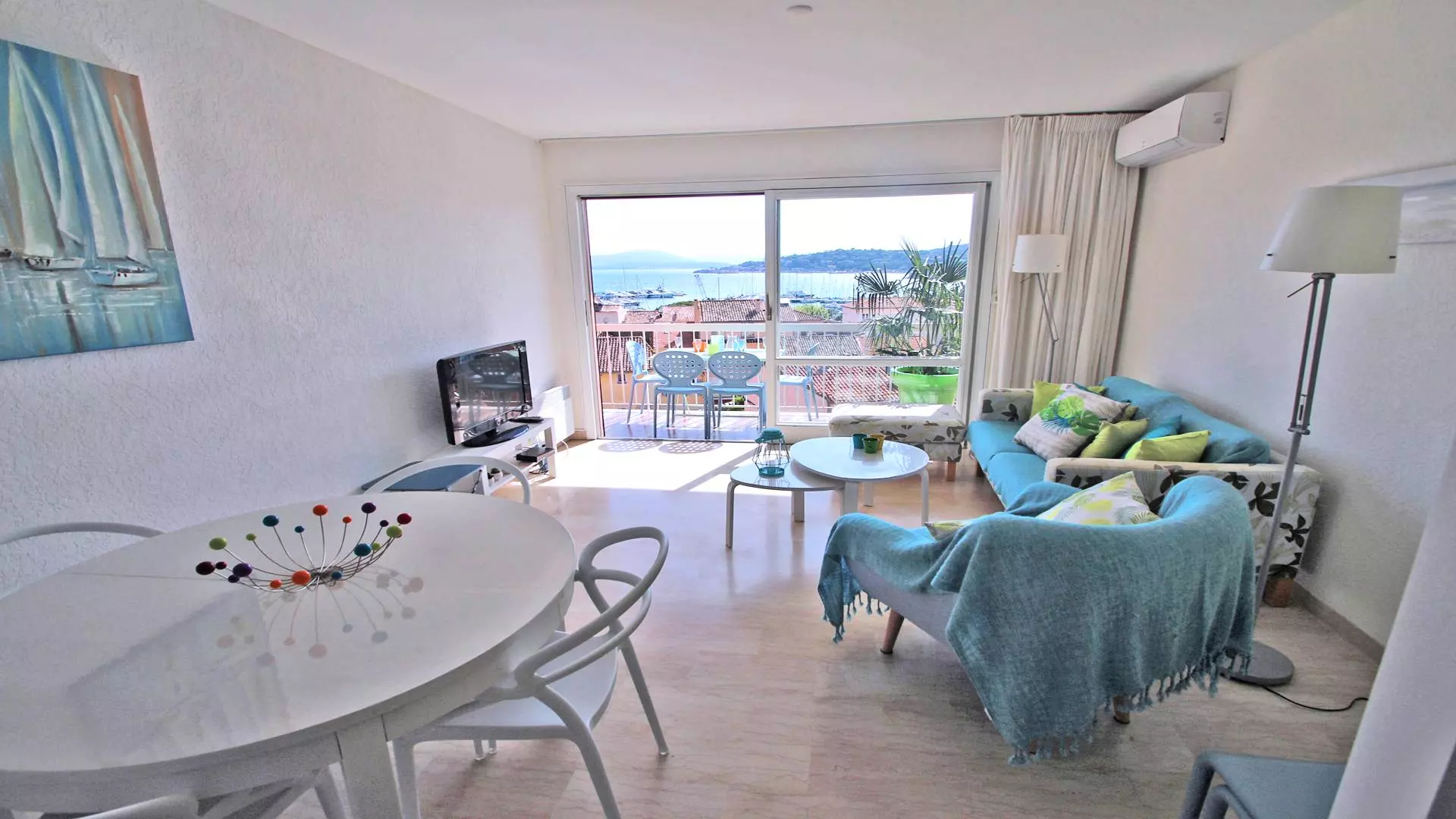 - Air-conditioned living room with dining area and lounge area with sofa, armchair and television, terrace access
