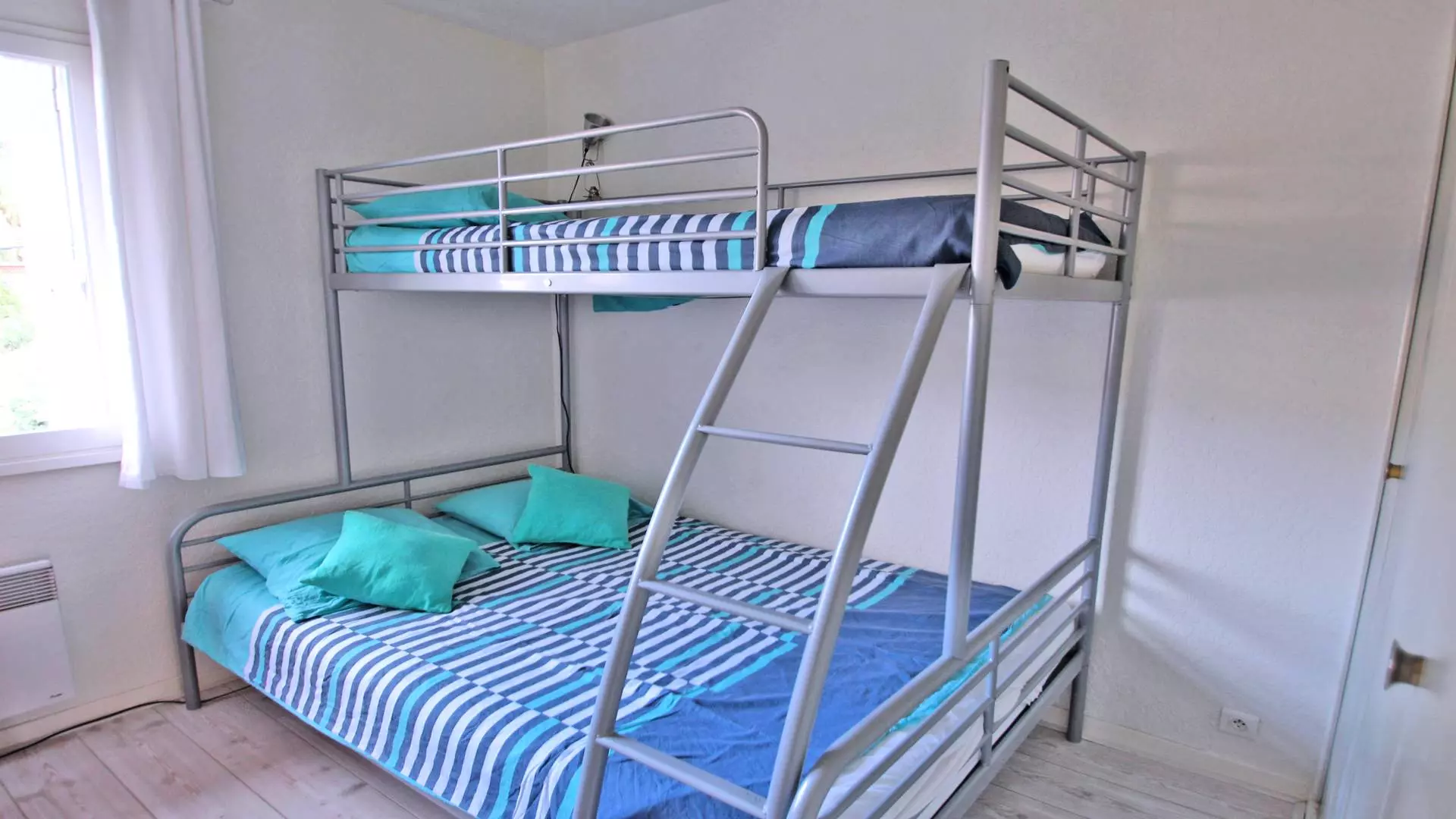 - Bedroom 2 with bunk beds: 140cm at the bottom and 90cm at the top, cupboards