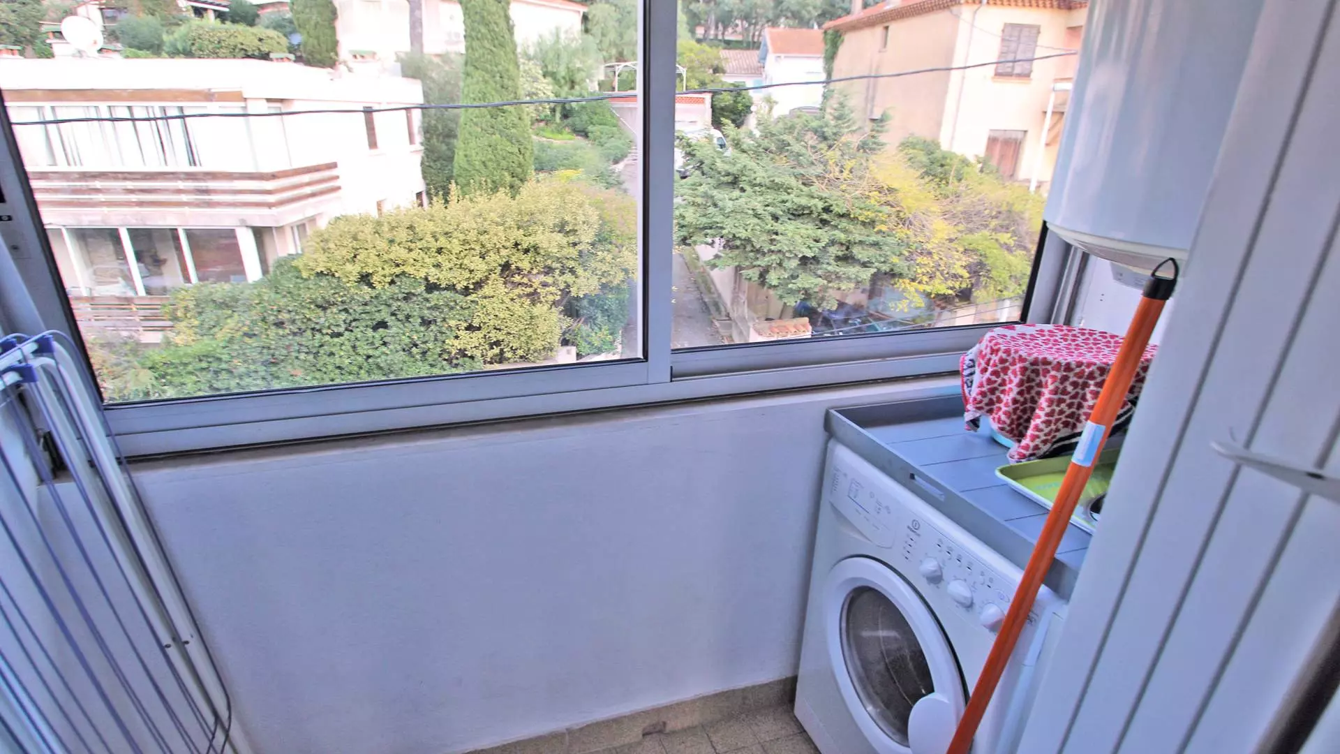 - Storage room with washing machine and ironing equipment