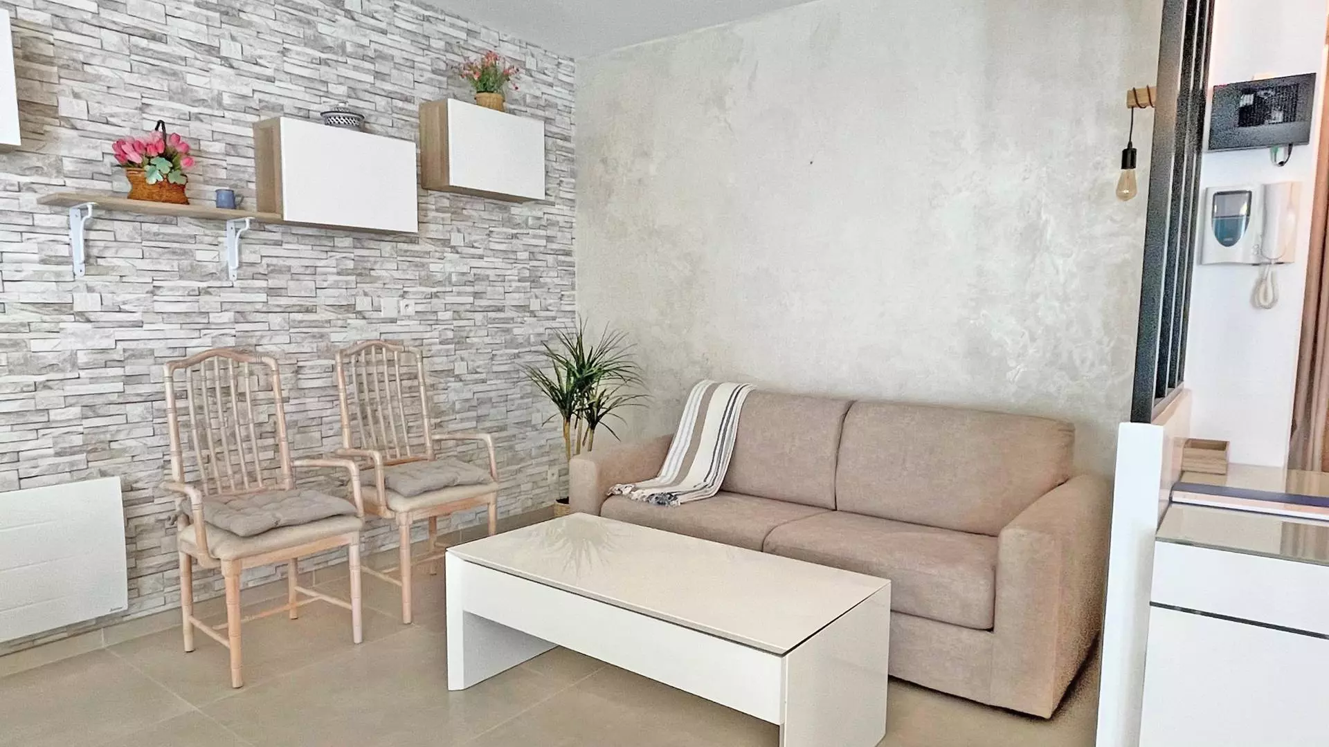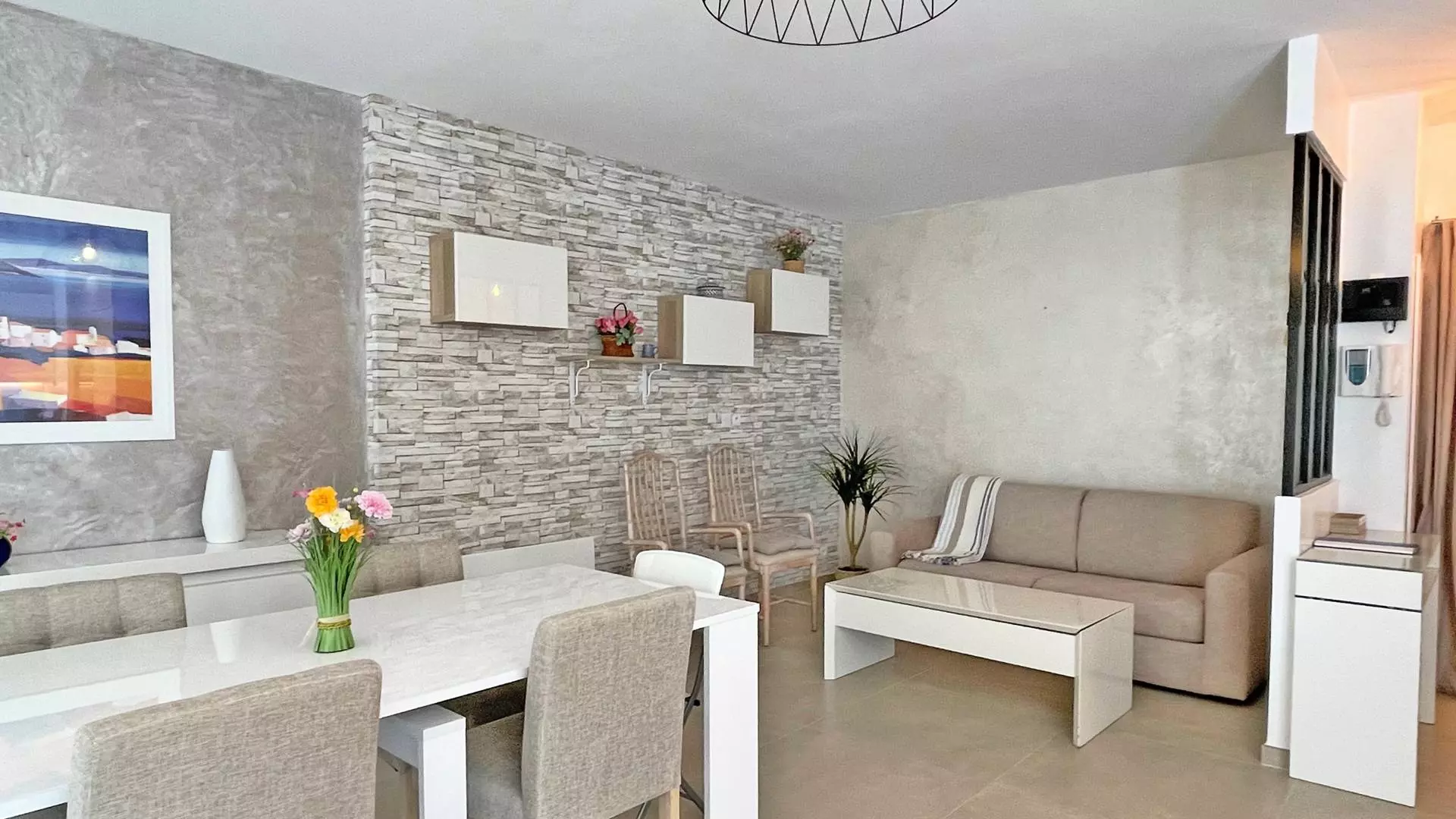 - Beautiful air-conditioned living room with dining area: table and chairs, lounge with convertible sofa (140cm) and television, terrace access