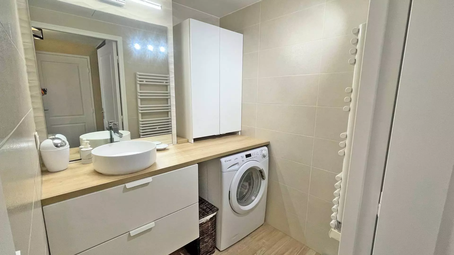 - Laundry room with 1 sink unit, washing machine and towel dryer