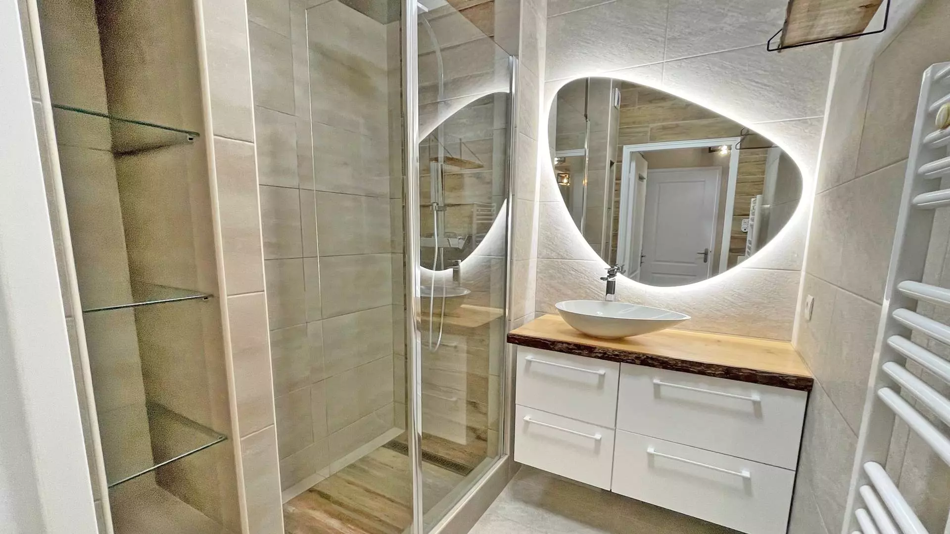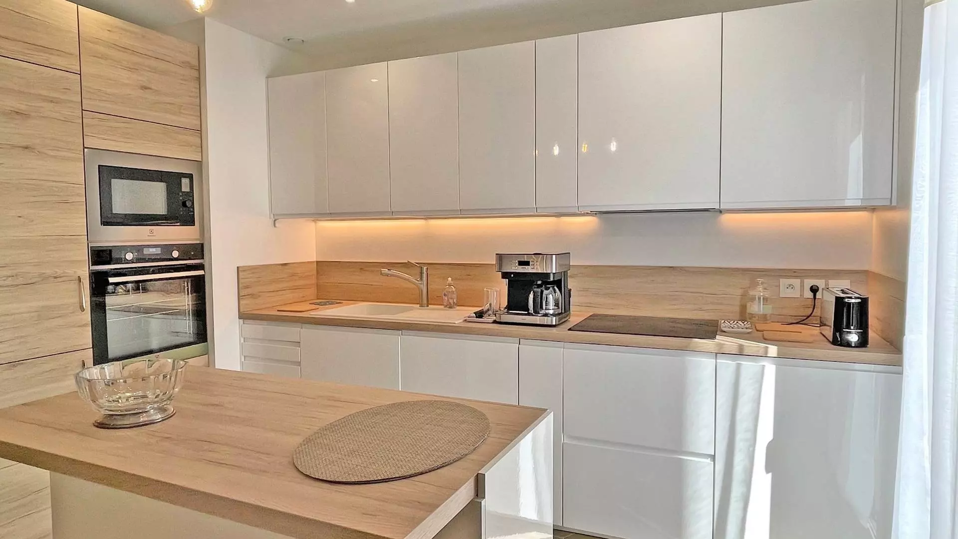 - Open kitchen equipped with 3-burner induction hob, fridge/freezer, oven, microwave, dishwasher, filter coffee maker/espresso/cappuccino-frothed milk/hot water etc.