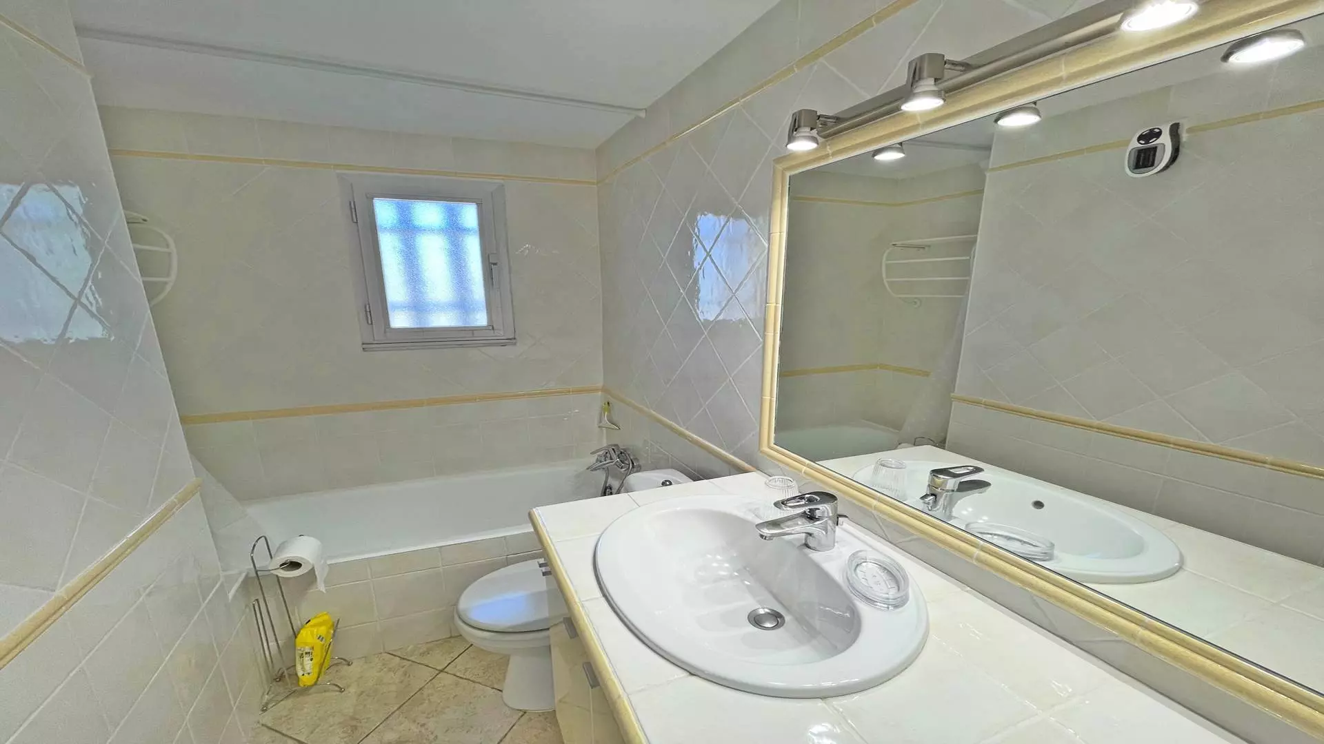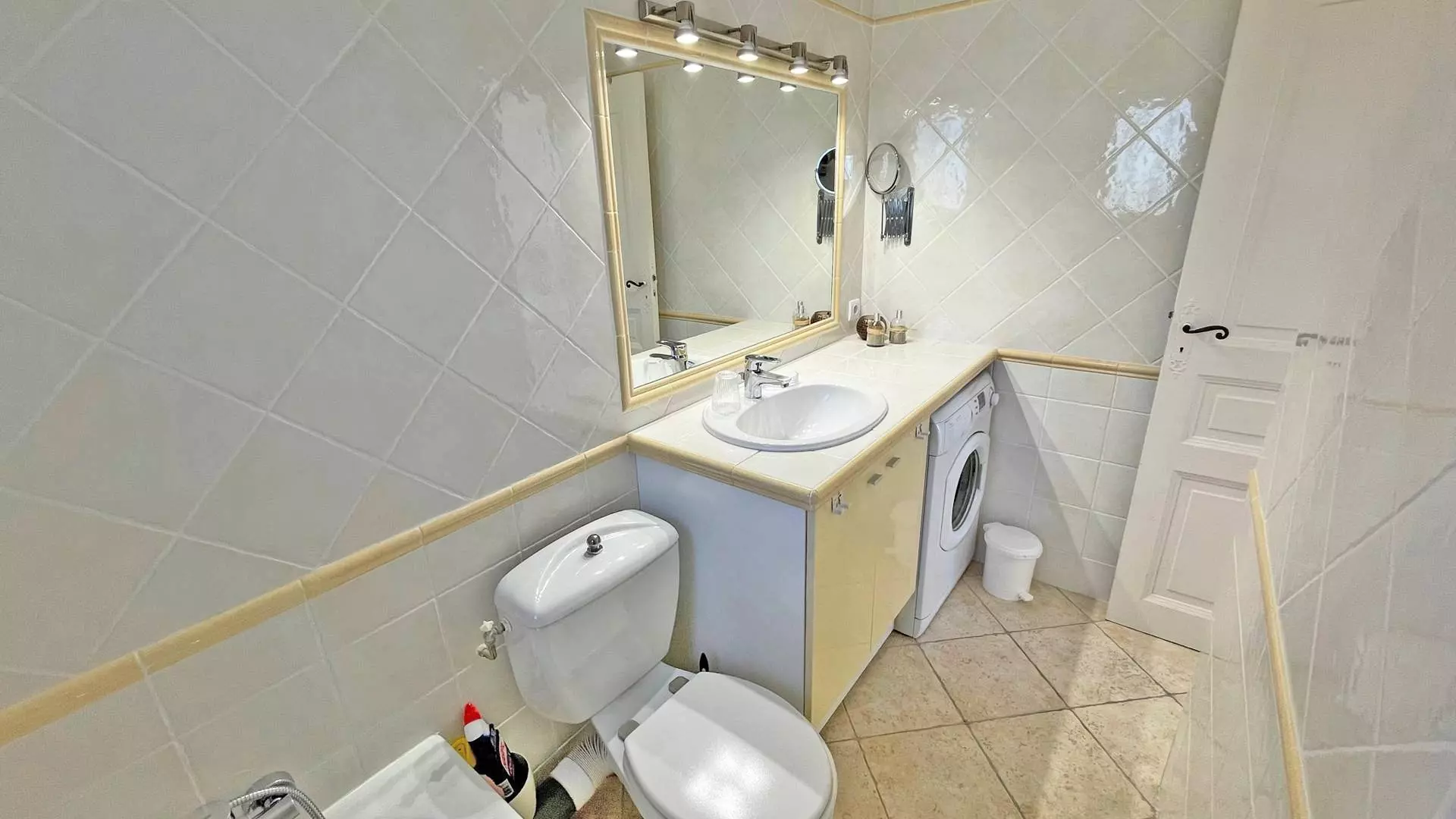 - Bathroom with vanity unit, bathtub, toilet and washing machine