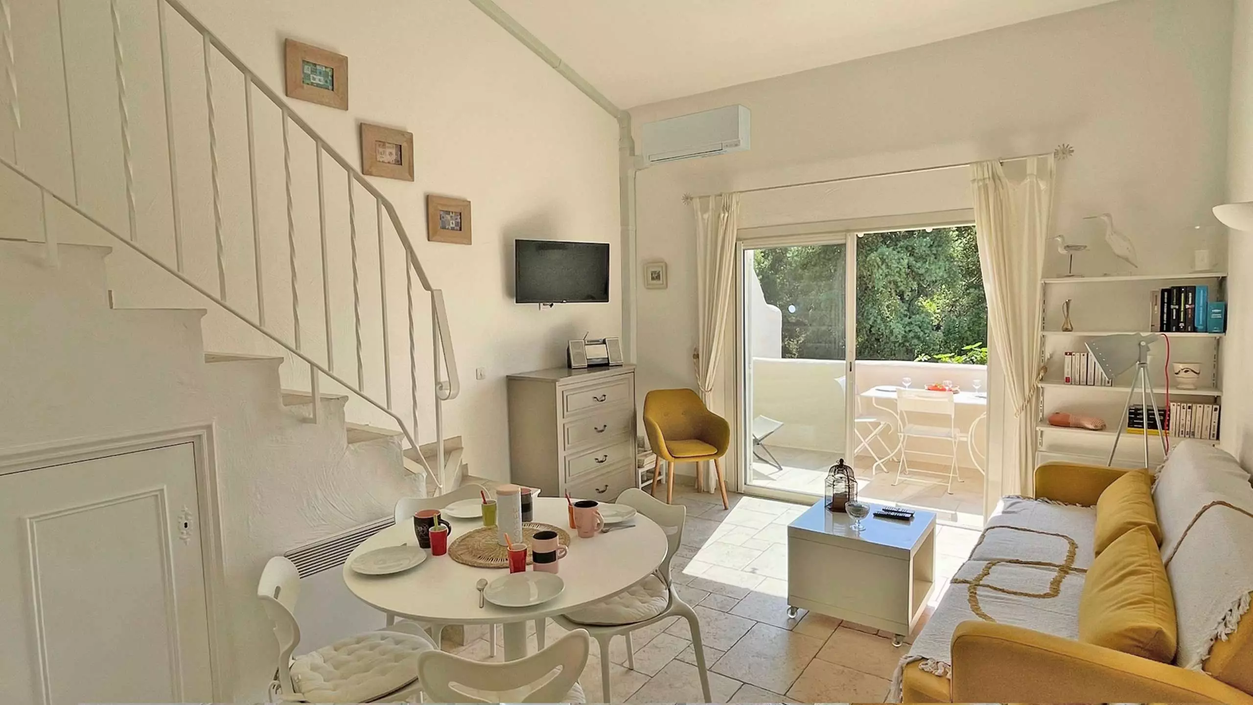 - Air-conditioned living room with sofa, armchairs and flat-screen television, 80cm single foldaway bed (chest of drawers under the television) terrace access