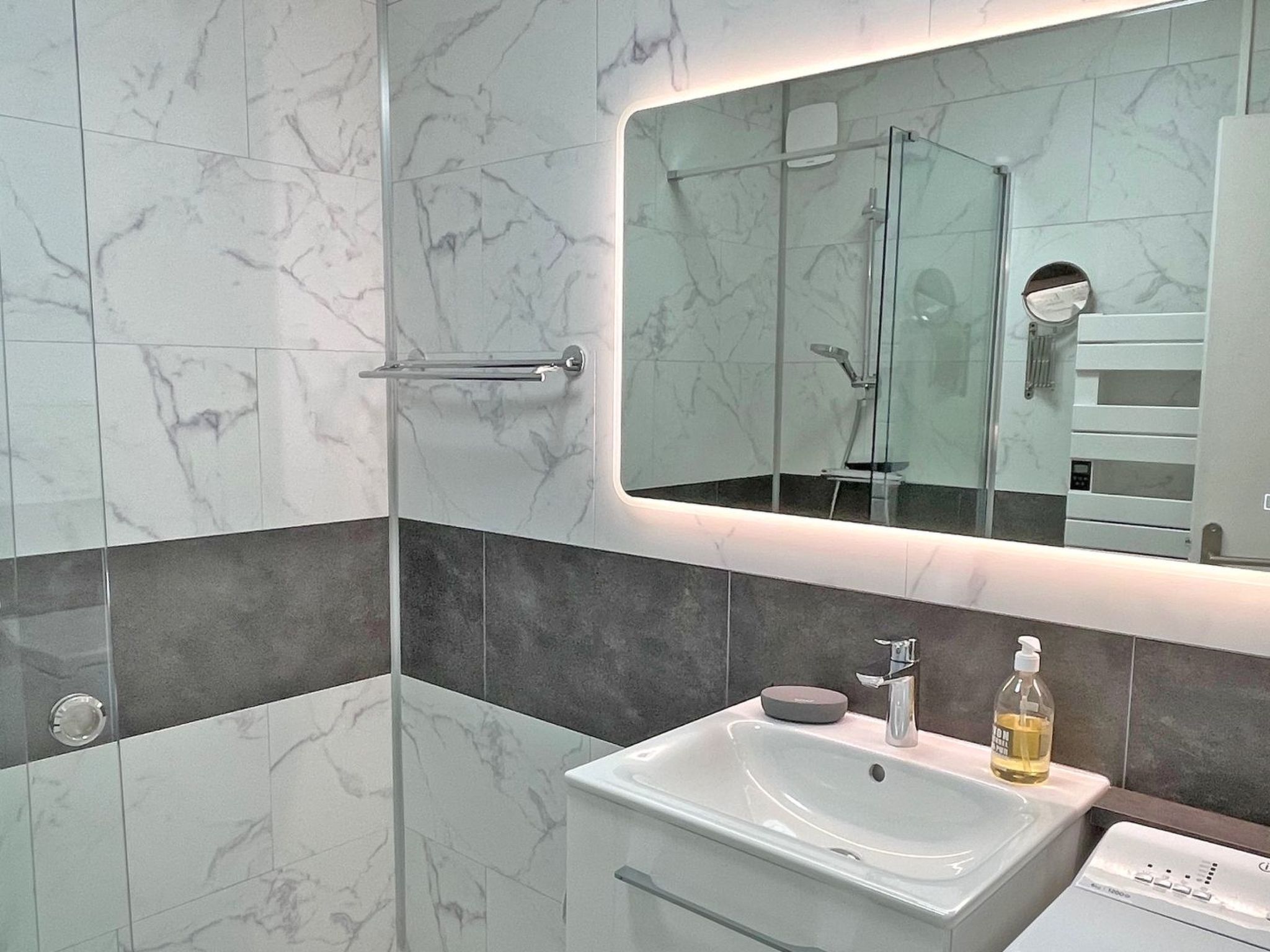 - Bathroom with walk-in shower, vanity unit, heated towel rail and washing machine