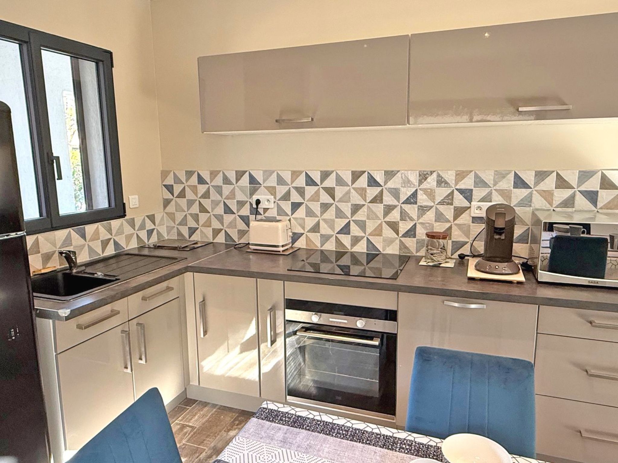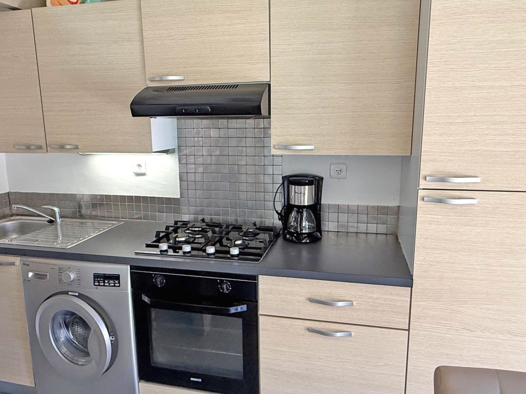 - Open-plan fitted kitchen with oven, gas hob, fridge with freezer, Senseo coffee machine, traditional coffee machine, crockery and cutlery.