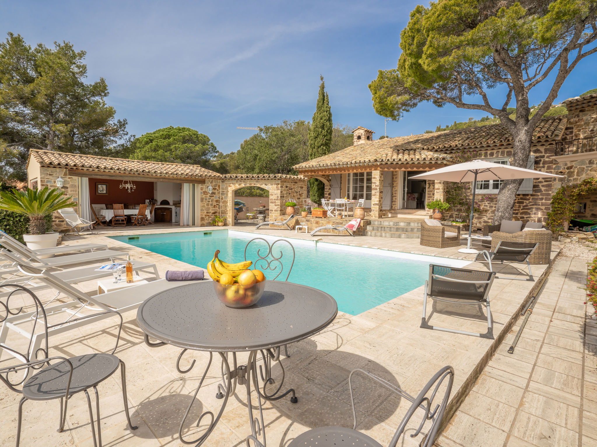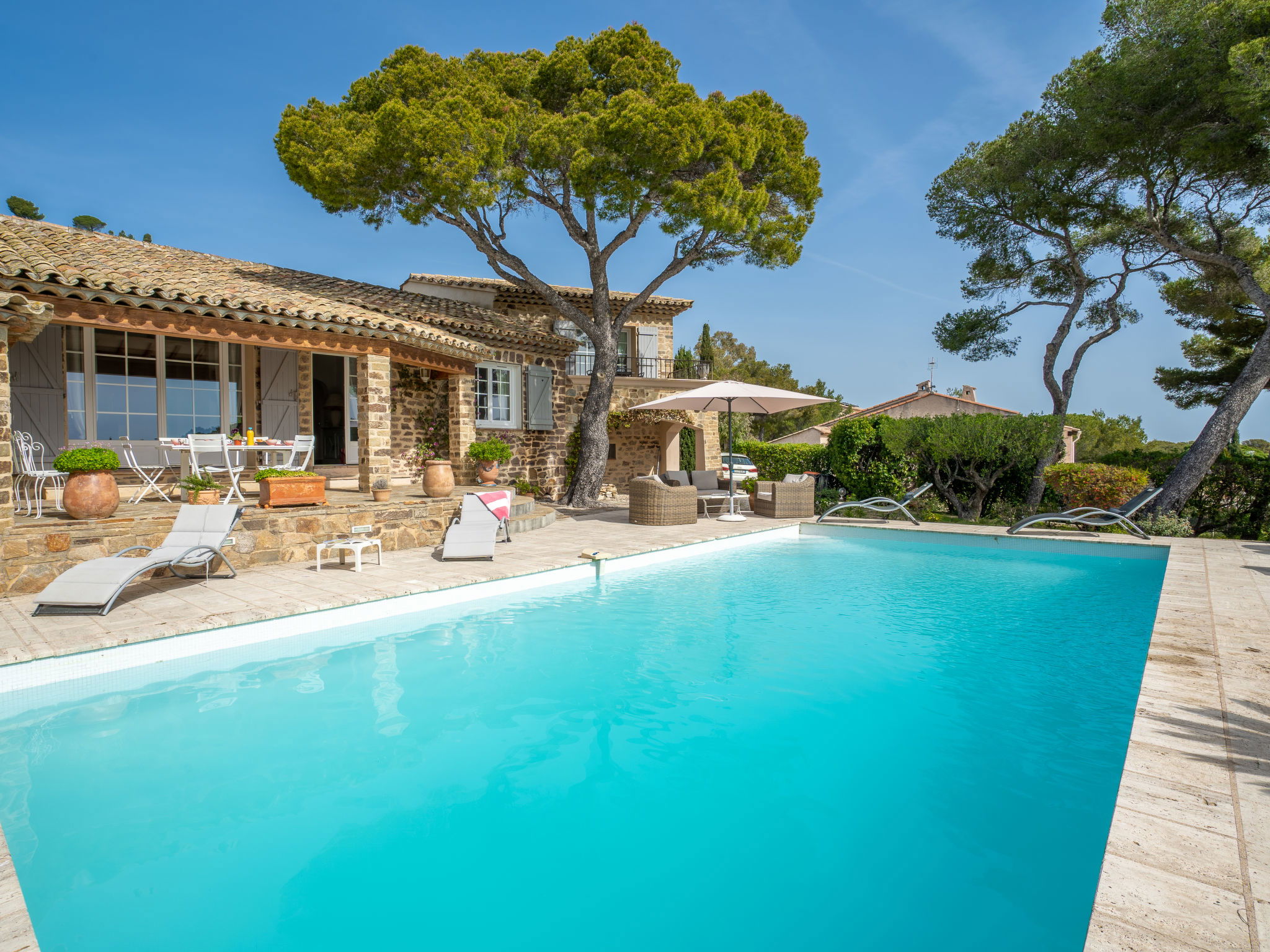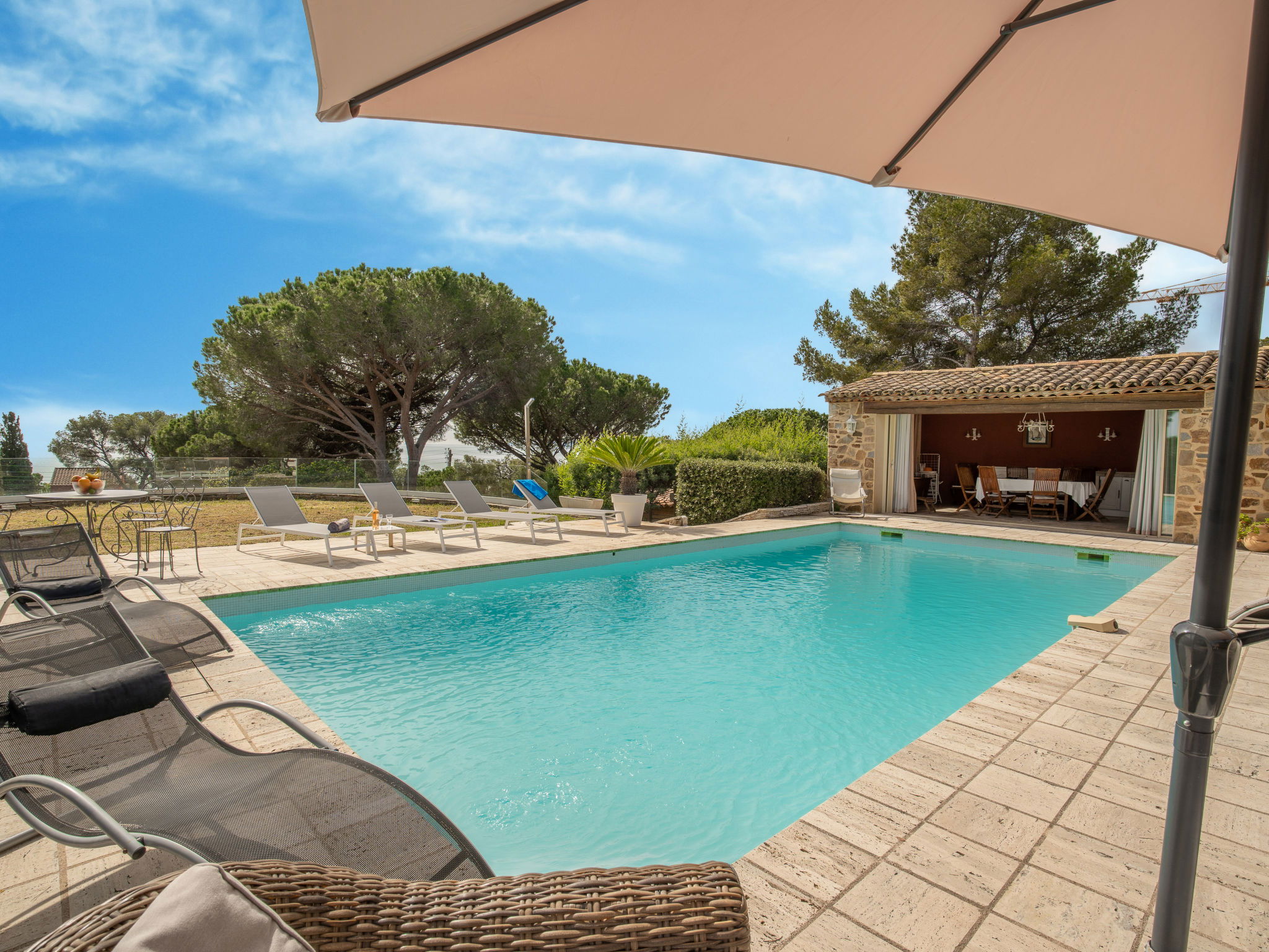 Very beautiful single-family house "La Crischona". 2 km from the centre of Les Issambres, 10 km from the centre of Sainte Maxime, 45 km from the centre of Cannes, in the residential district, 300 m from the sea, 300 m from the beach. Private: property 2'400 m2 (fenced), well-kept garden, swimming pool (10 x 5 m, depth 50 - 270 cm, seasonal availability: 01.Jan. - 31.Dec.) with alarm system and salt-electrolysis pool-cleaning system. WC in the pool area, outdoor shower, pool house with fridge, parking on the premises. Carport. Shop 2 km, sandy beach, rocky beach 300 m. As part of the water restriction measures linked to the drought in certain French areas, please note that the swimming pool may be closed until the lifting of the legal restrictions authorizing again the filling and the top-up in water from all swimming pools and basins for private use. Here you will find all the official information on the measures to limit or suspend the use of water in France : Propluvia - Accueil (developpement-durable.gouv.fr).