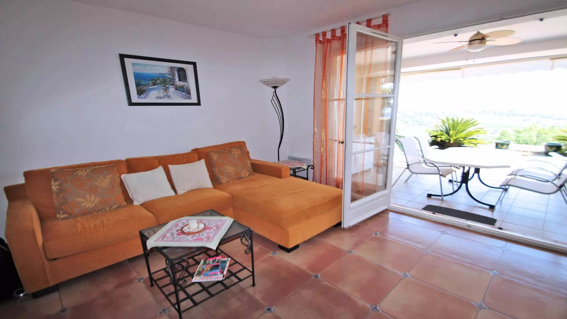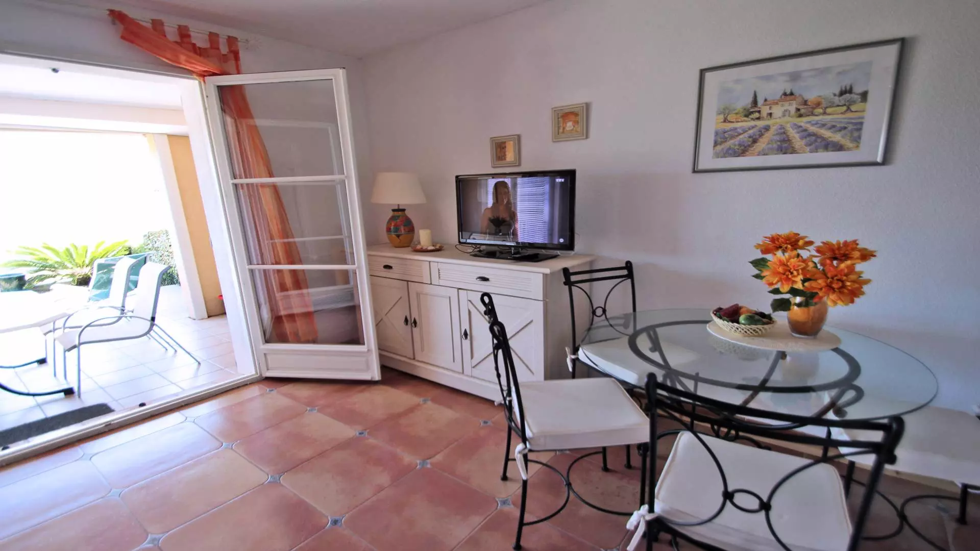 - Living room with TV lounge area, sofa and coffee table and dining area for 4 people then outside access