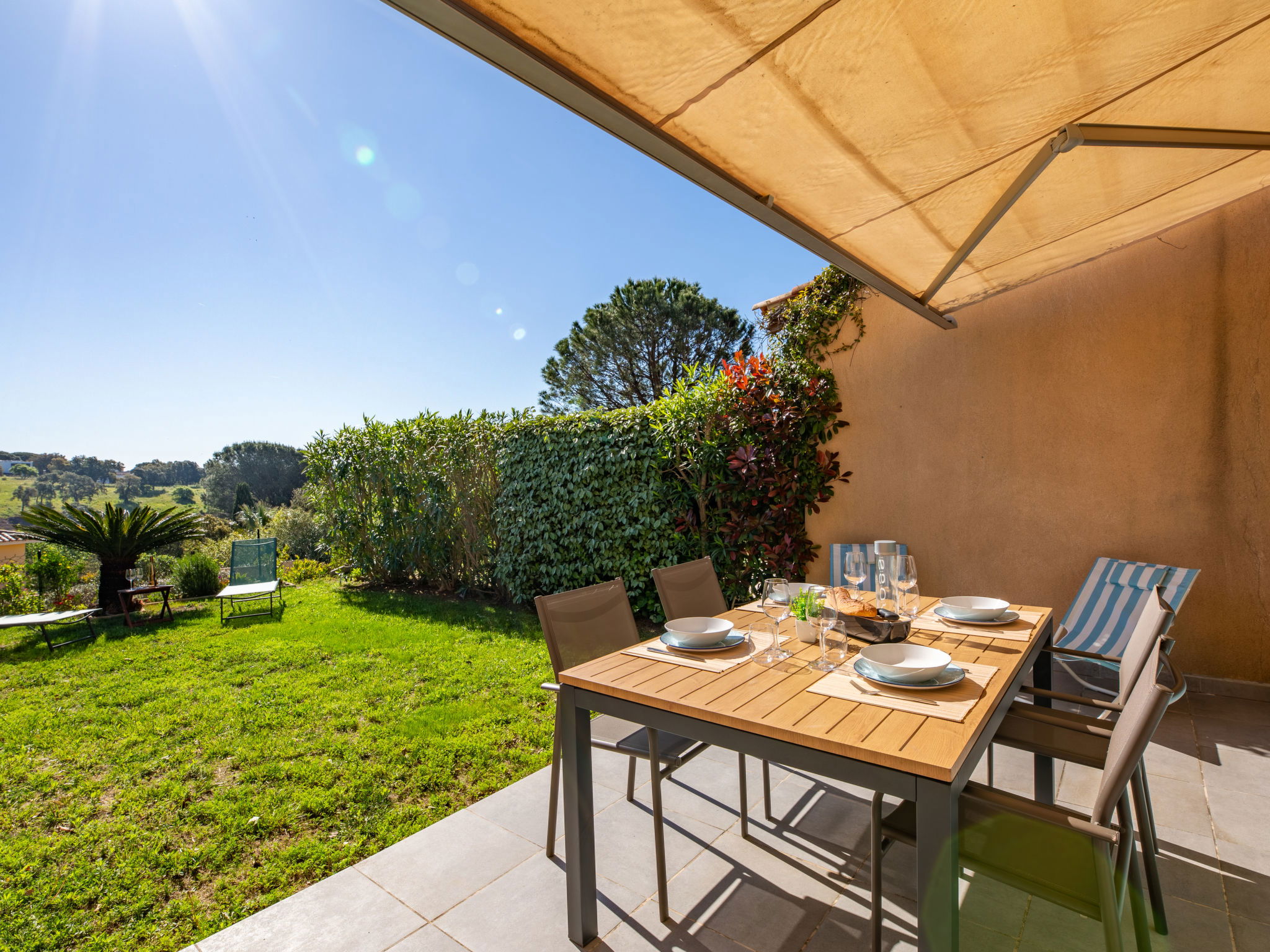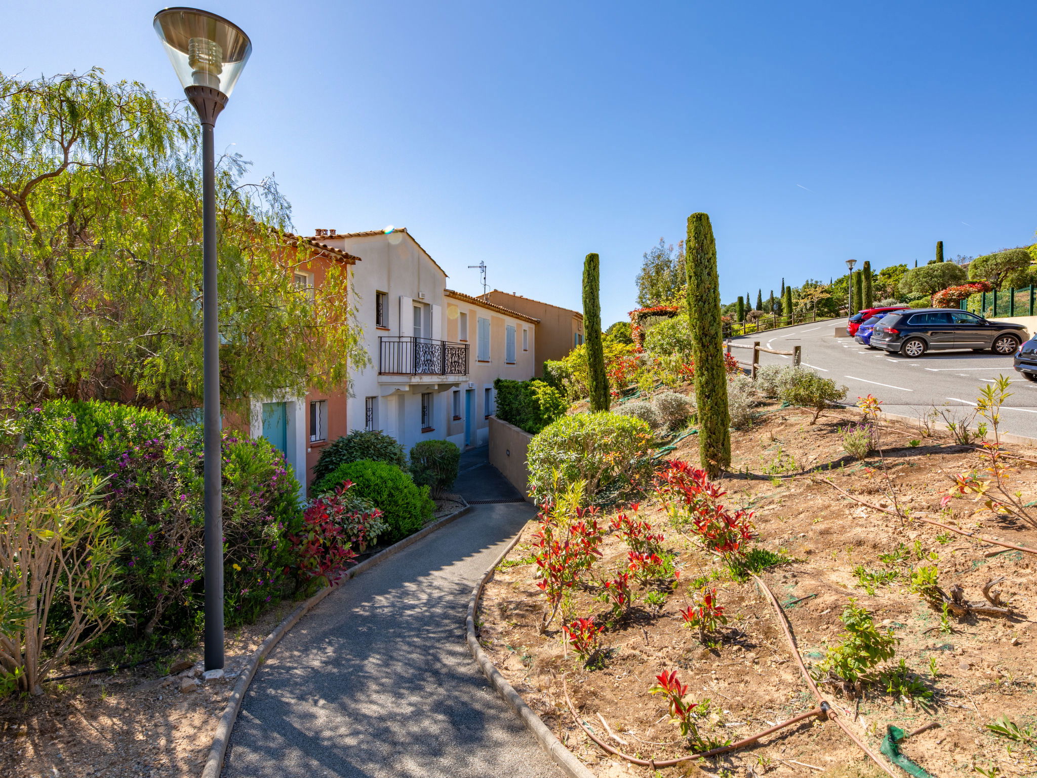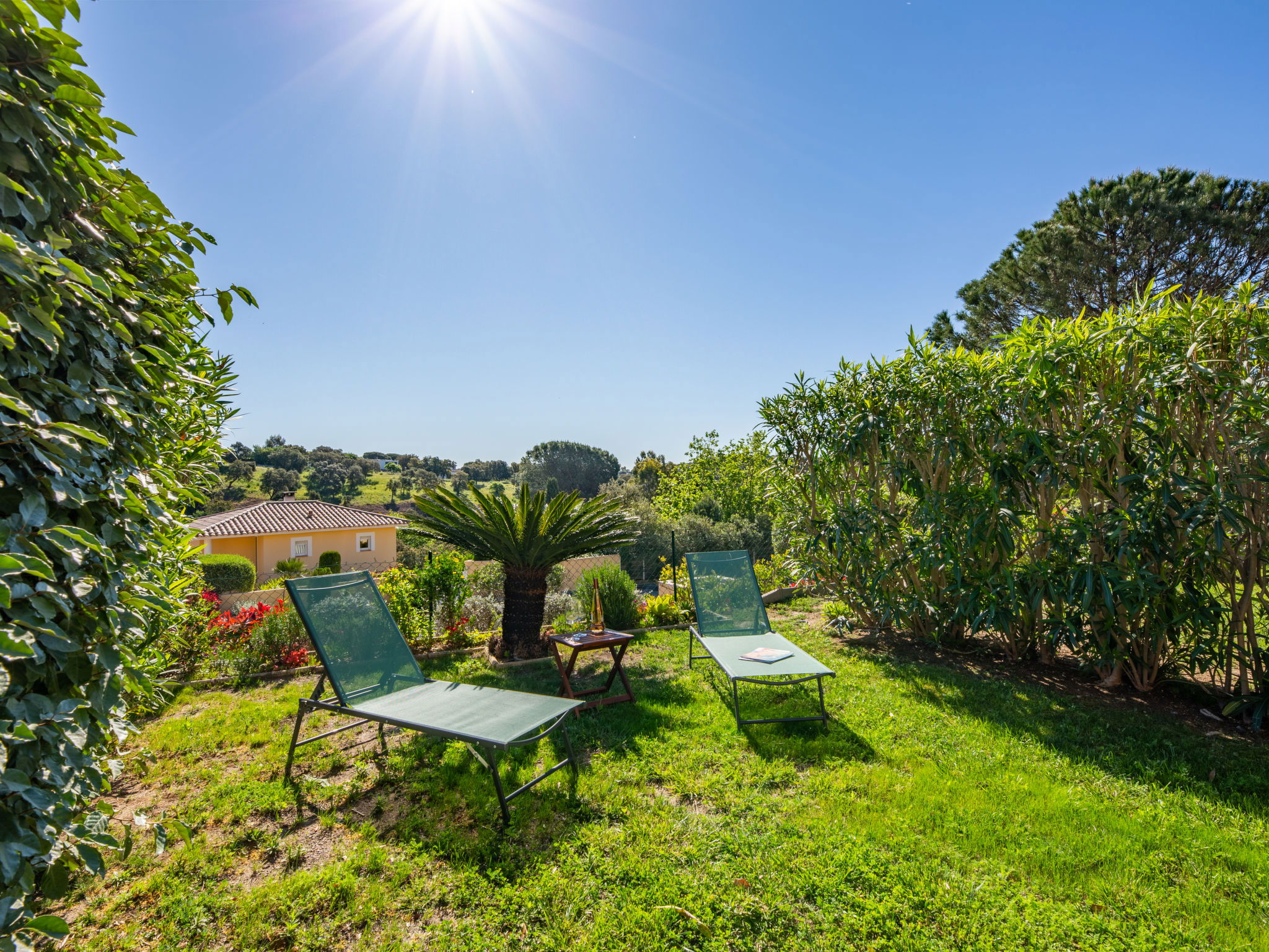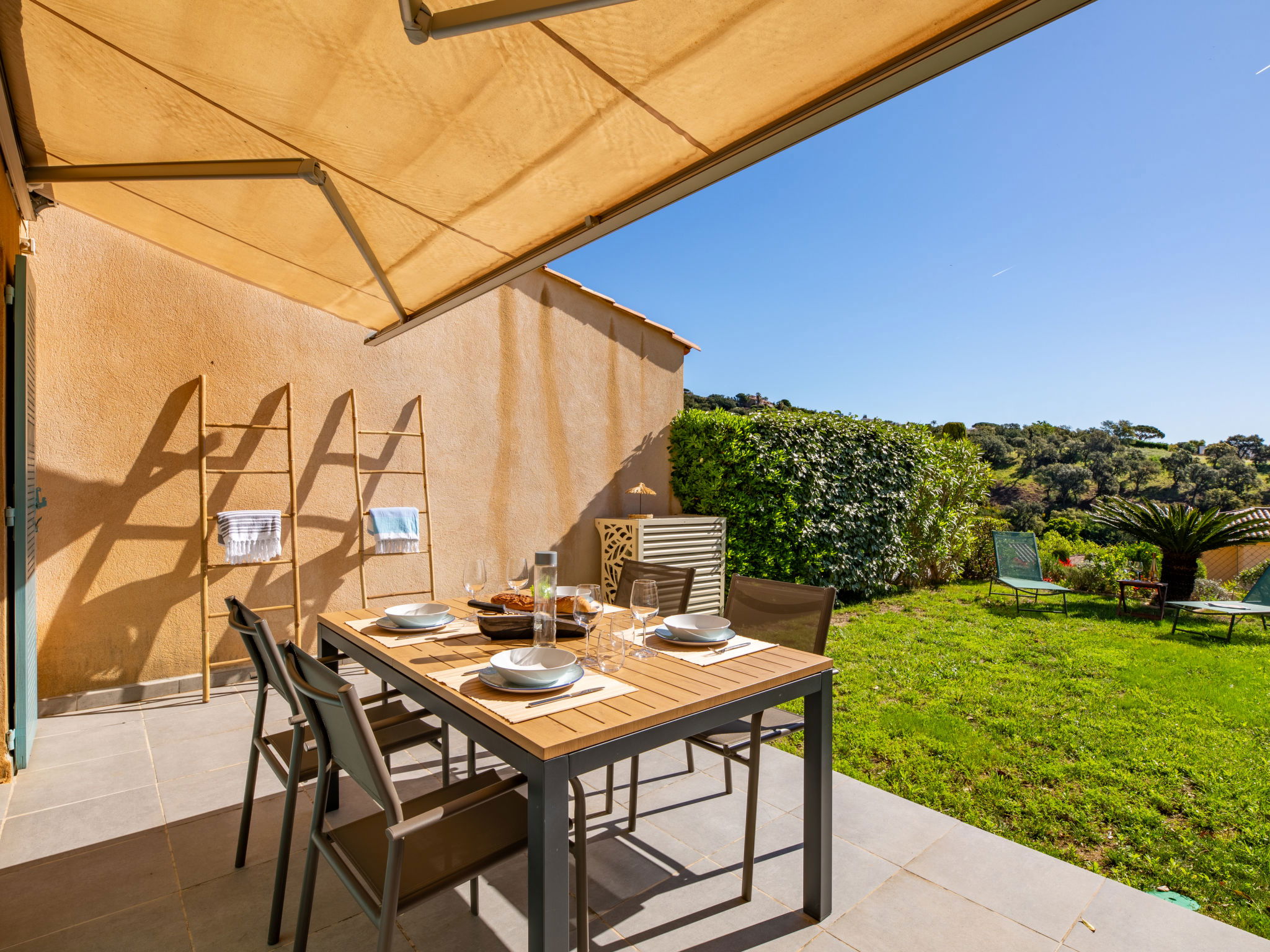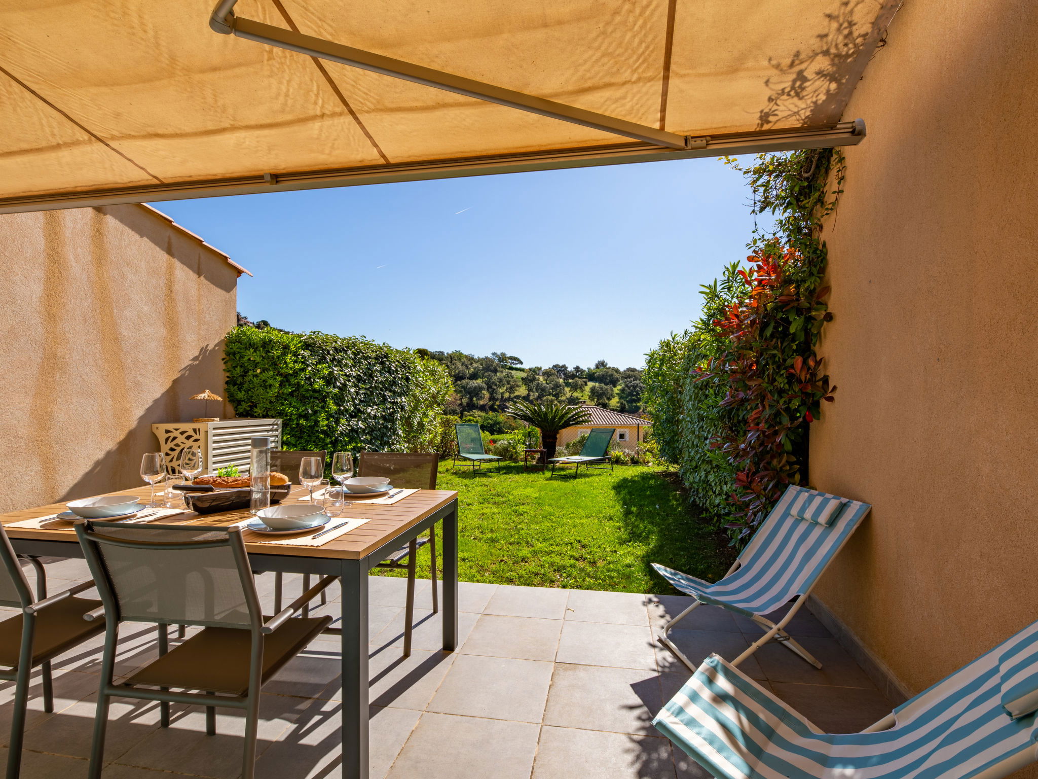 Residence "Les Coralines". Outside the resort, 2.7 km from the centre of Les Issambres, 1.7 km from the sea, 1.7 km from the beach, in a cul-de-sac, in the countryside. For shared use: swimming pool fenced (seasonal availability: 01.Jun. - 30.Sep.). Parking. Shop 2 km, supermarket 2 km, restaurant 2 km, bar 2 km, bakery 2.7 km, 35 minute walk to the centre, bus stop "Plage de la Garonnette" 1.9 km, railway station "Saint-Raphael TGV" 20 km, sandy beach "La Garonnette" 1.7 km, thermal baths "Thalasso Les Issambres" 2.6 km. Sports harbour 2 km, golf course (18 hole) 8 km. Nearby attractions: Aqualand waterpark 9 km, Azur Park attractions 20 km, Saint-Tropez/Ramatuelle 22 km, Port-Grimaud 18 km, Navette / shuttle boat St-Tropez 15min 2 km, Gorges du Verdon 100 km. Hiking paths: Massif des Maures 14 km, Massif de l'Esterel 33 km. Please note: car recommended. Residence with electric gates. The keys‘ handover takes place by the agency in Sainte-Maxime, 7 km. Airfield 73 km from the property. Neighbourhood highly sensitive to noise. Quietness and good behaviour expected.